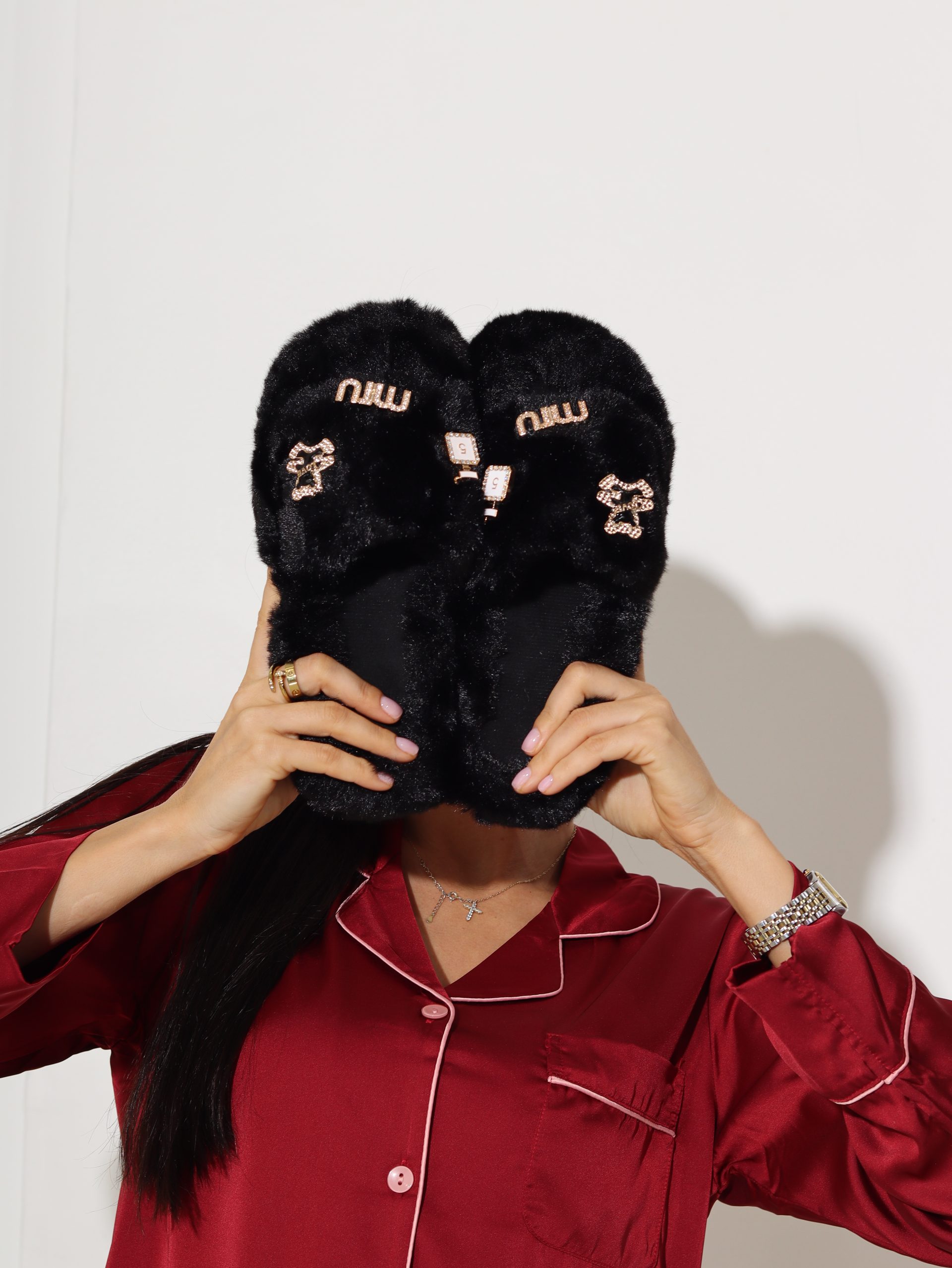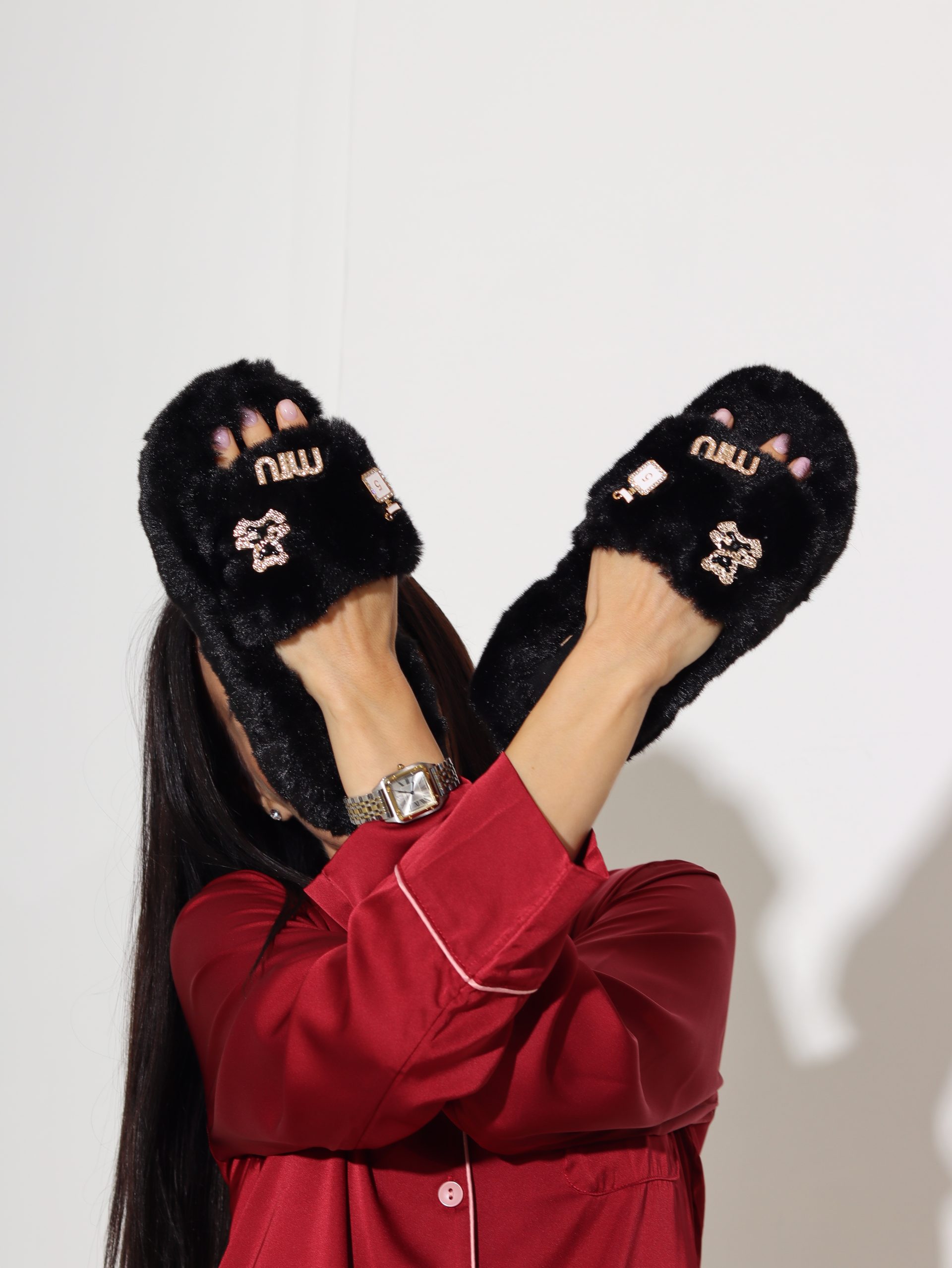 Pūkainas, vienkrāsainas čības ar vaļēju purngalu un mīkstu, ērtu iekšpēdiņu, paaugstināta zoles daļa un priekšpusē 3 zelta krāsas akcentējosi dekoriņi