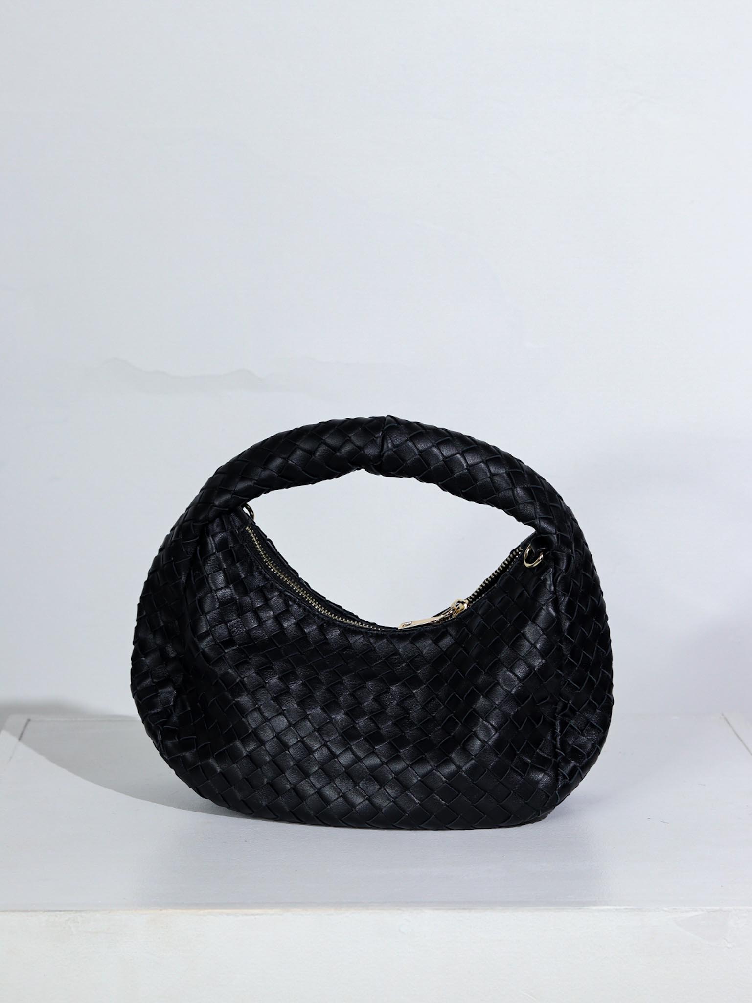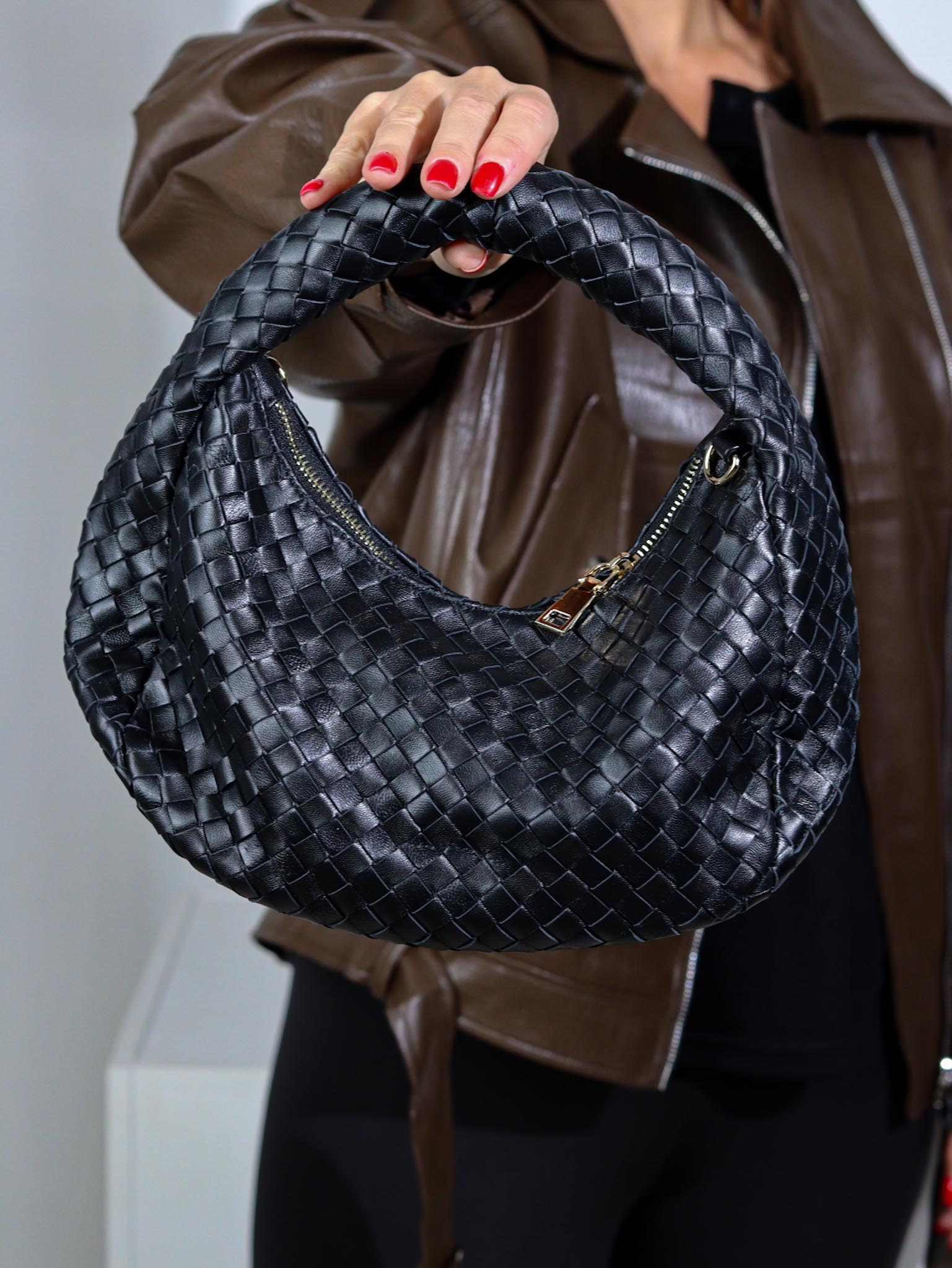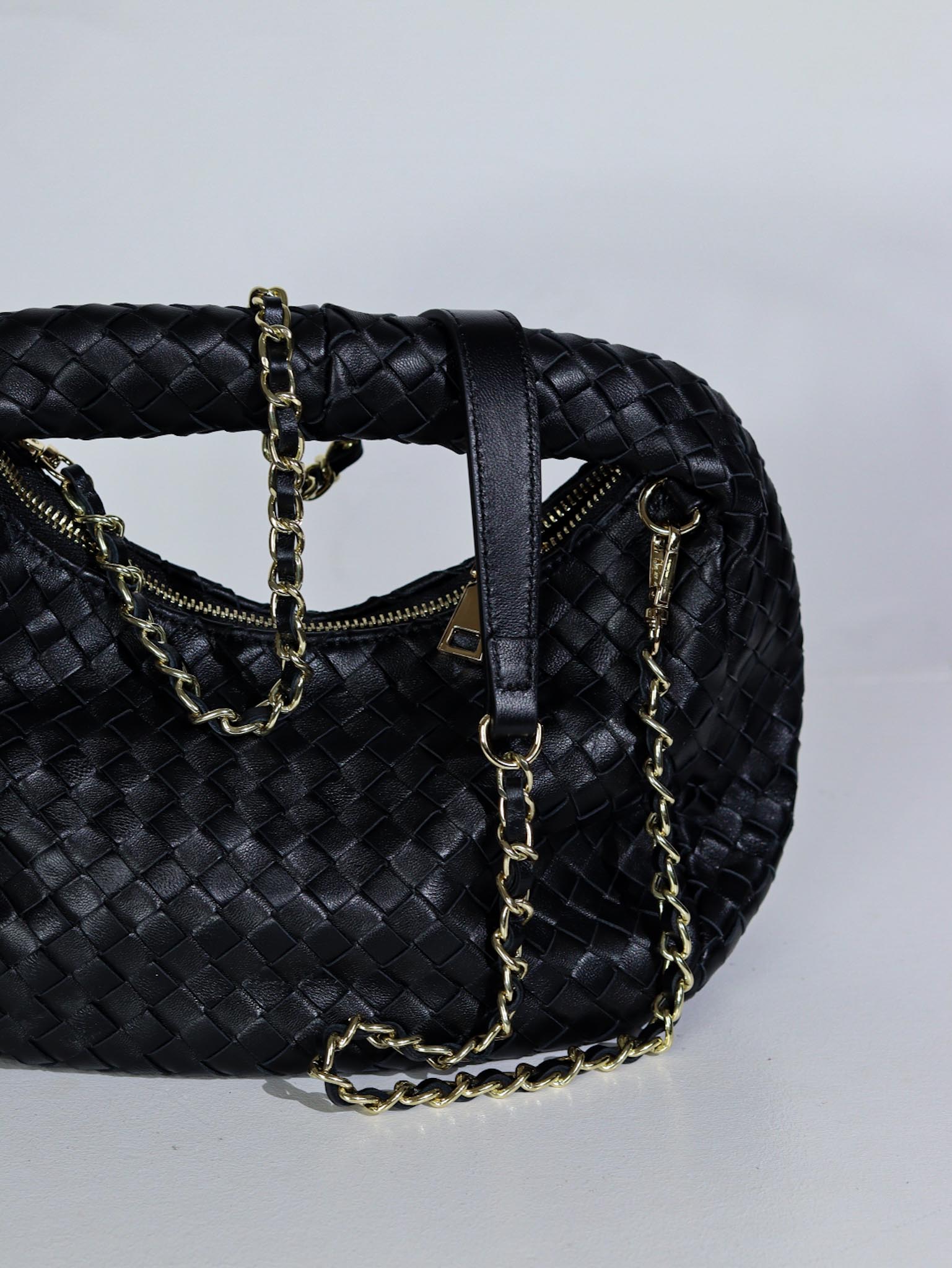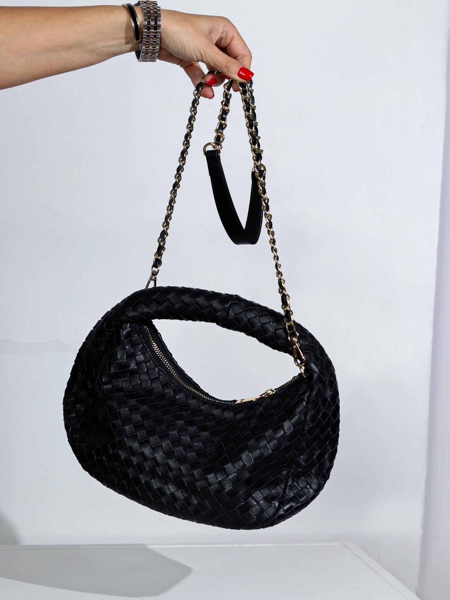 Melnas krāsas, mini soma no d/a ādas ar pītu virsmu. Soma ir aizverama ar iestrādātu rāvējslēdzēju un somai ir arī garā lence ar zelta firnitūras ķēdi.