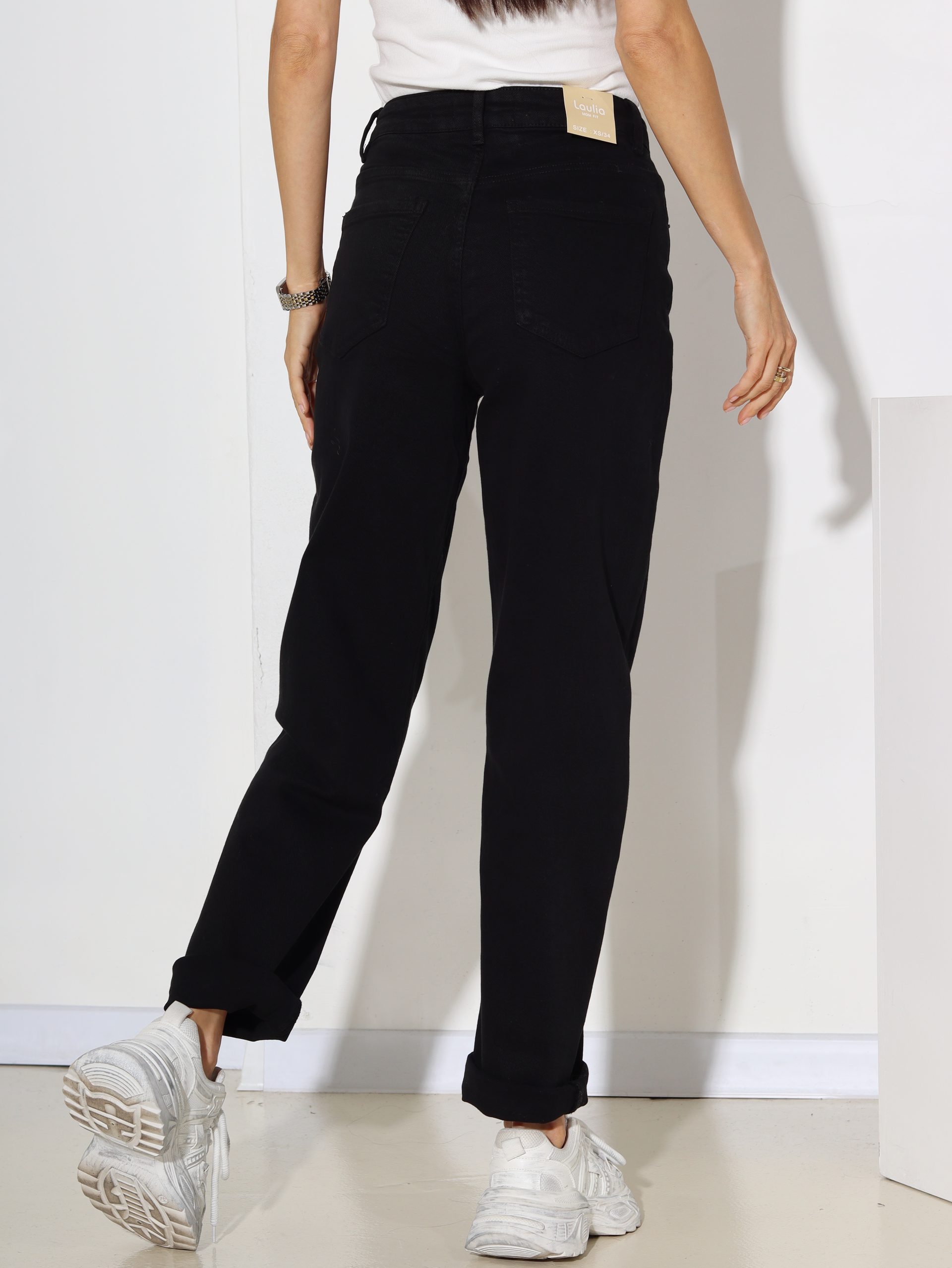 Melnas  krāsas džinsa bikses Laulijas firmas ,,Mom Fit” modeļa bikses, biksēm ir paaugstināta jostas vieta, kabatas un rāvējslēdzēja aizdare.