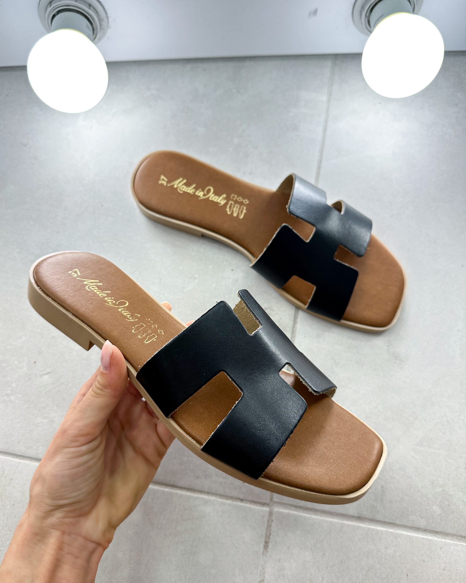 Vasaras apavi ar mīkstu iekšpēdiņu. Iekšpēdiņa ir brūnā krāsa, augšdaļa ir no melnas krāsas ādas materiāla. Apvi ir uz mazu paēdīti.
