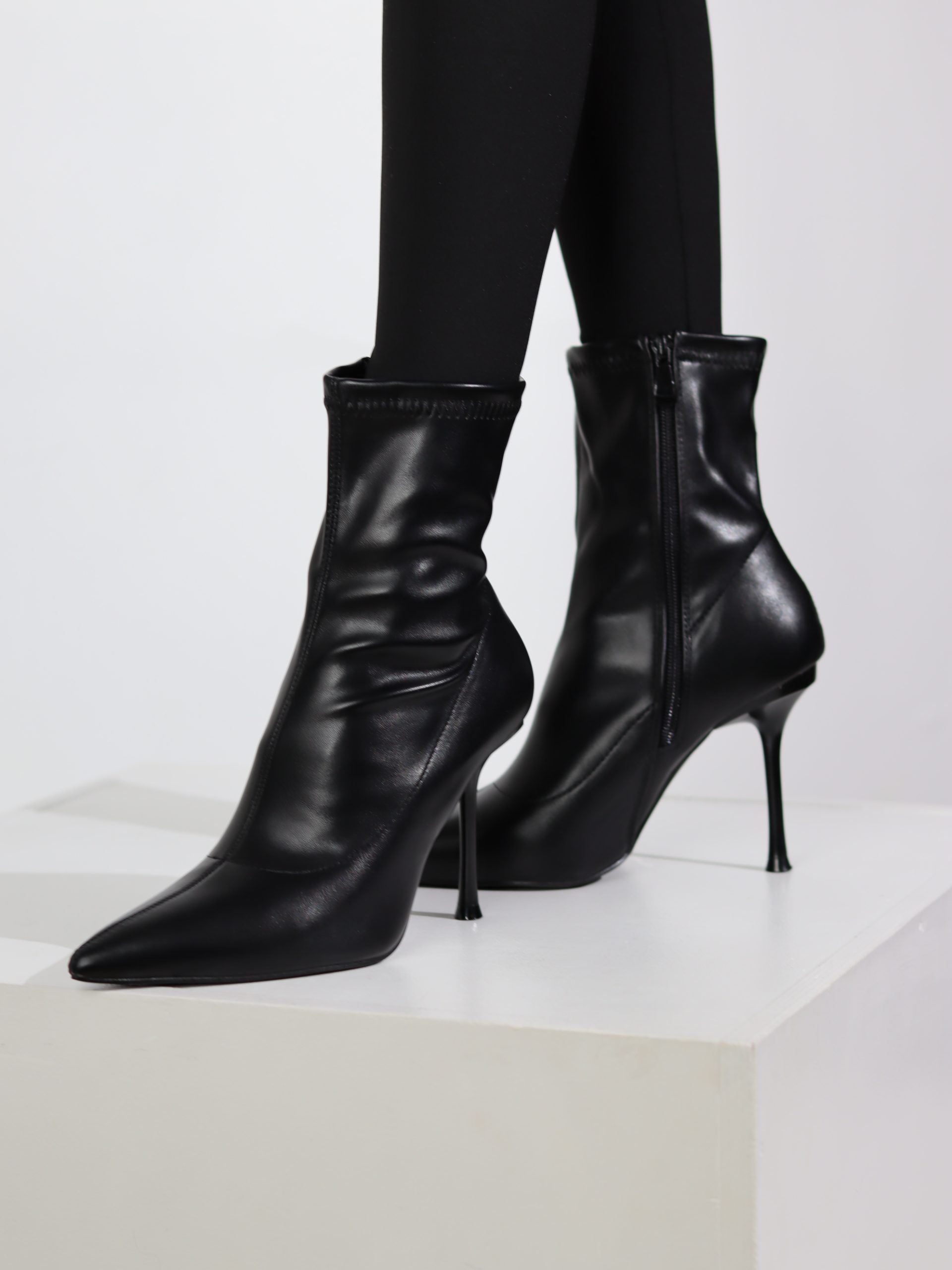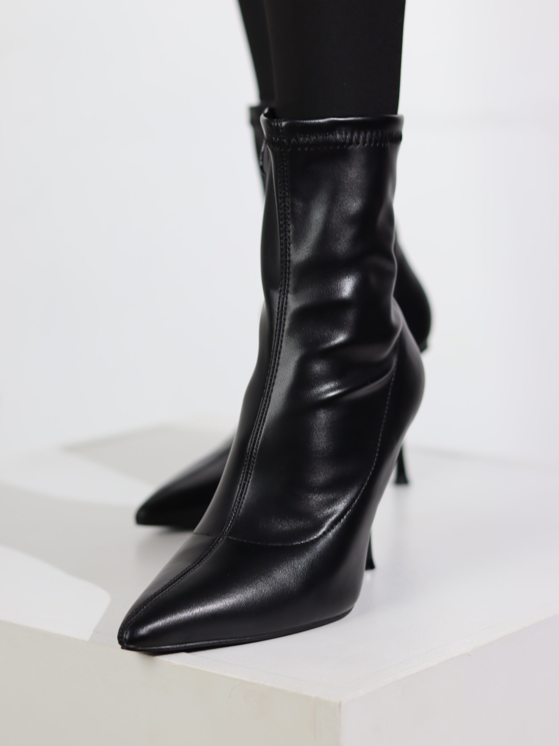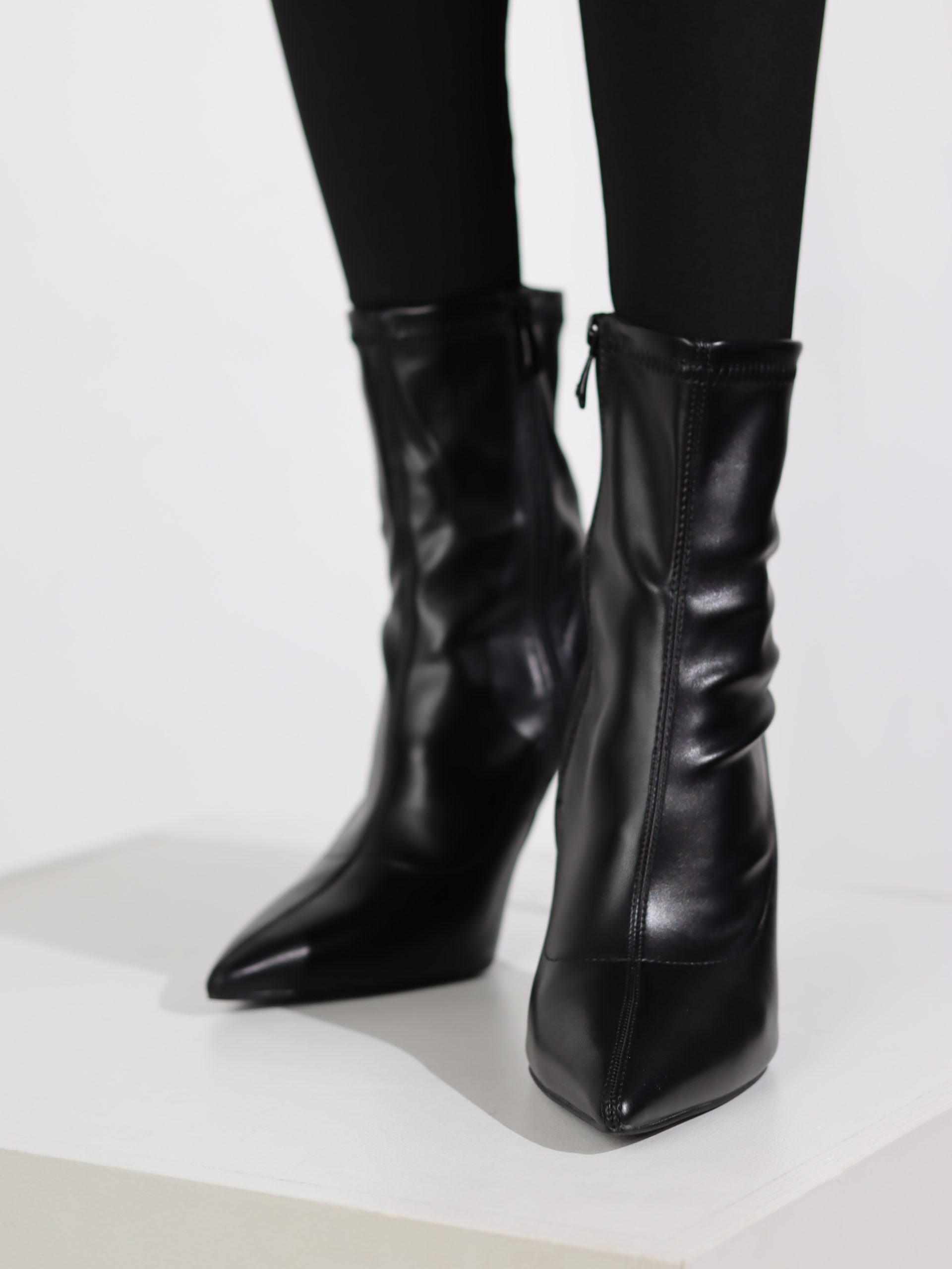 Melnas krāsas, m/ā zeķes stila zābaki, aizdare ar rāvējslēdzēju, smails purngals ar šuvi pa vidu un slaids, smalks papēdis
