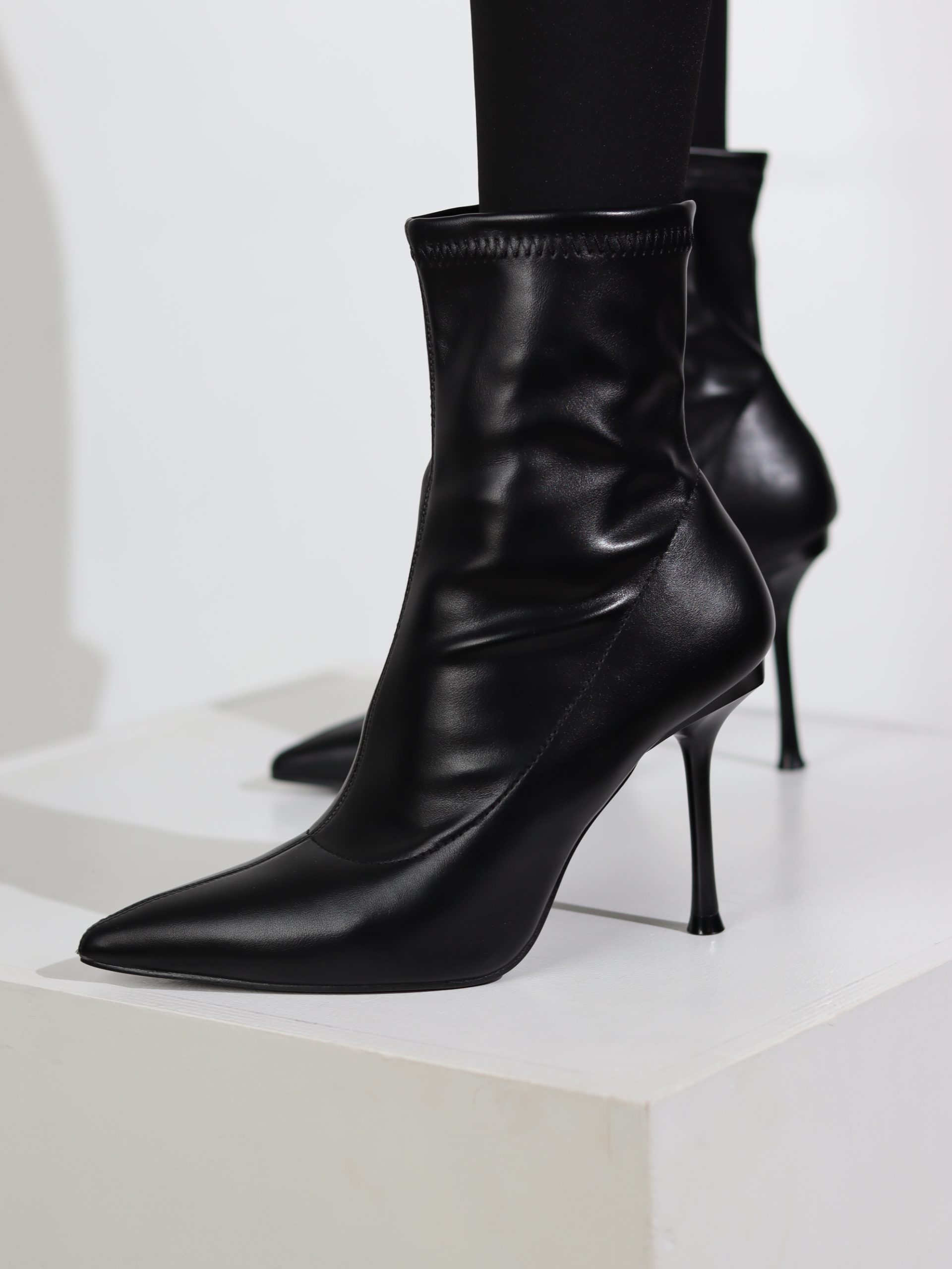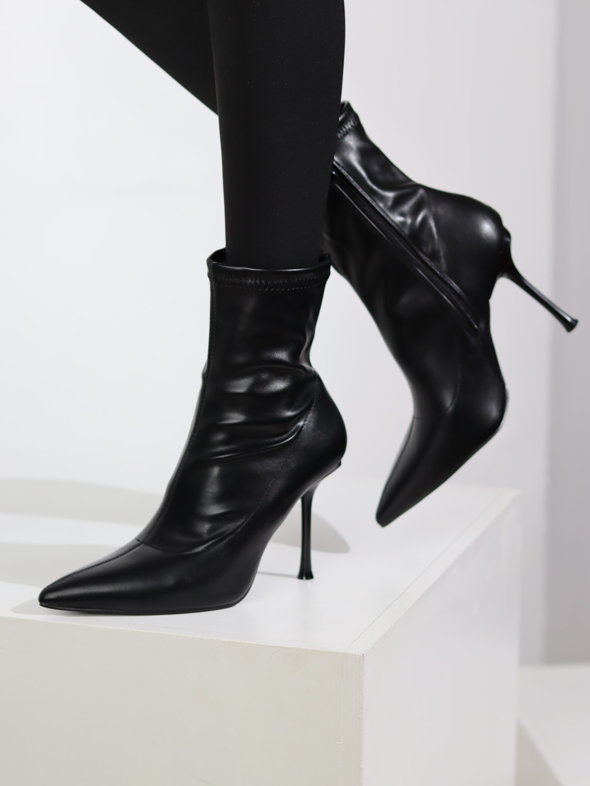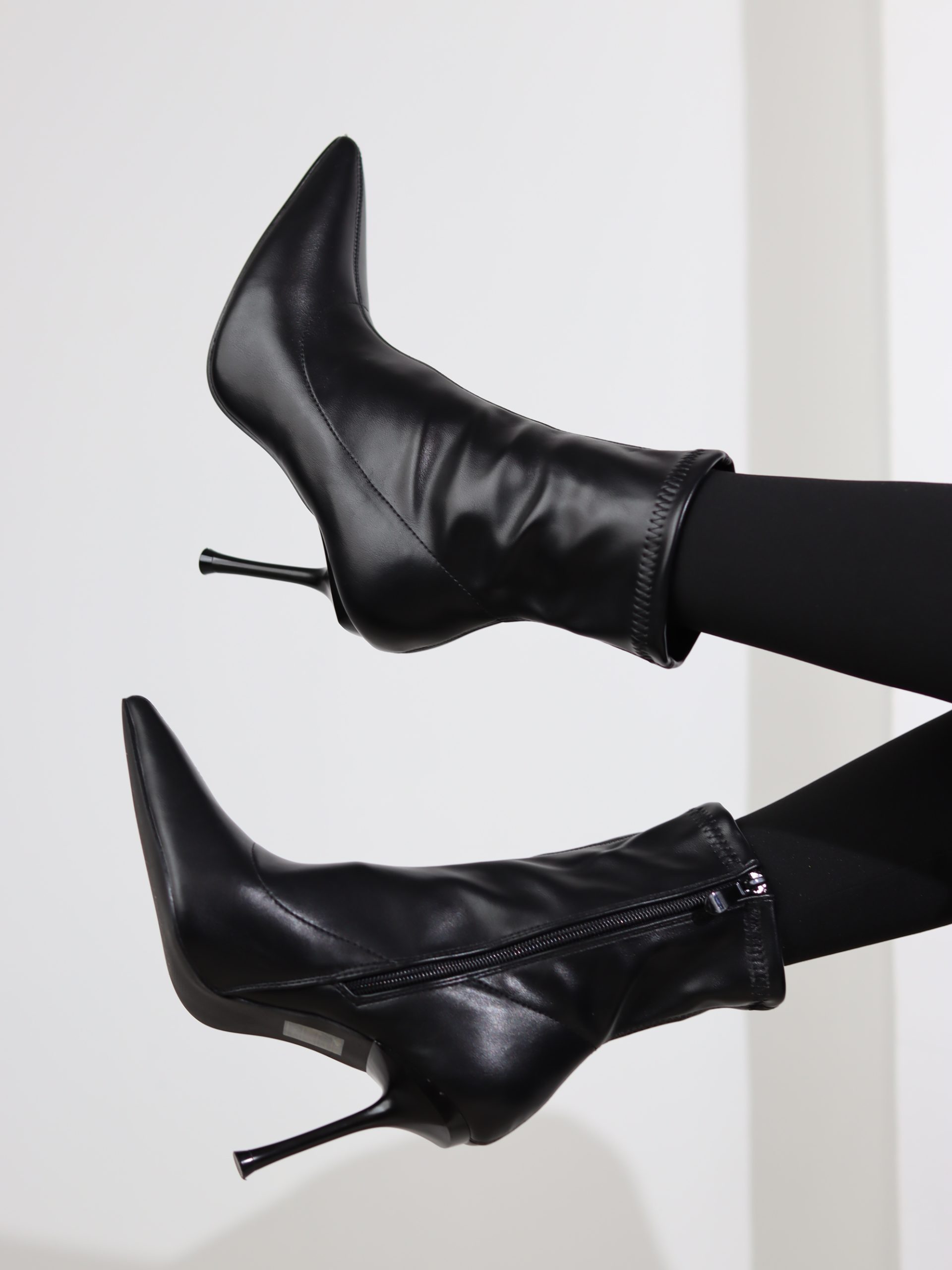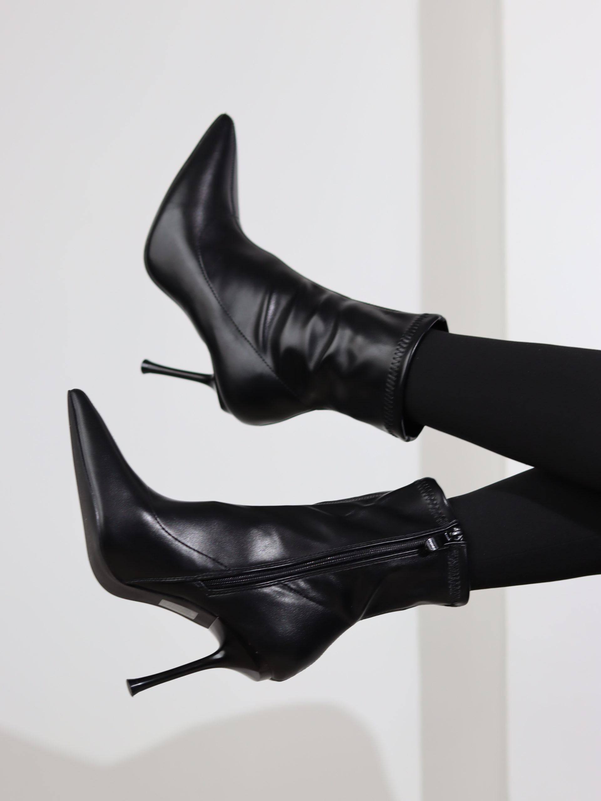Melnas krāsas, m/ā zeķes stila zābaki, aizdare ar rāvējslēdzēju, smails purngals ar šuvi pa vidu un slaids, smalks papēdis