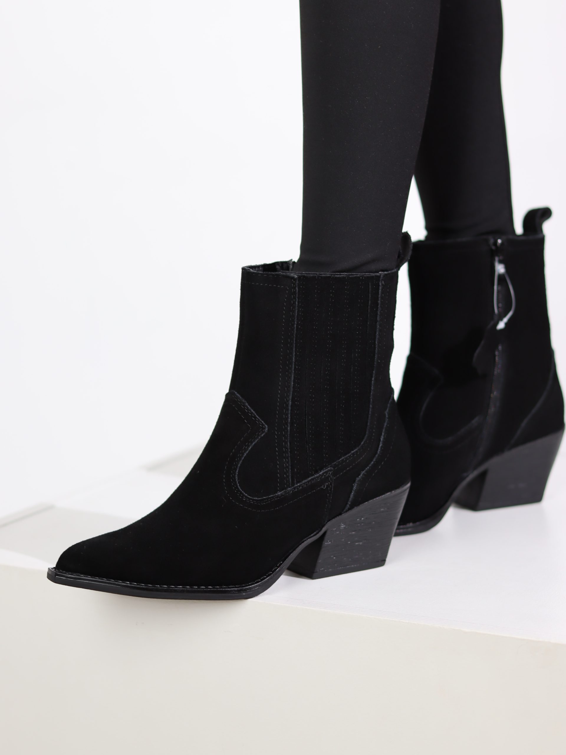 Melnas krāsas dabīgās zamšādas, īsi kovboju stila zābaki. Zābakiem ir iestrādāts pieskaņotas krāsa rāvējslēdzējs un ārmalā slēts gumijas ielaidums, smails purngals