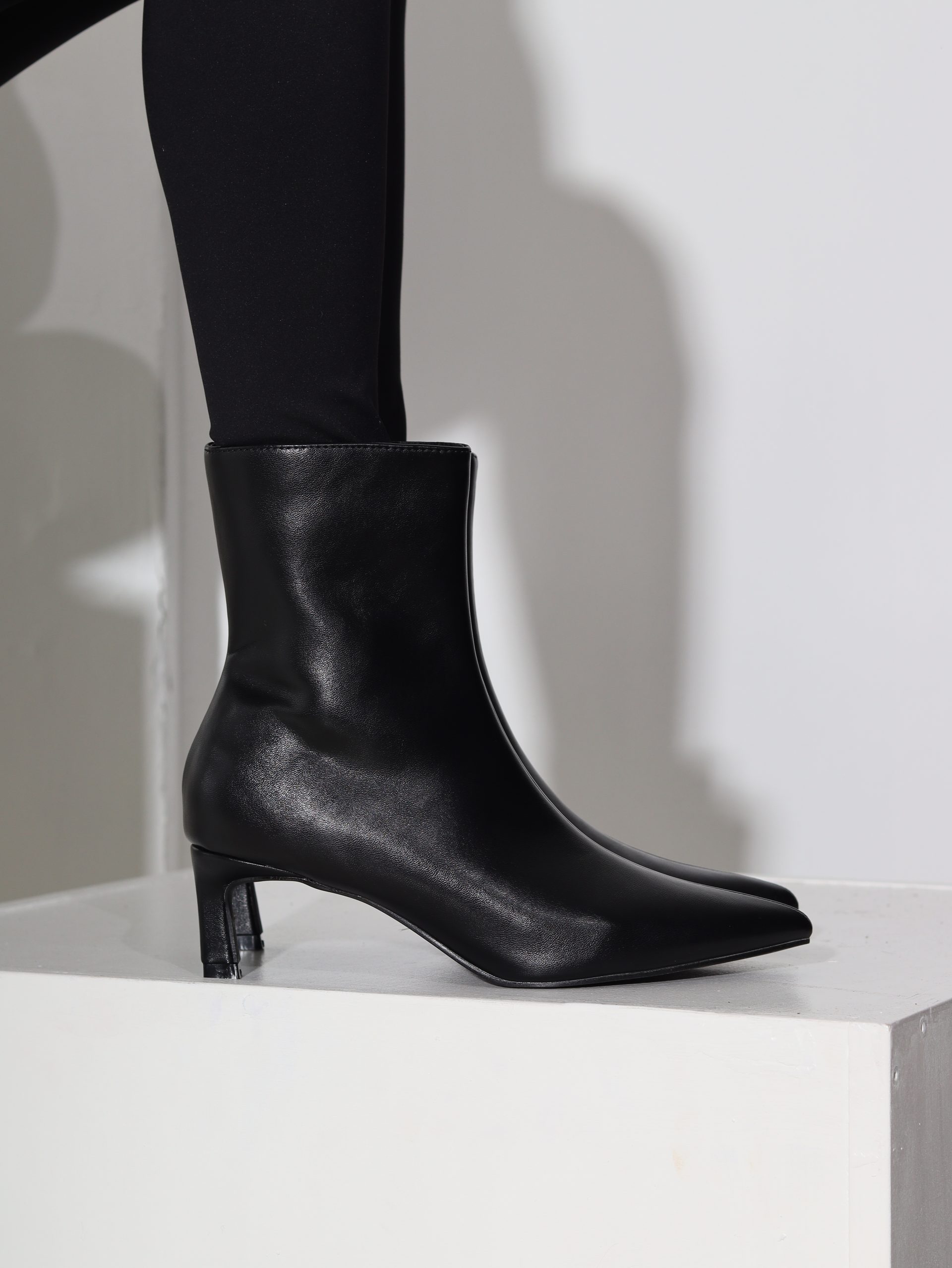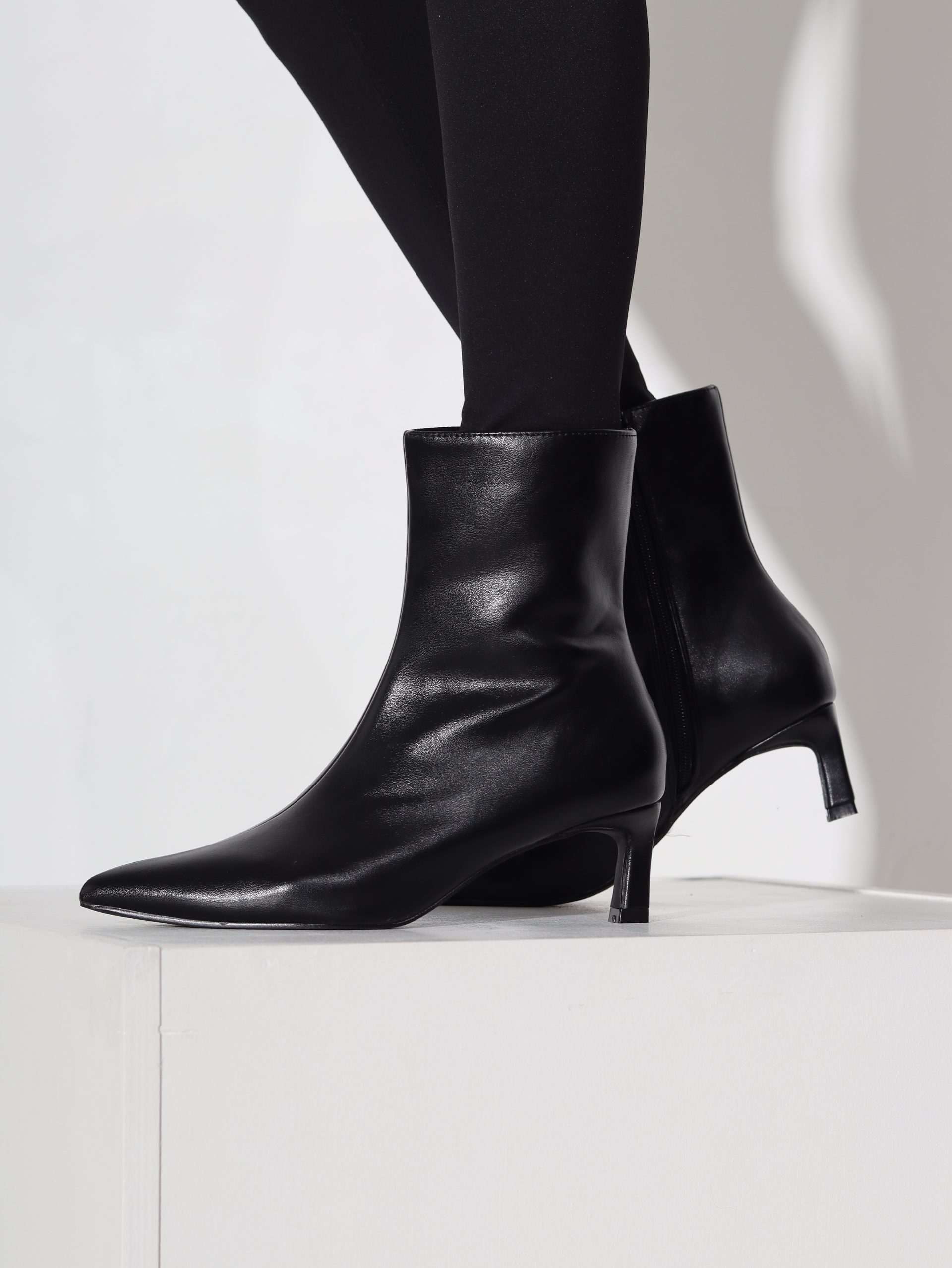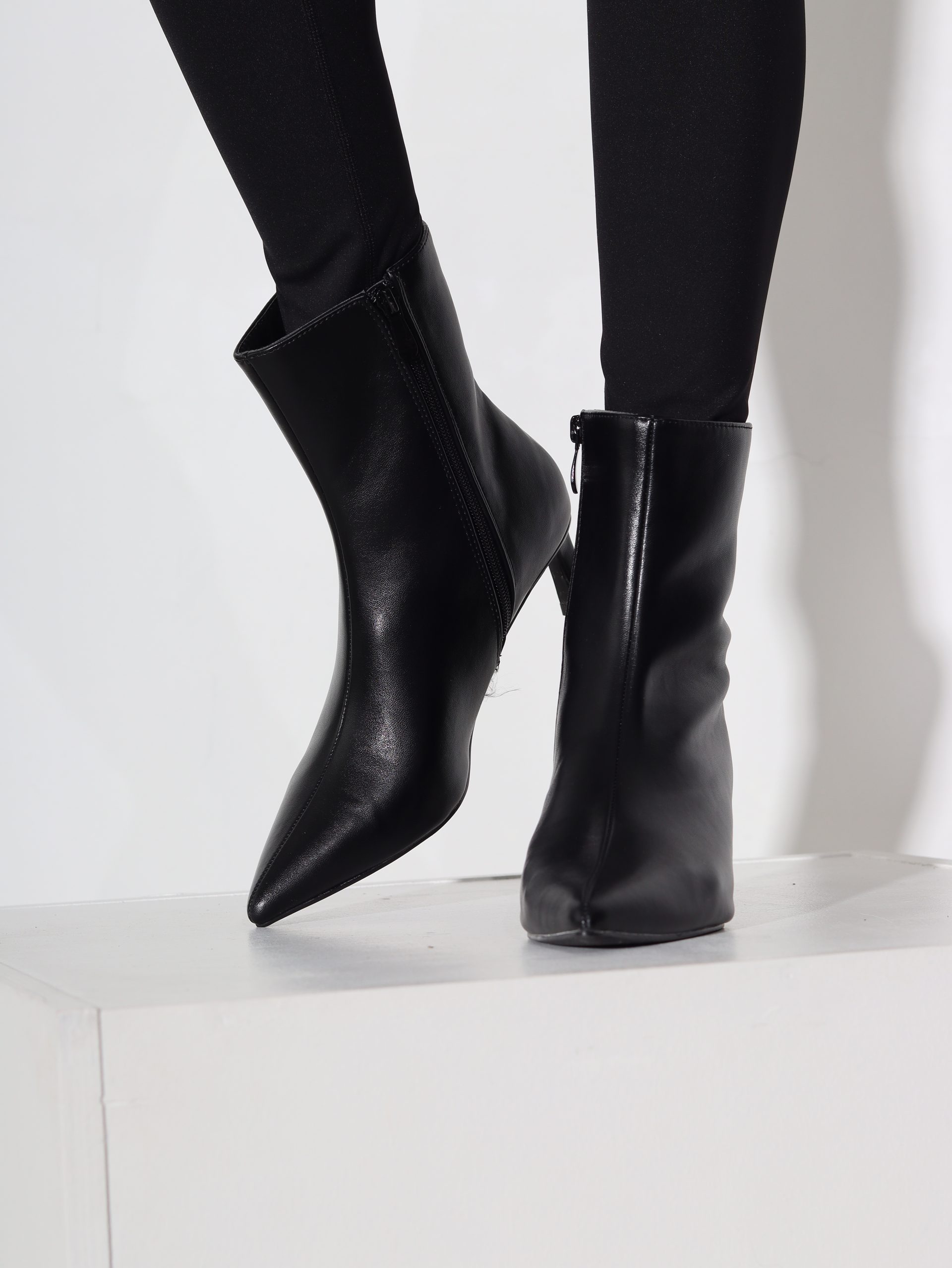 Melni īsie zābaki (pari potītei), iekšpusē melnas krāsas rāvējslēdzējs , smalks papēdis un spics purngals.