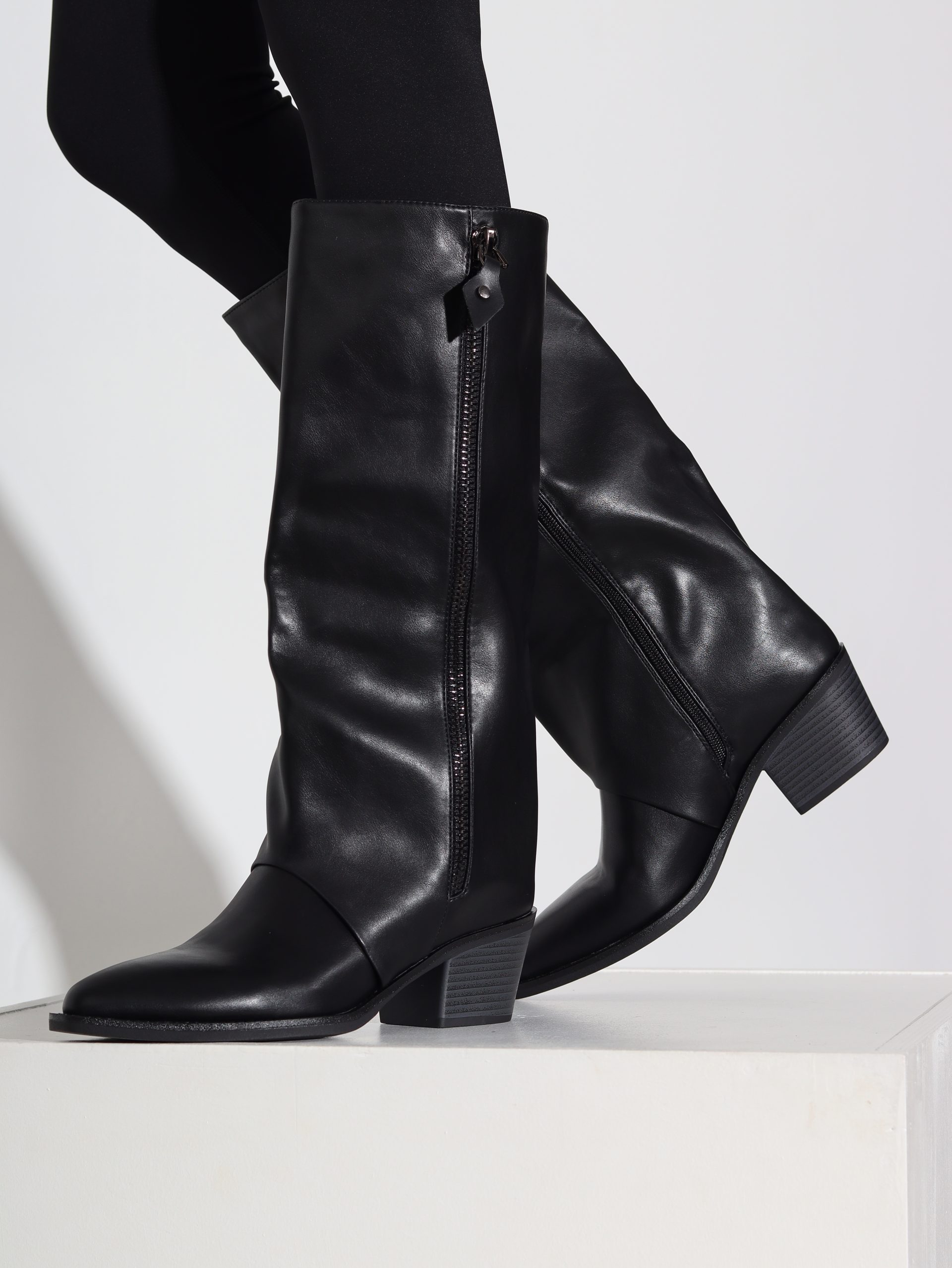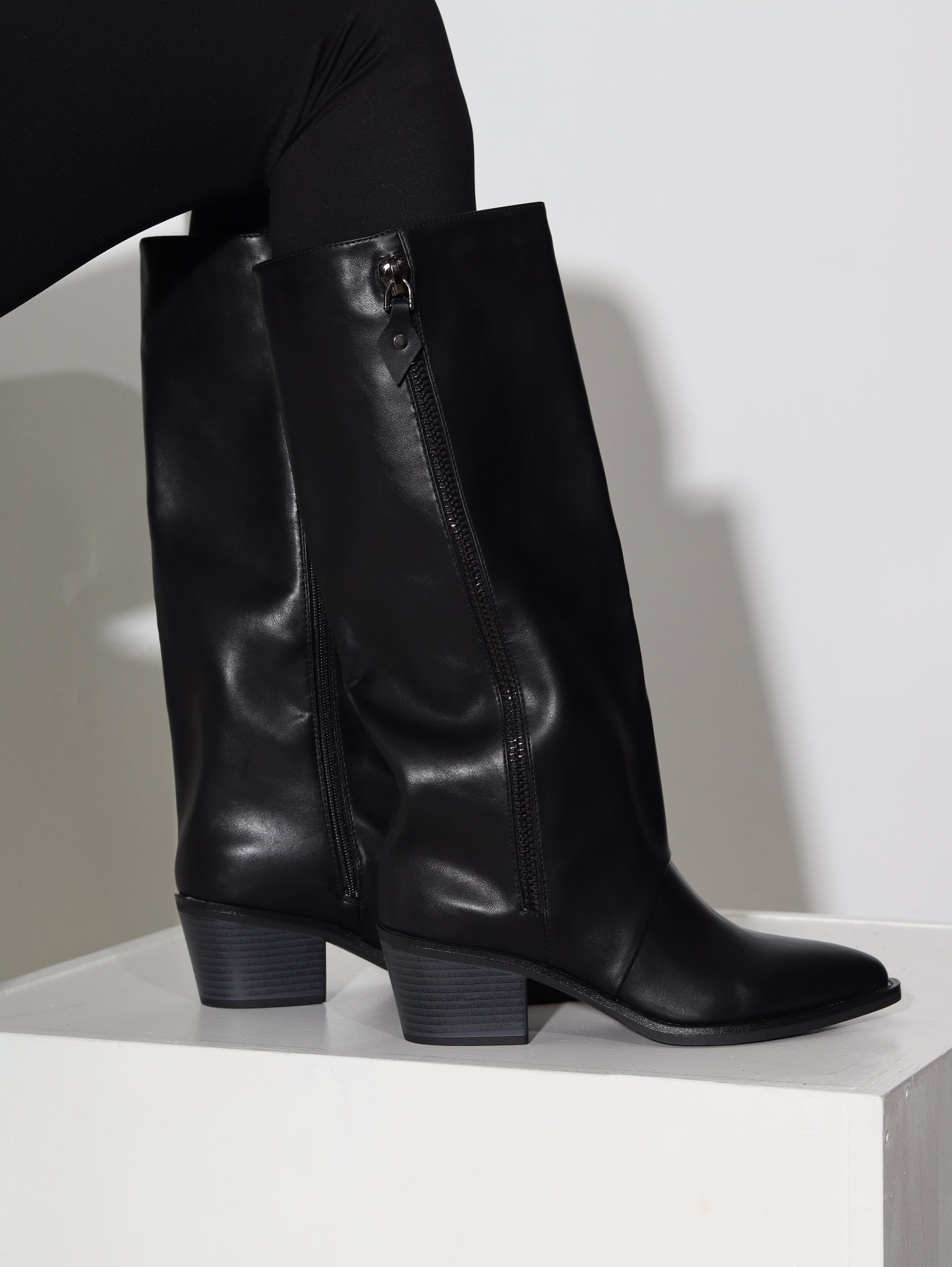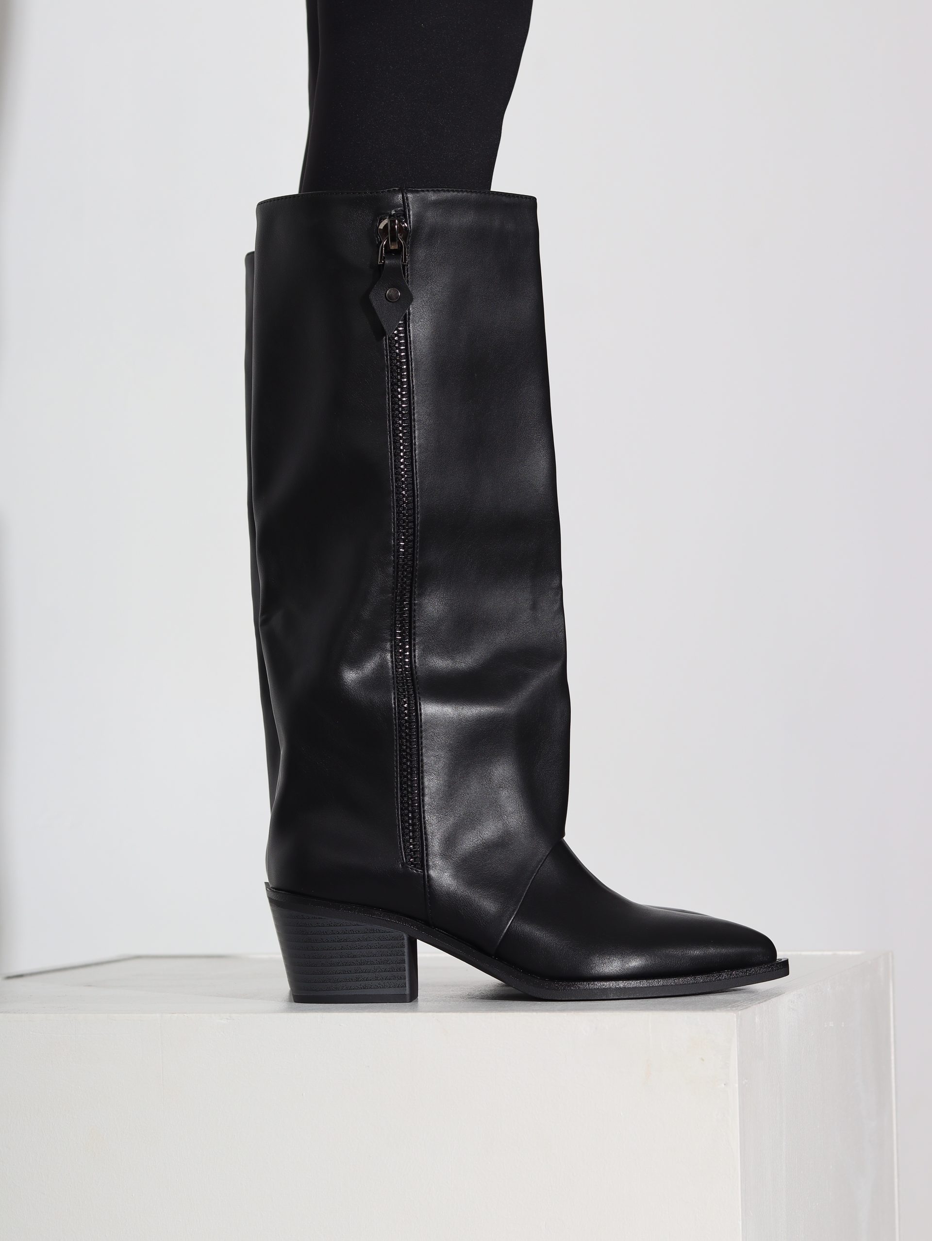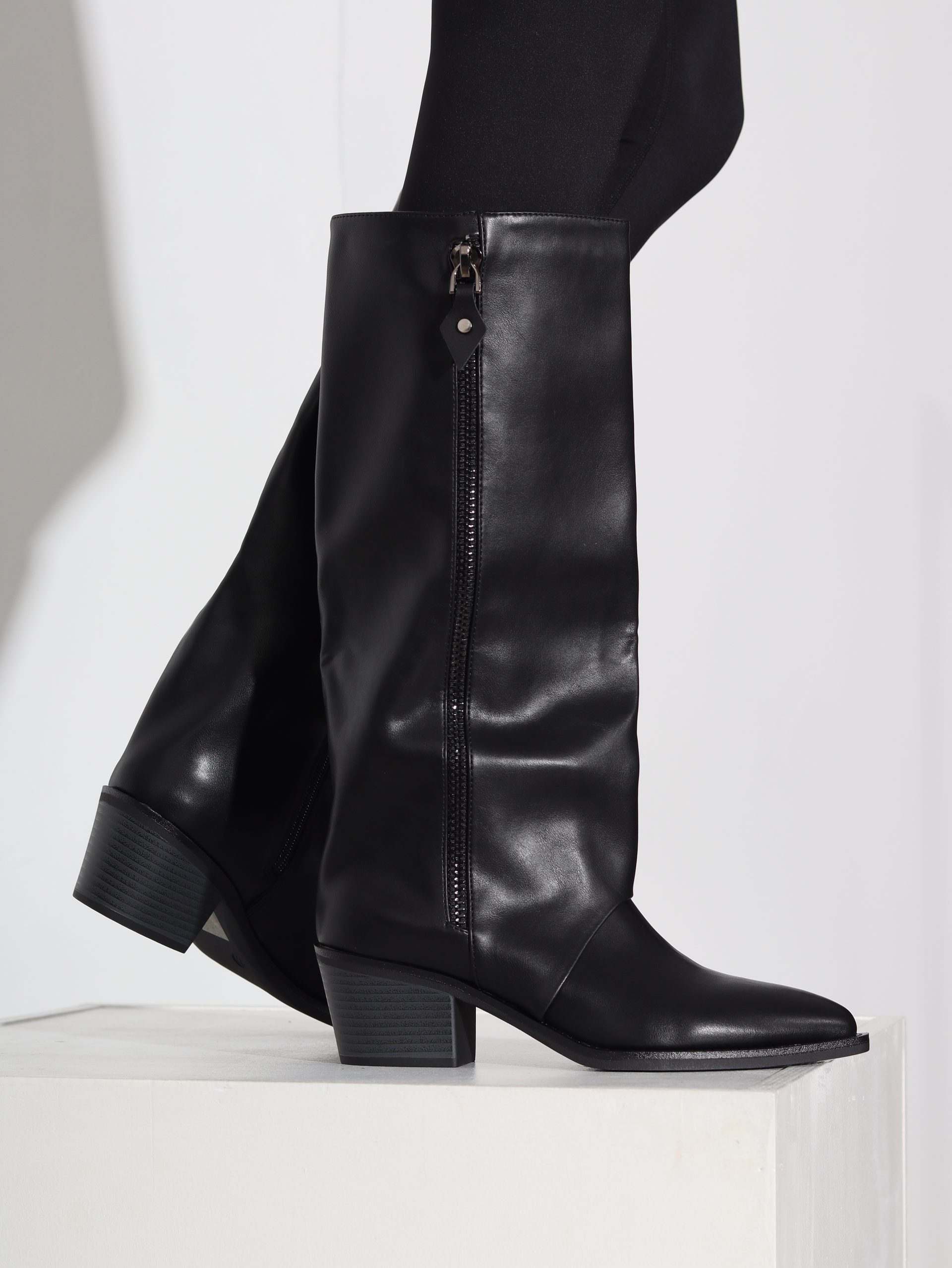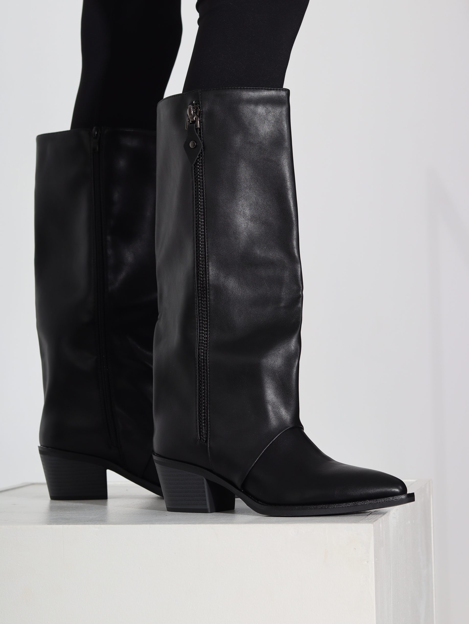 Melni kovbojtipa zābaki uz zema papēža ar spicu purngalu. Zābaki ir līdz celim , iekšpusē rāvējslēdzējs .