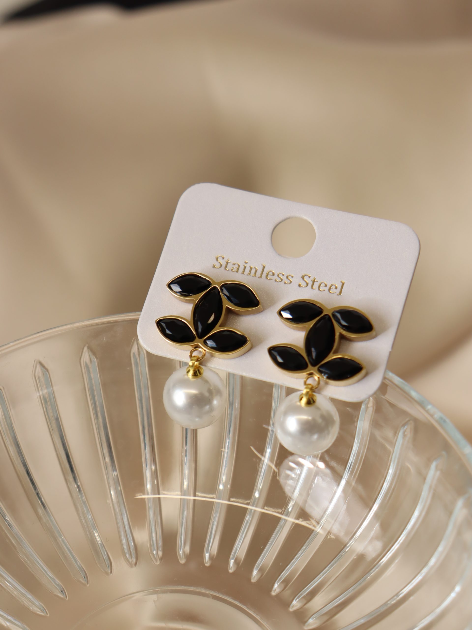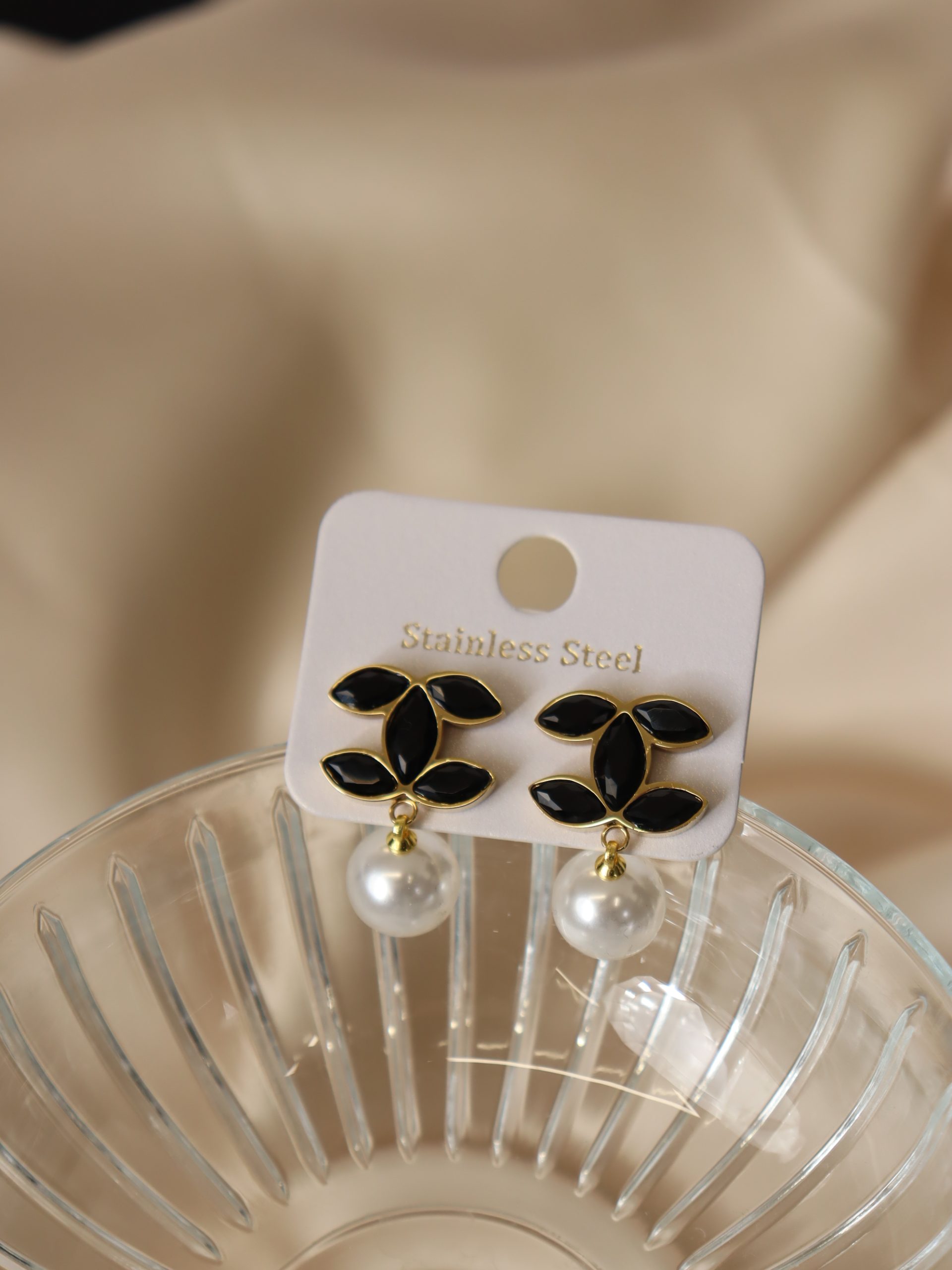 Melnas krāsas dimantiņu auskari ar zelta krāsas akcentu un baltu pērli.