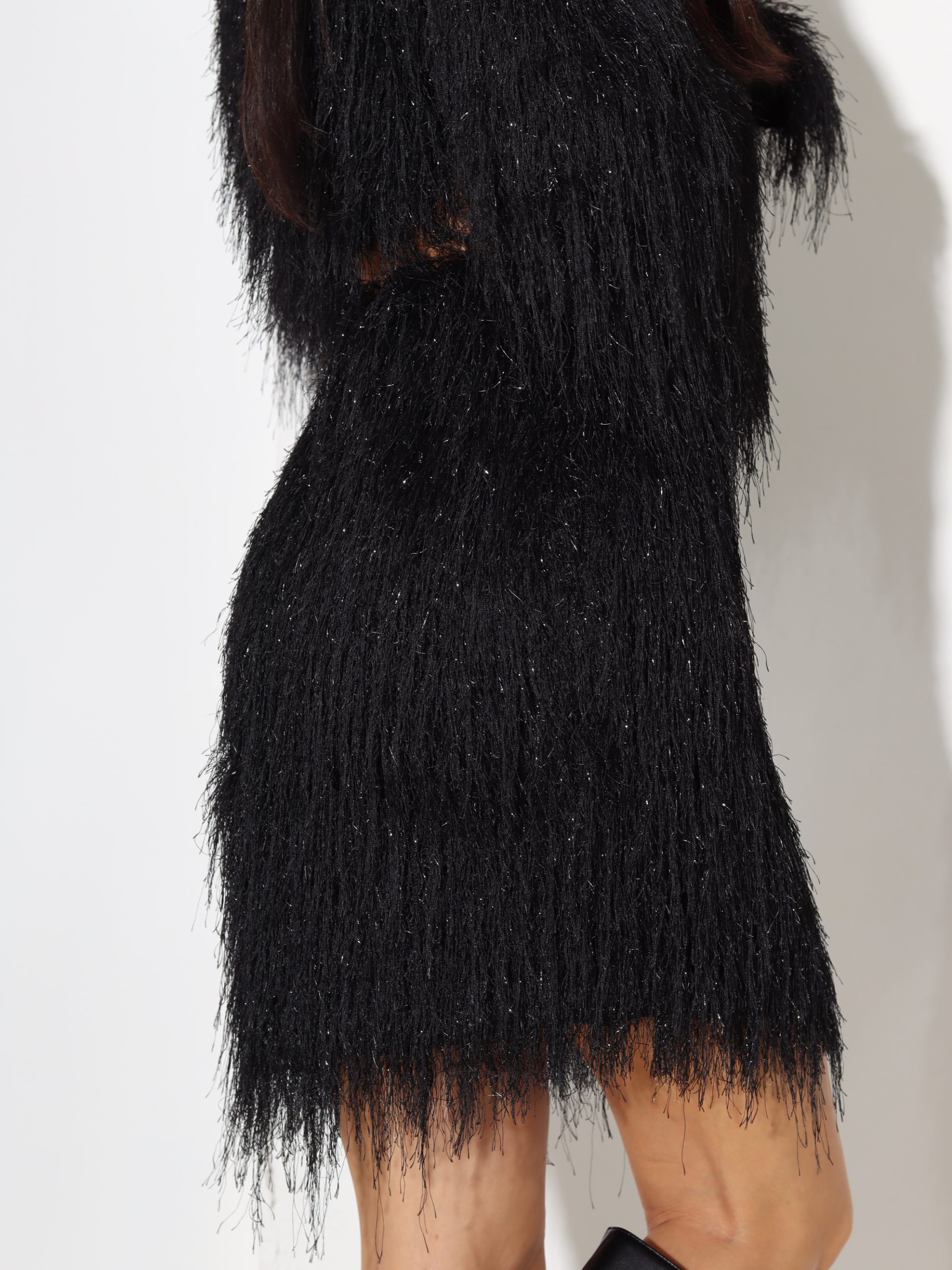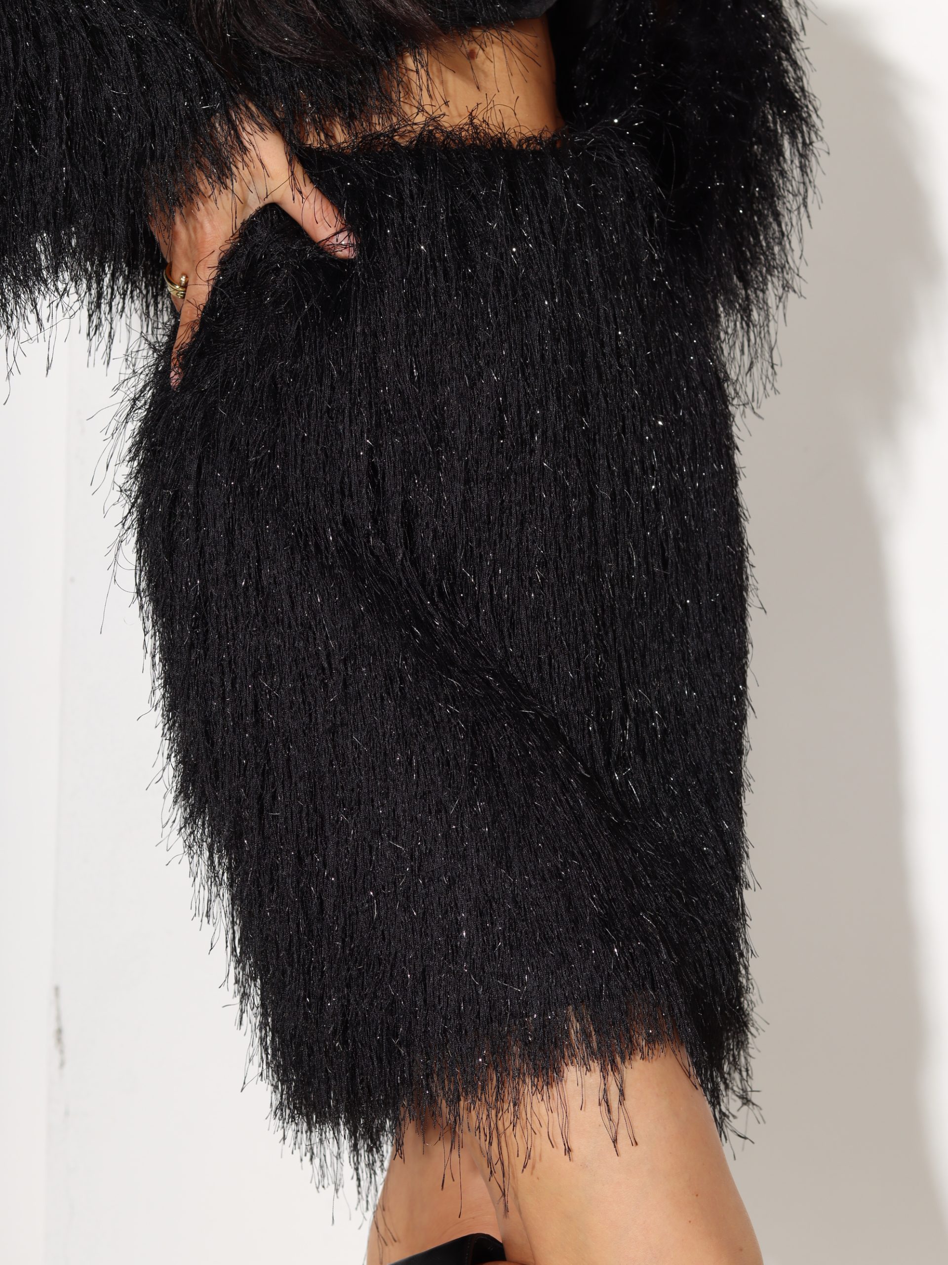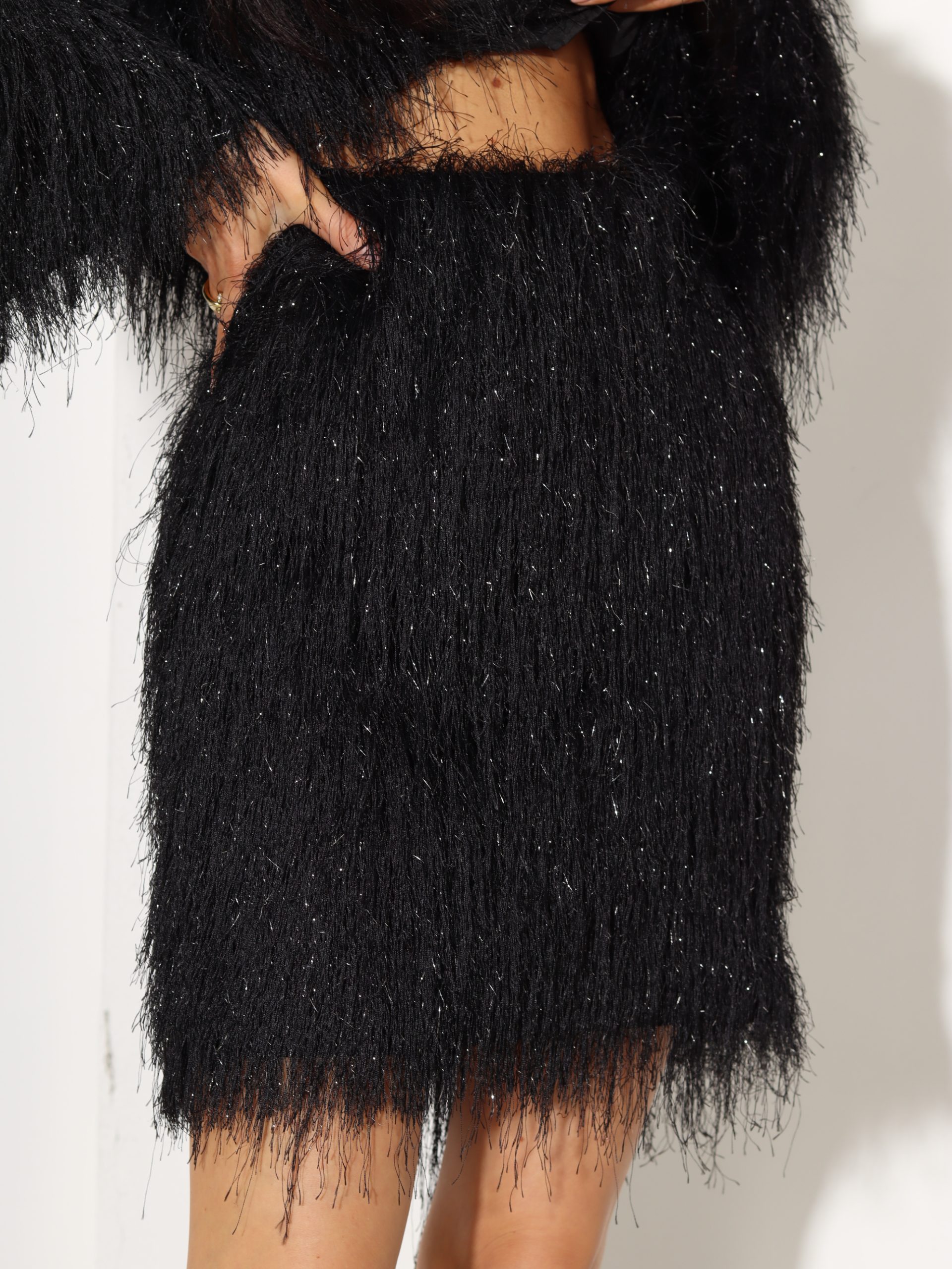 Melnas krāsas svārki taisnas piegrieznes , viduklī ietrādāta gumija un svārkiem viscaur ir nošūti ar krītošu diedziņu.
