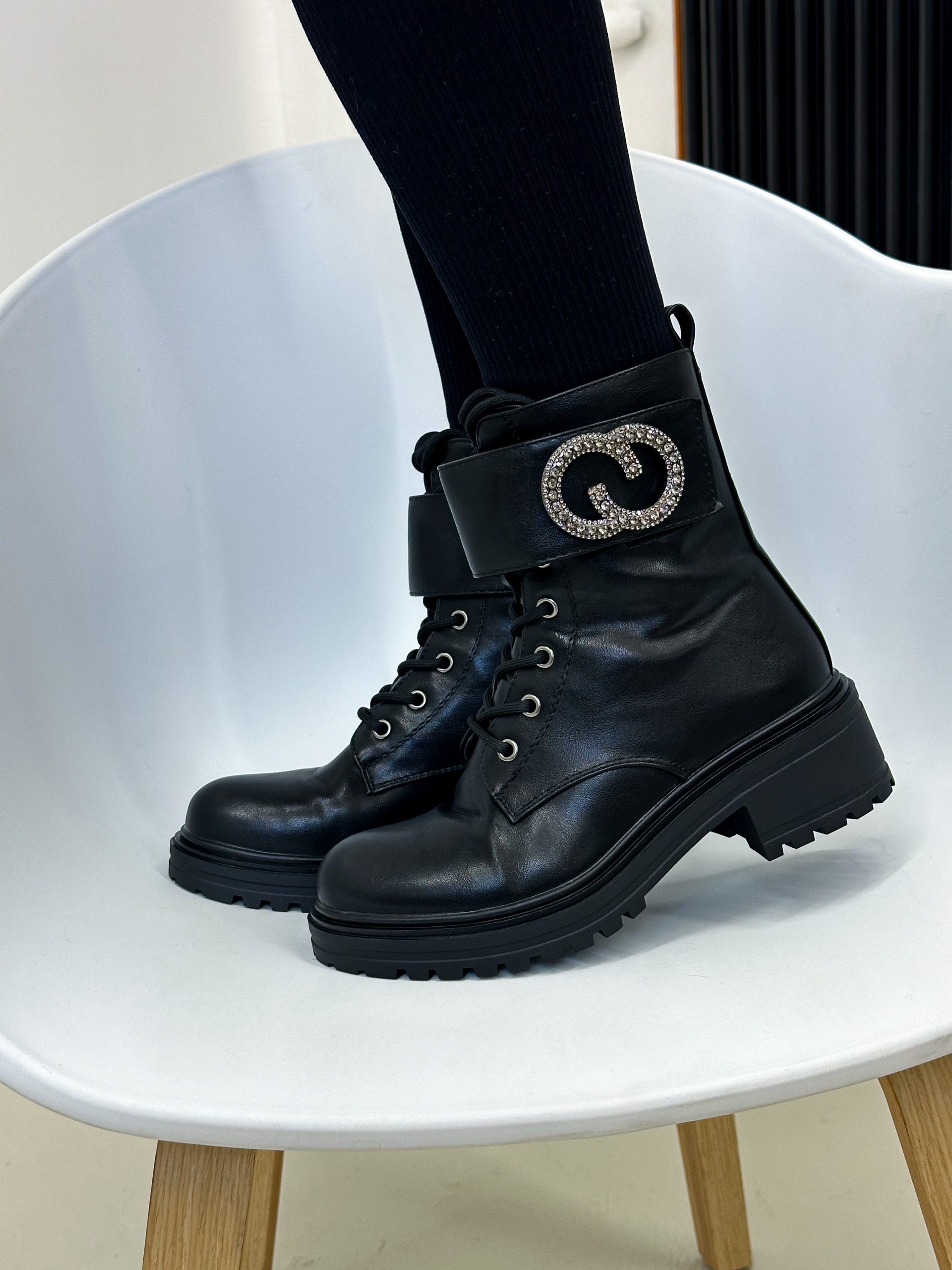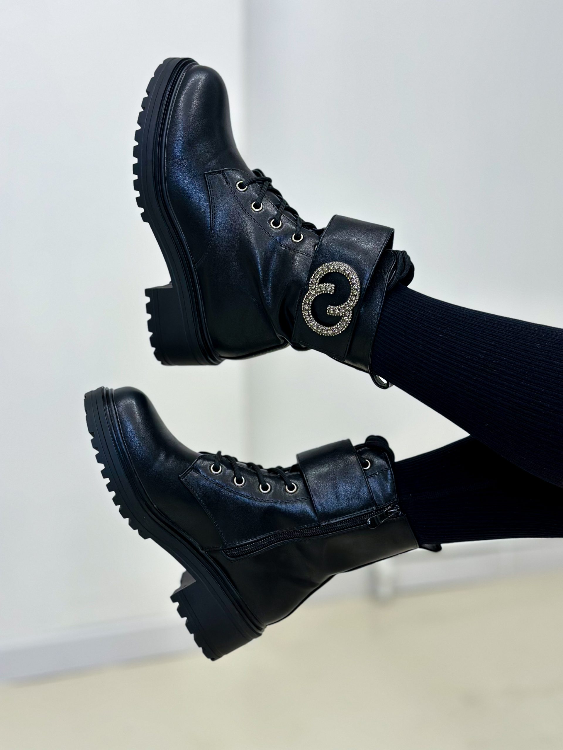 Melnas mākslīgās ādas zābaki, rievota, stabila zole. Aizdare ar aukliņām, sānos – iekšsānā rāvējslēdzējs un iekšpusē ir mazs siltinājums