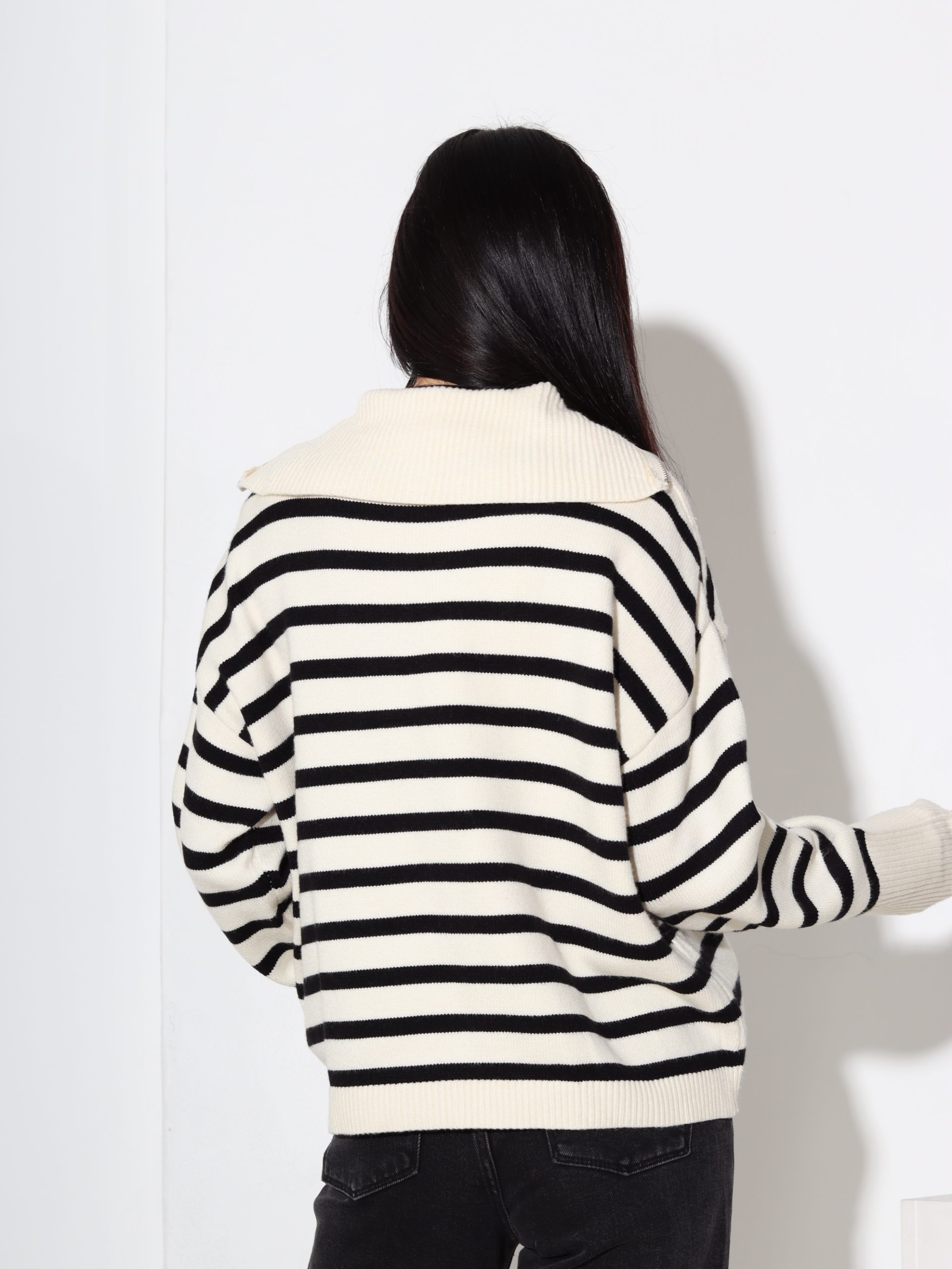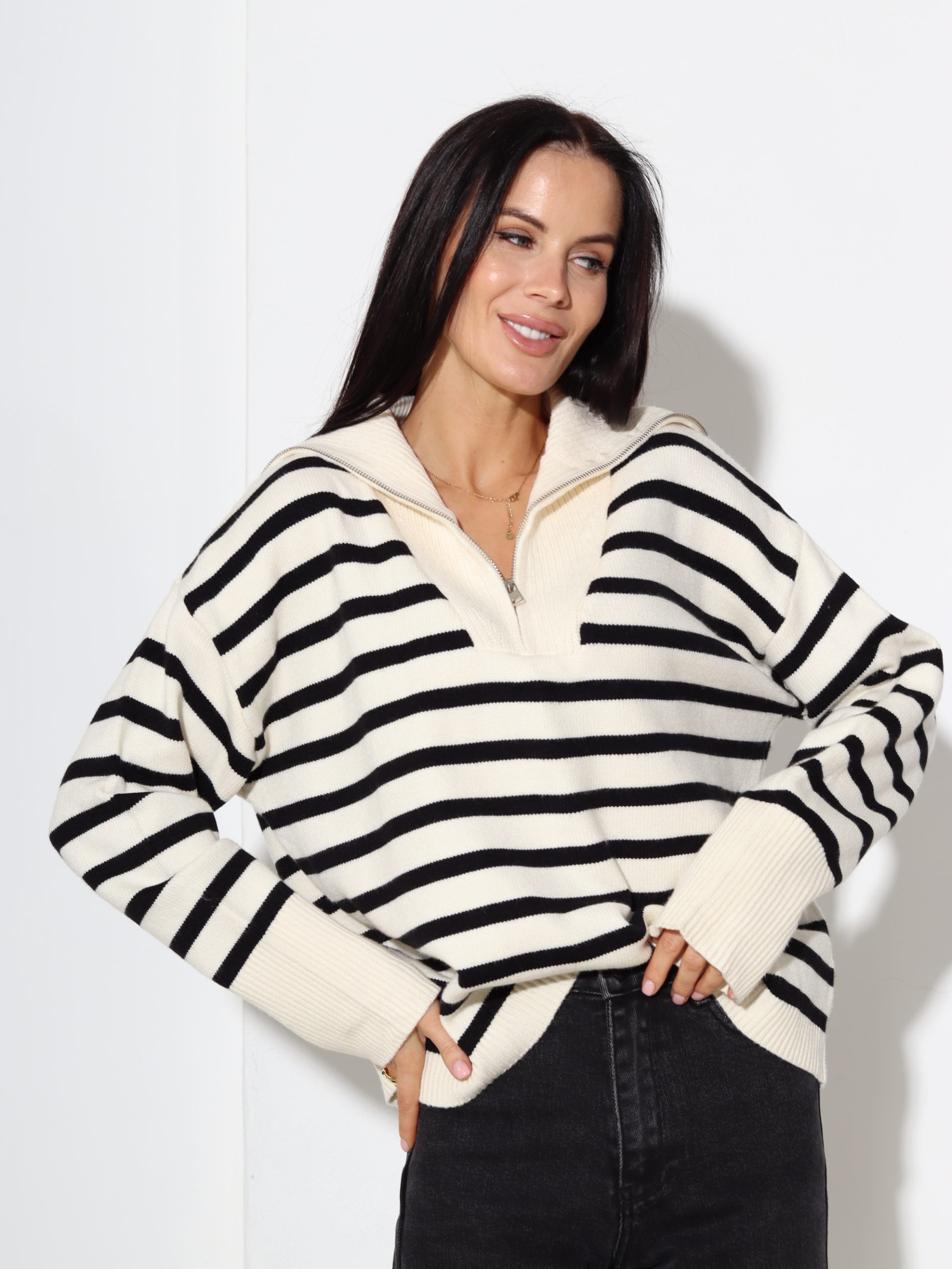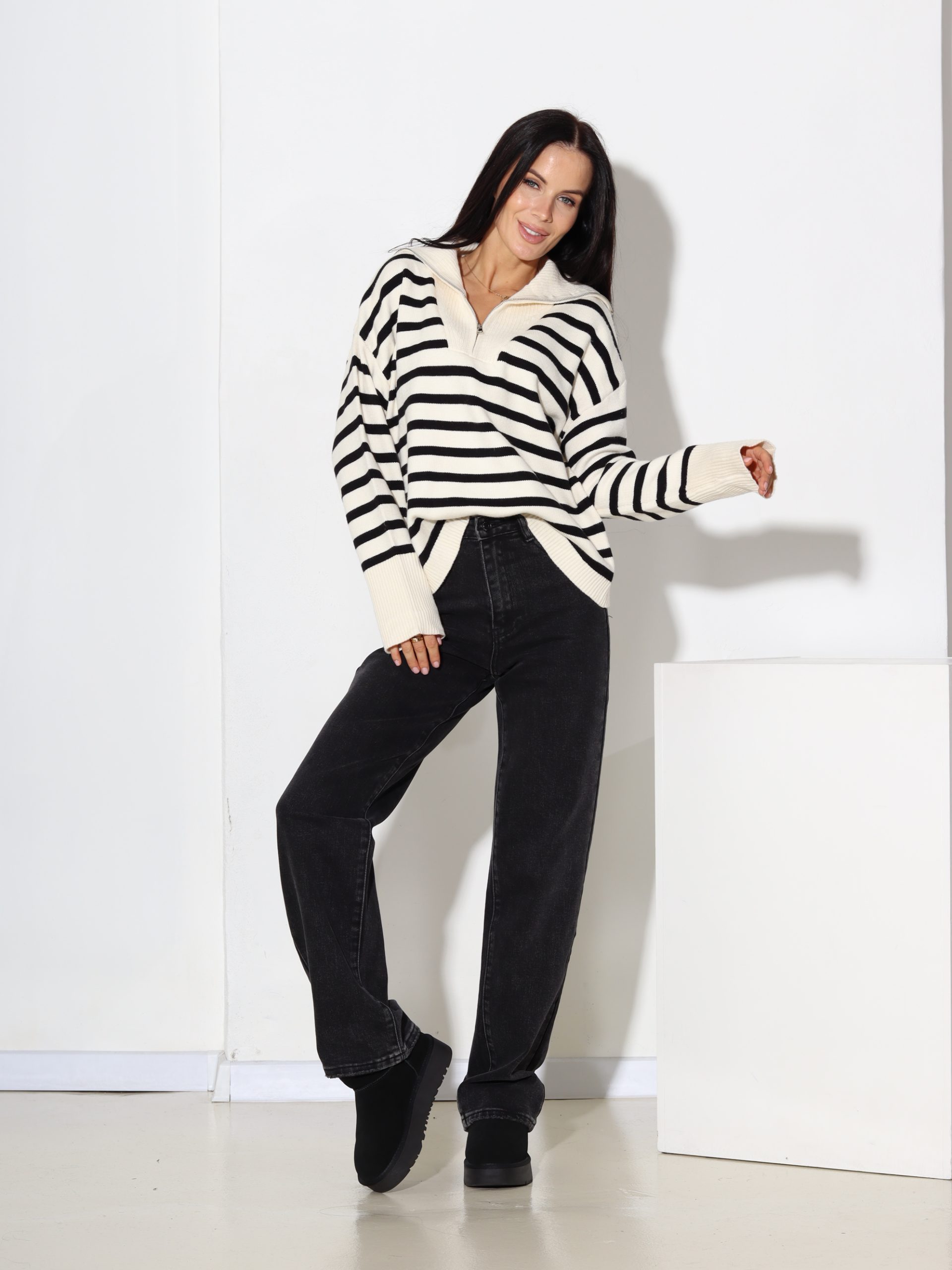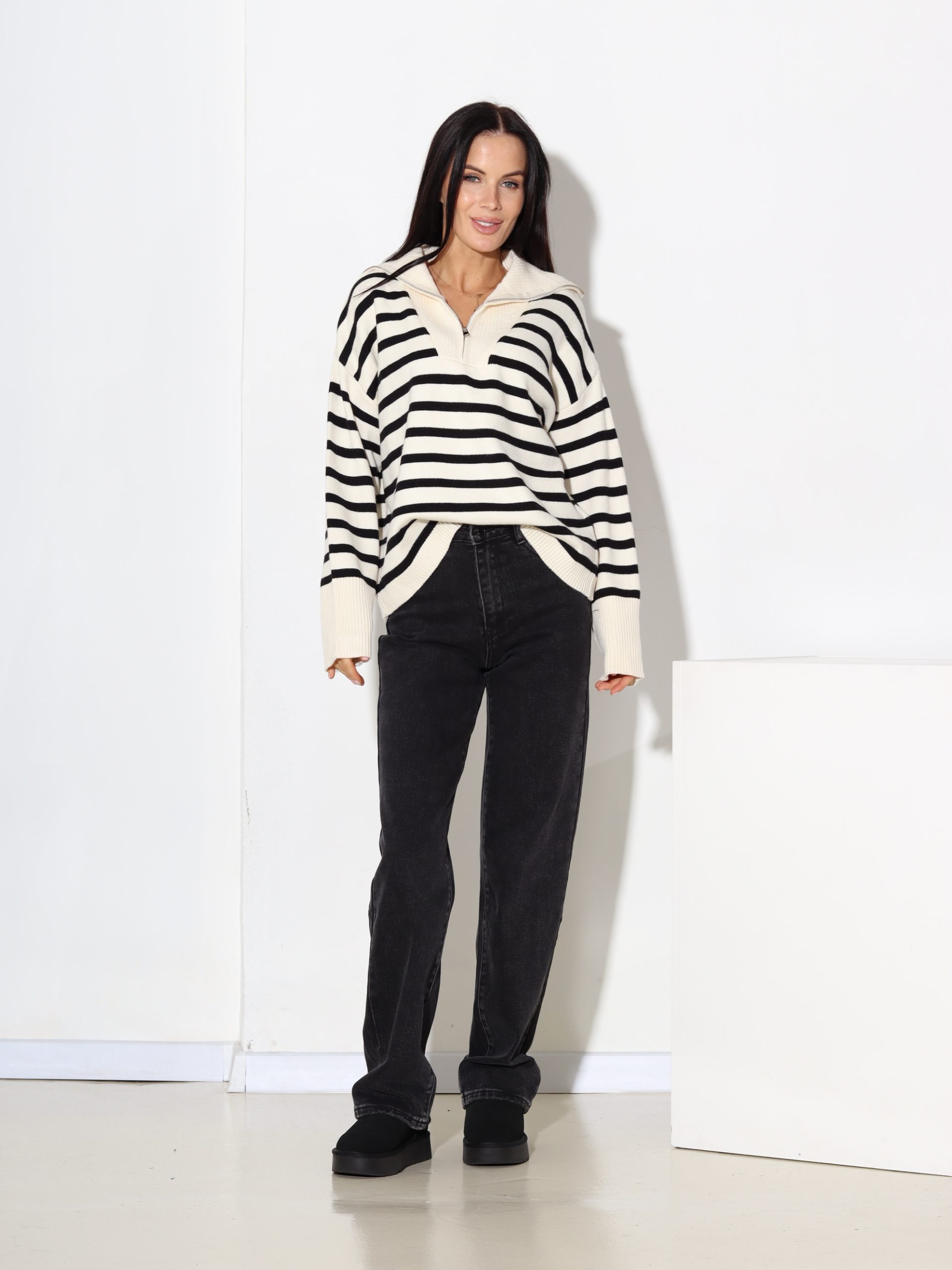 Brīva piegriezuma, svītrains- divtoņu, džemperis ar paaugstinātu kakla daļu, kurā iestrādāts rāvējslēdzējs