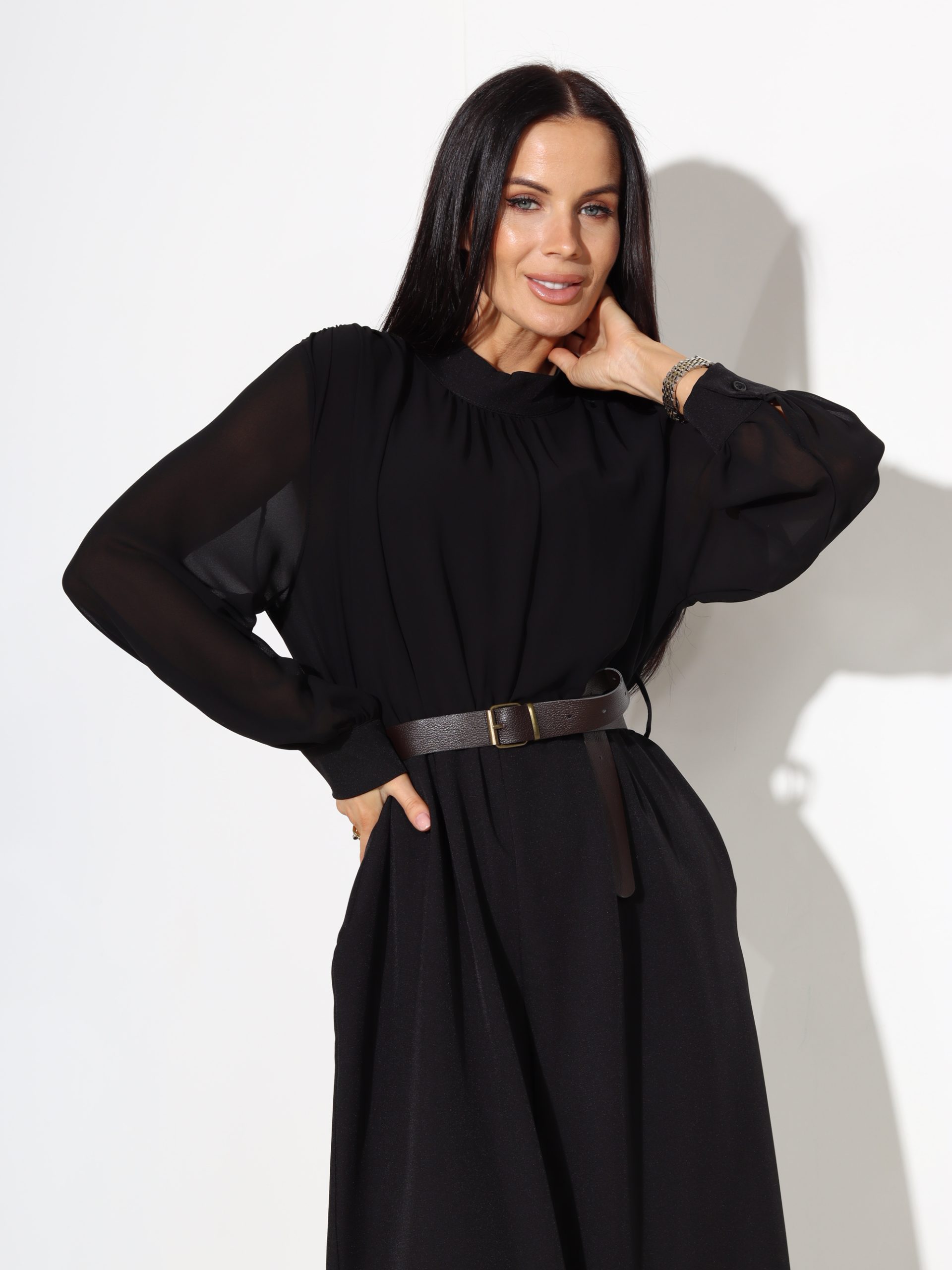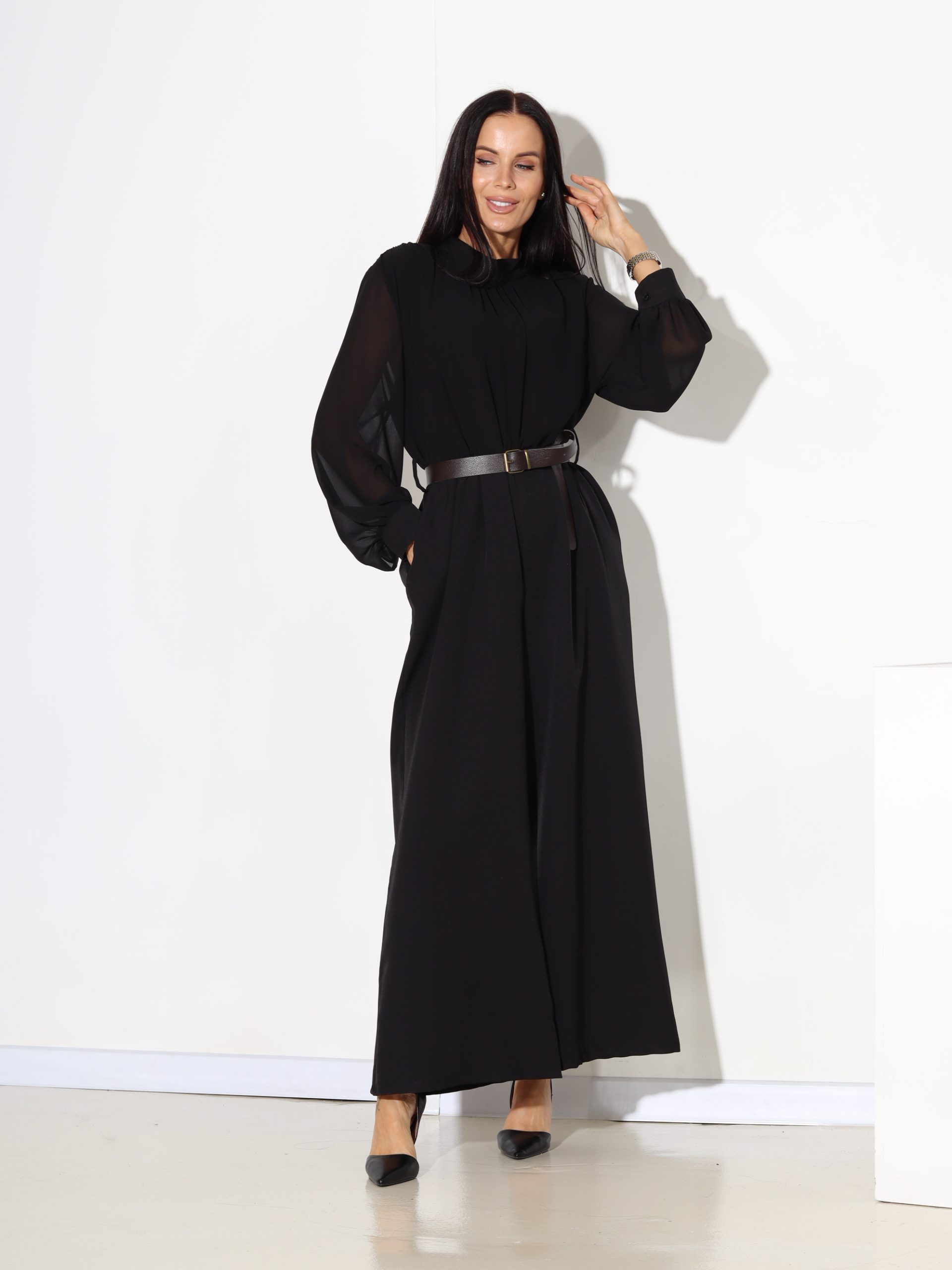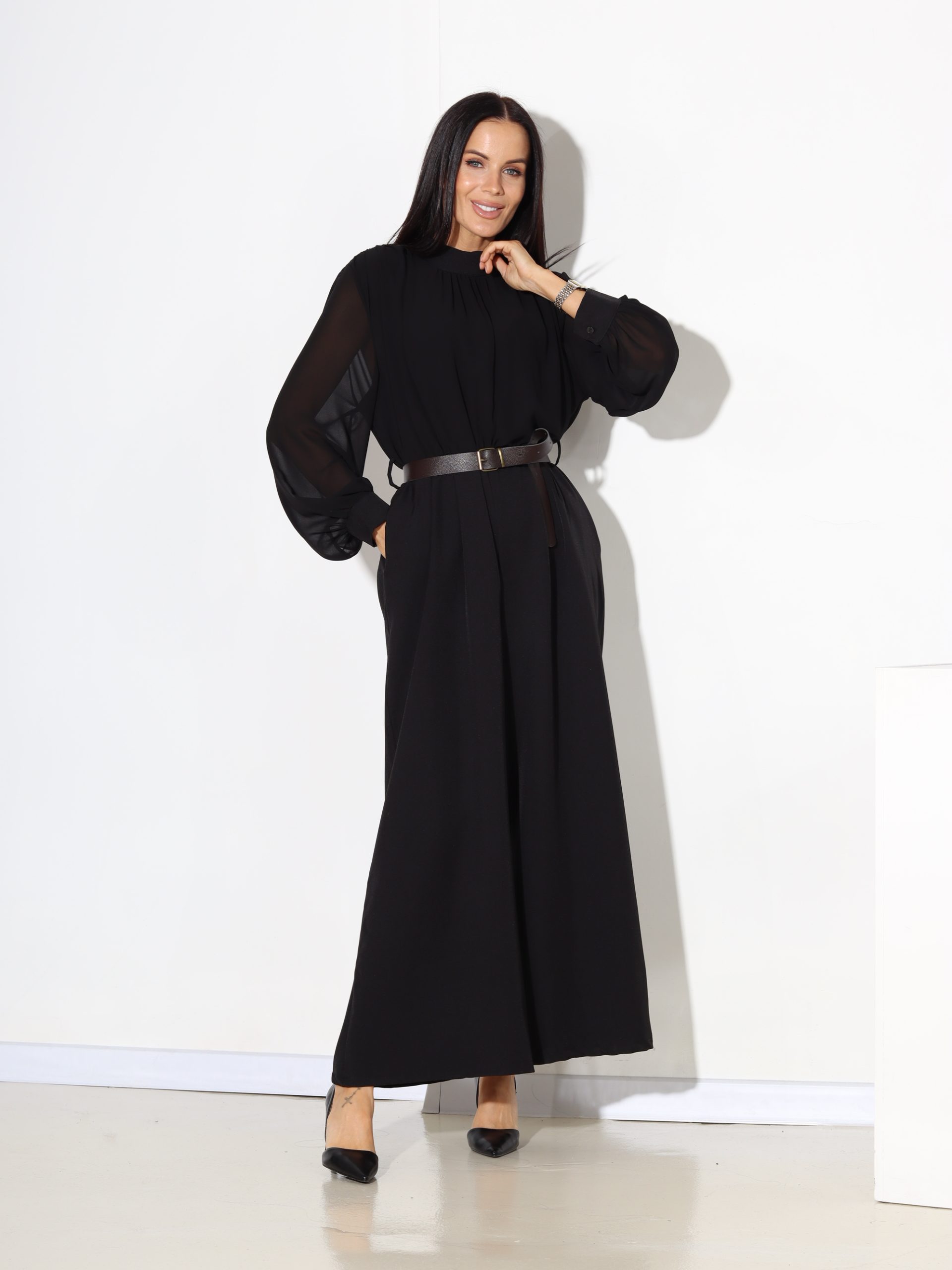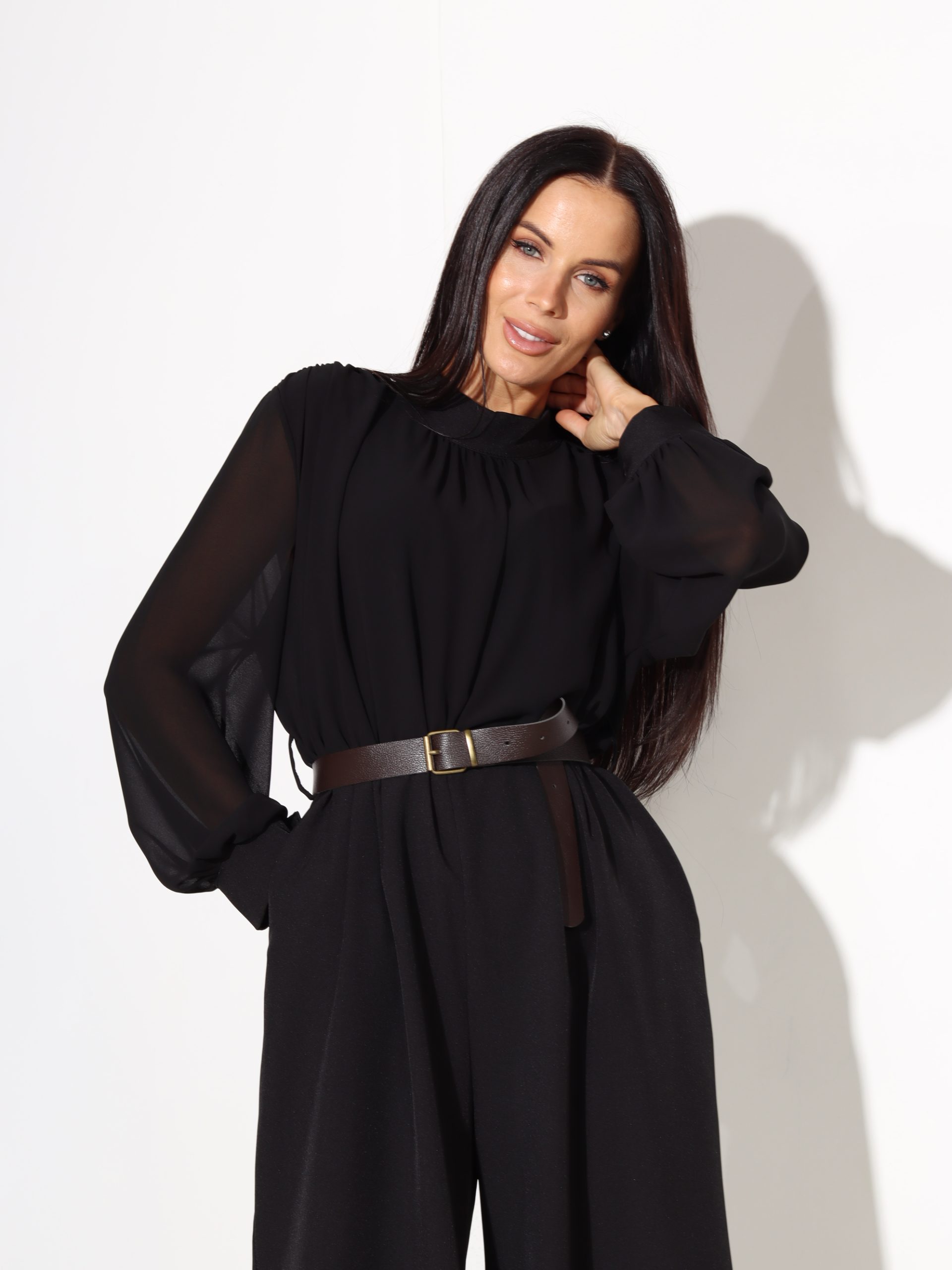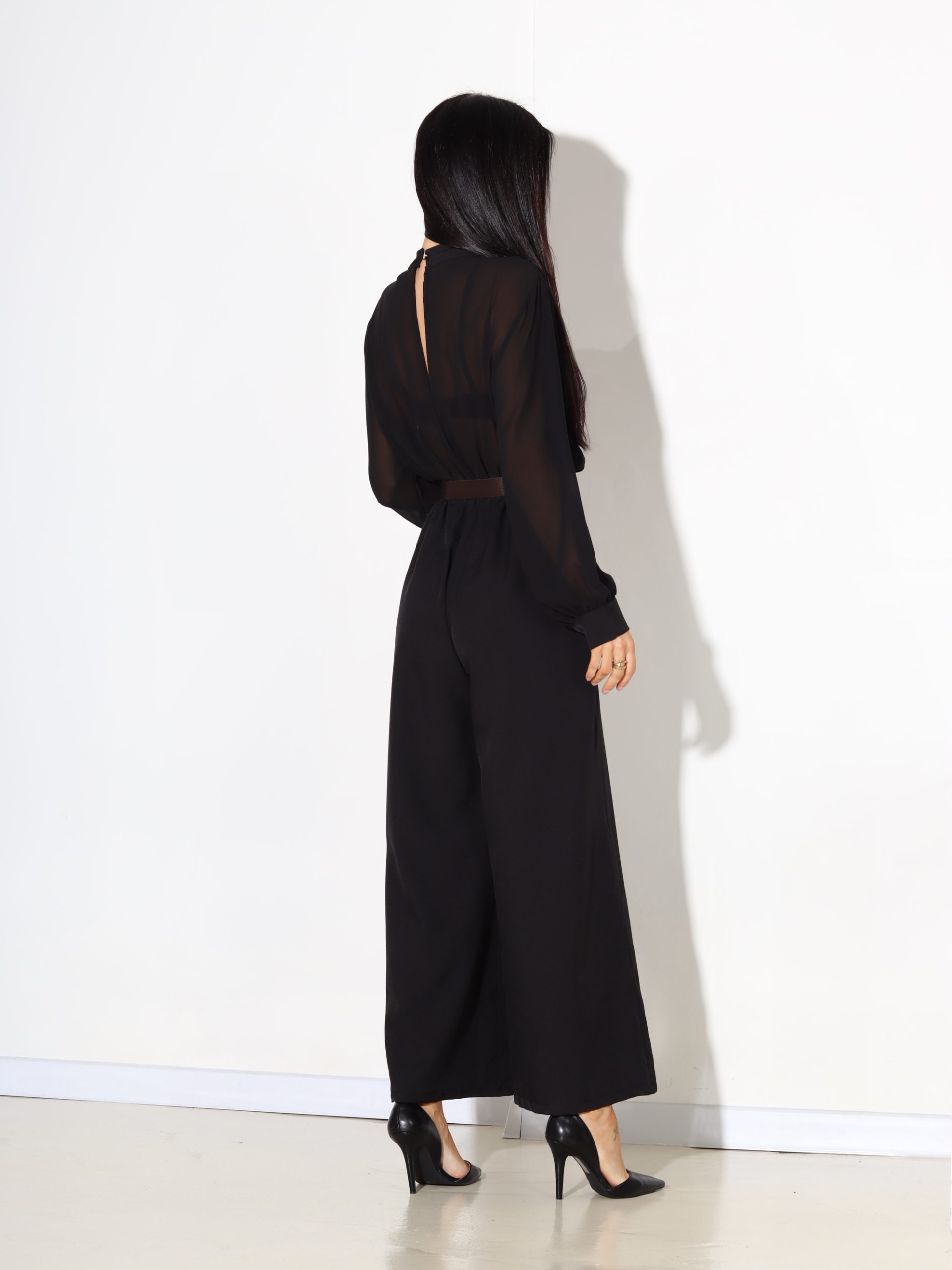 Melns kombinezons ar garām piedurknēm un jostu – 17672