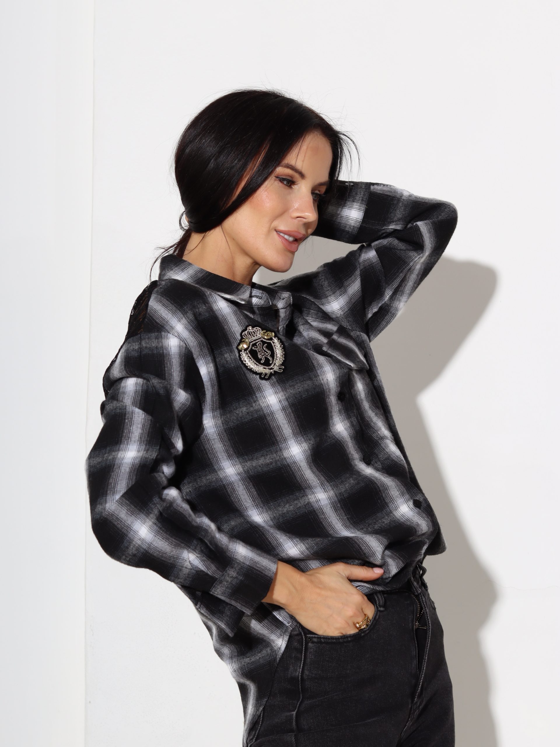 Melns lielrūtu krekls ar mežģīnes akcentu – 17461