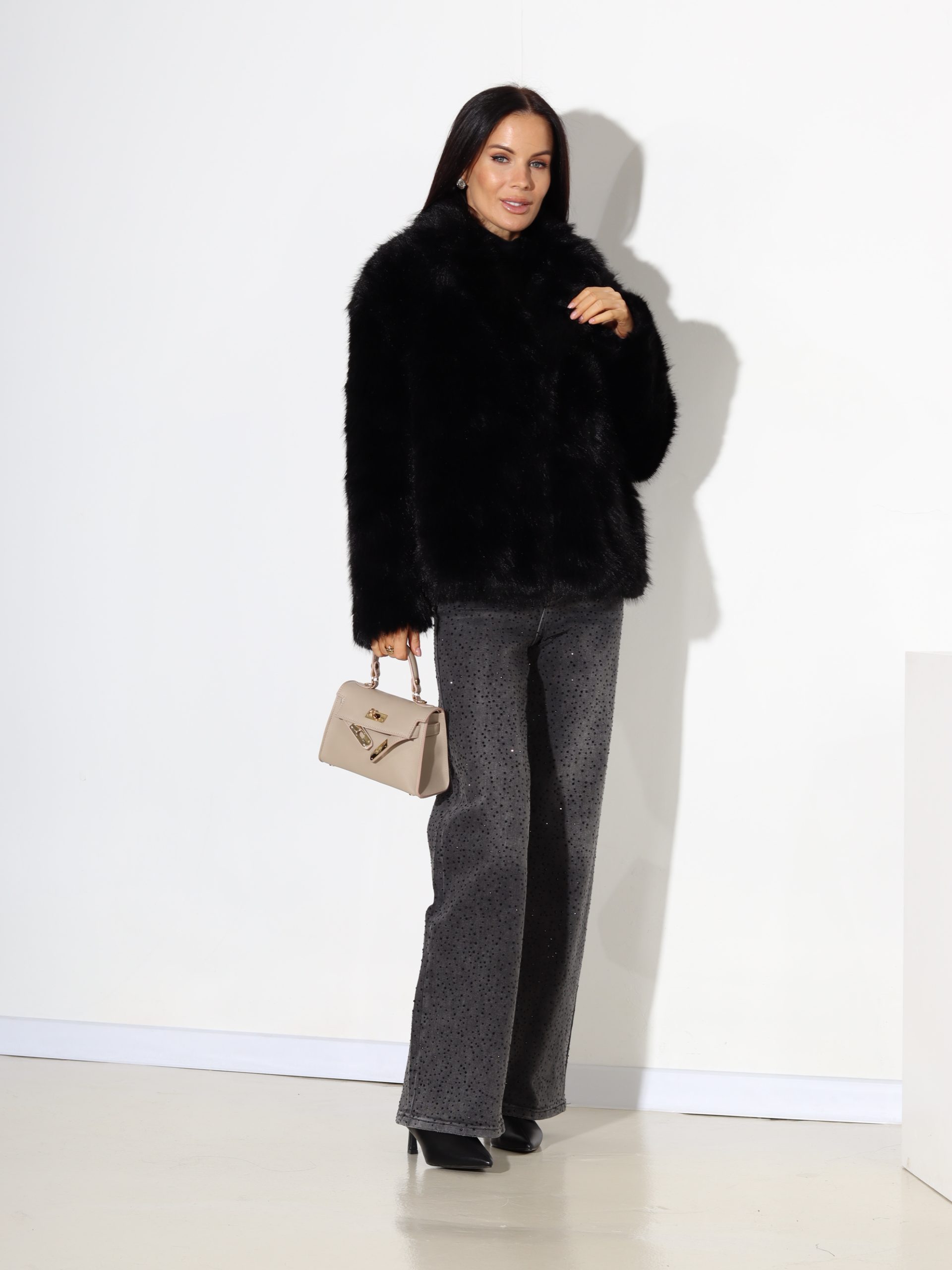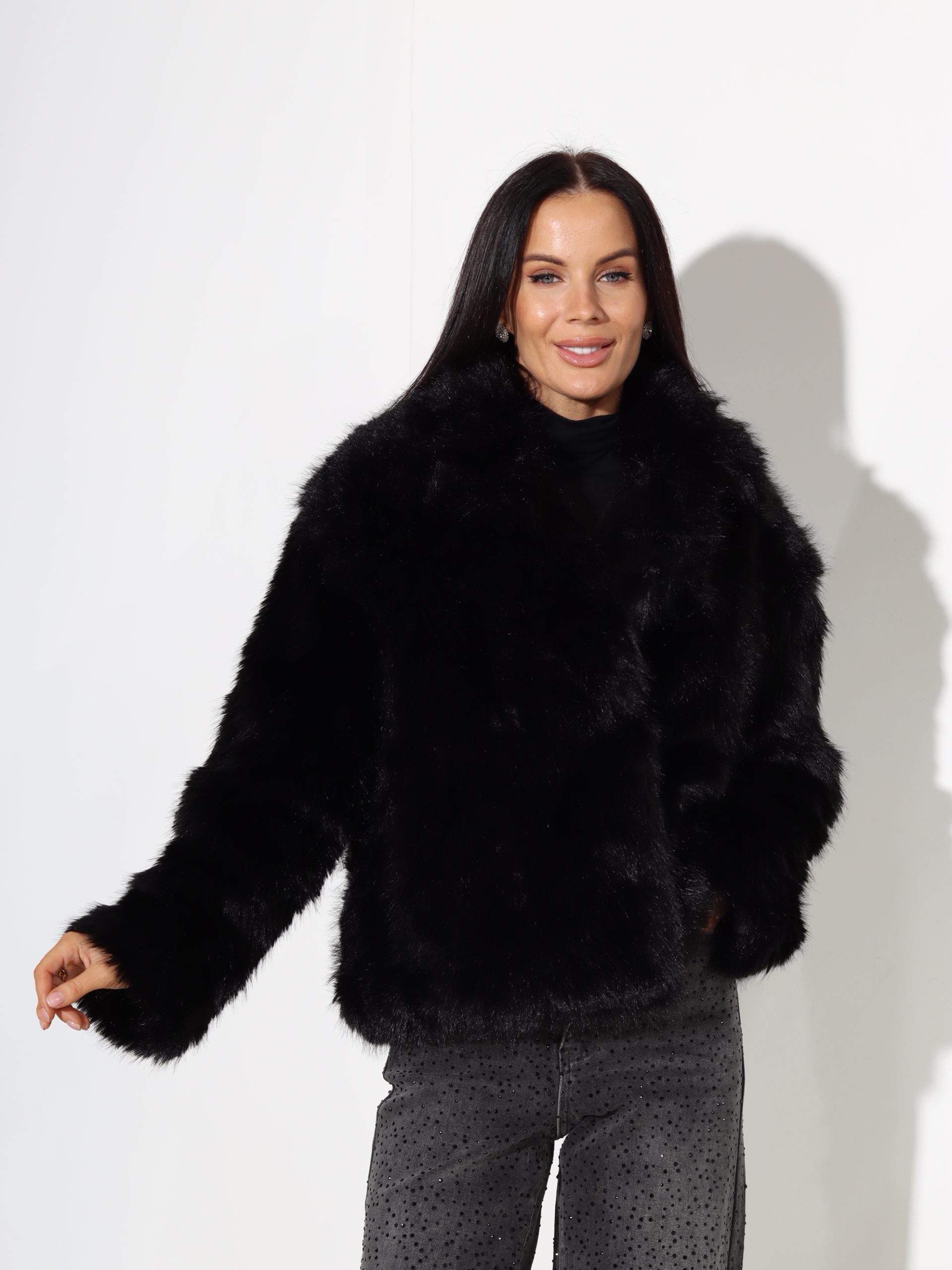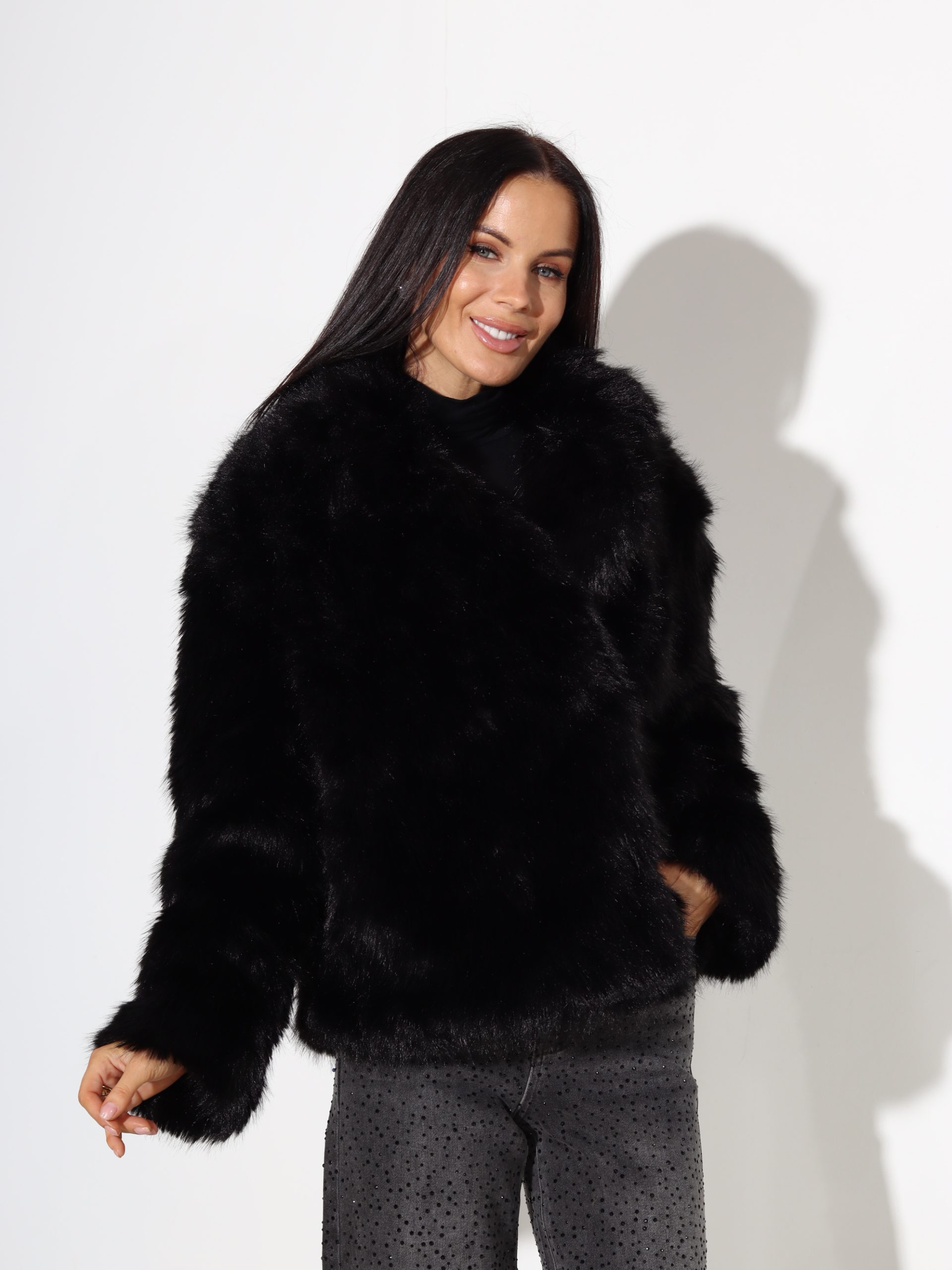 Melnas krāsas, īsas spalvas kažoks ar klasisku apkakli . Kažokam ir pieskaņotas krāsa odere un divu spiedpogu aizdare.