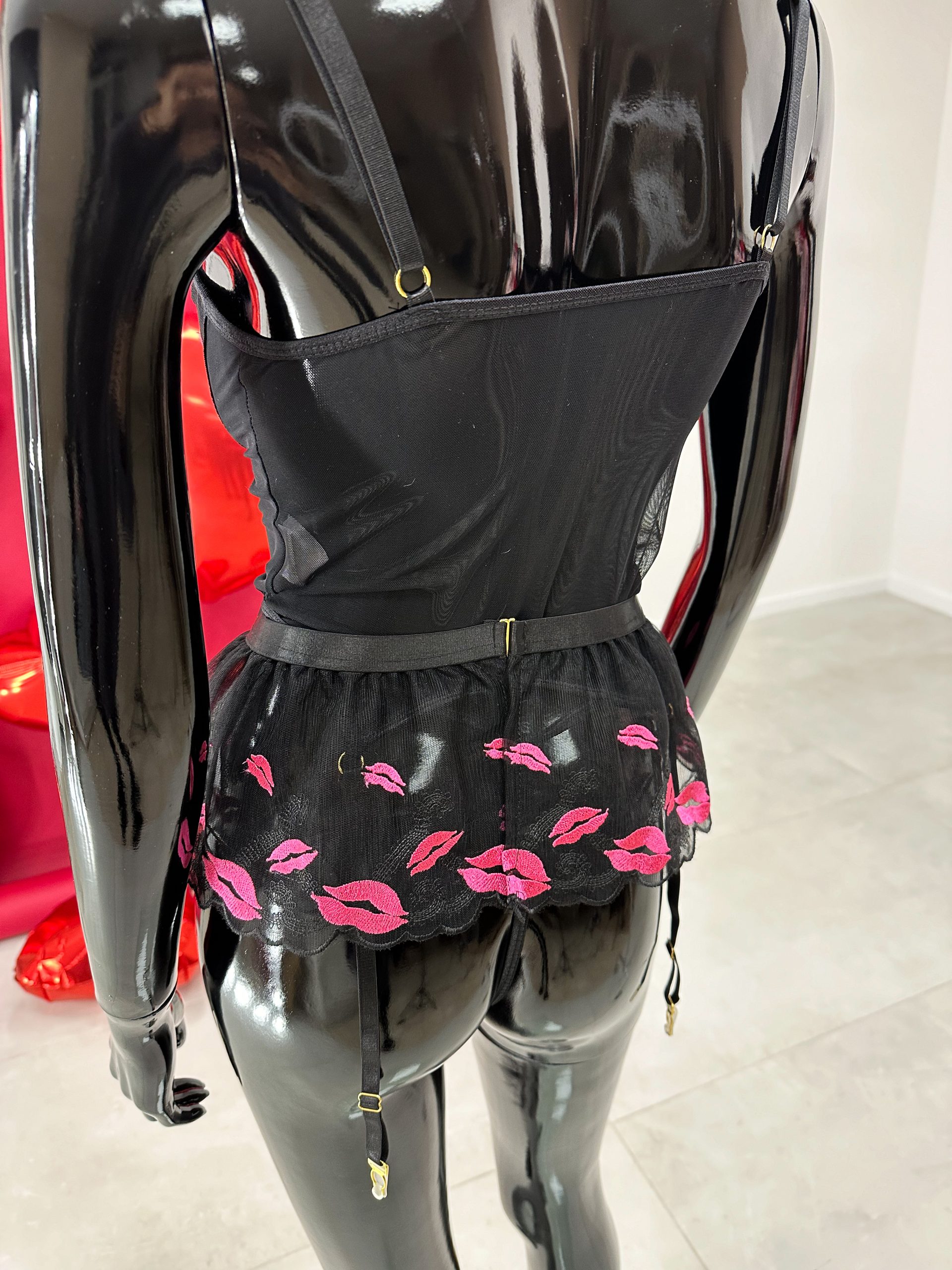 Veļas komplektā ietilpst korsete ar piešūtiem zeķturiem, mini svārciņi un string biksītes. Korsetes krūšu bļodiņā ir iestrādāta stīpa, lencīšu garums ir regulējams. Komplekts ir izšūts ar rozā krāsas bučiņām.