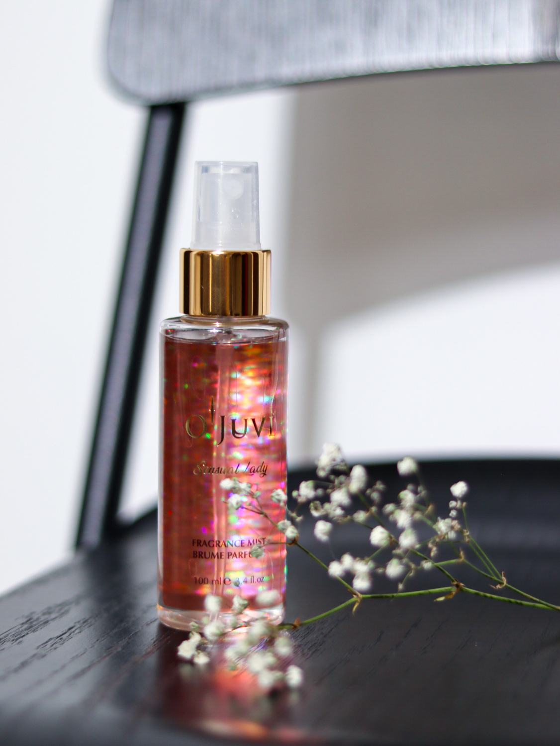 Lietošanas instrukcija: maigi izsmidziniet uz ķermeņa, lai izbaudītu atsvaidzinošo, mirdzošo miglas smaržu.
