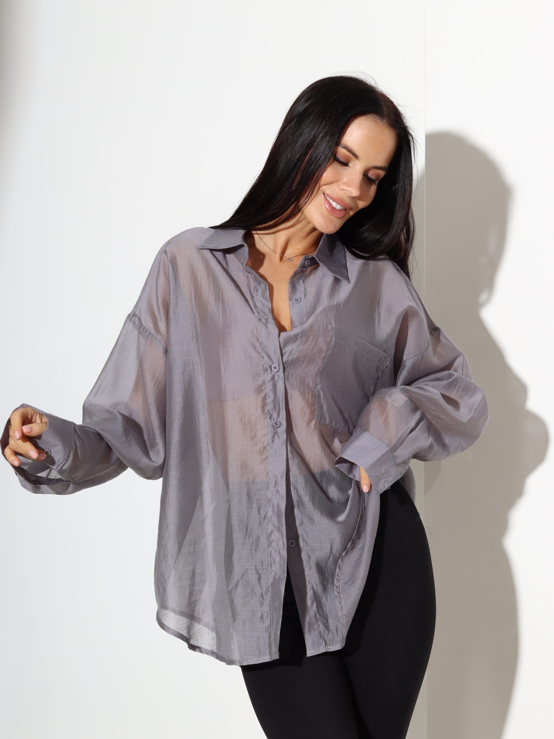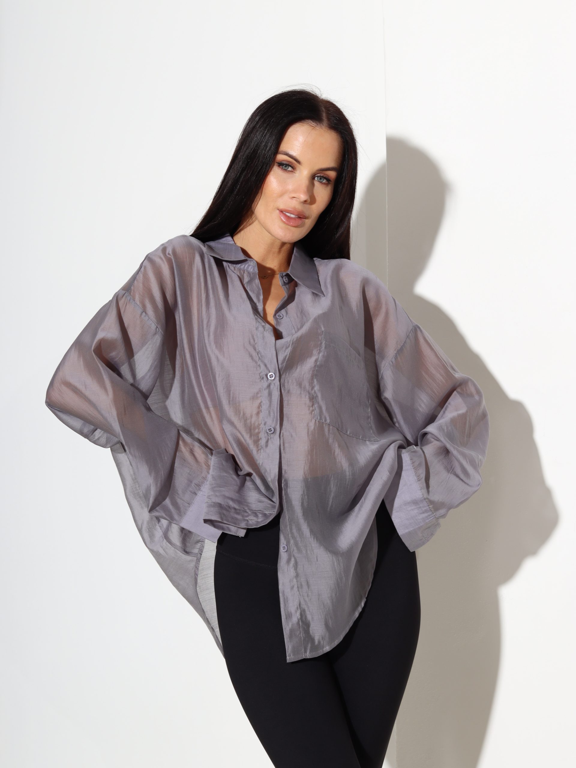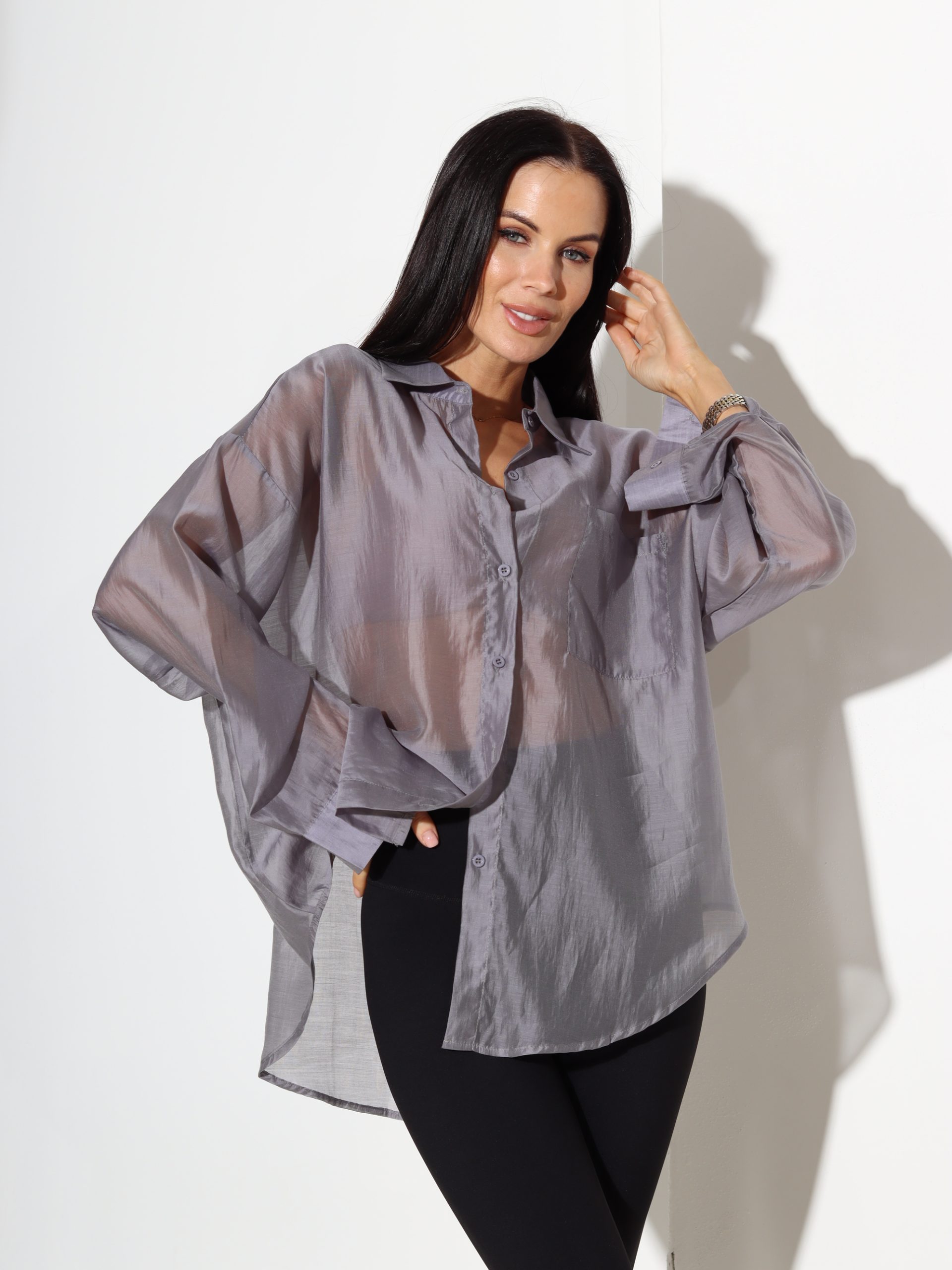 Brīva piegreizuma blūze ar priekšpusē iešūtām pieskaņotas krāsas pogām. Blūzei ir apkakle un priekšpusē uzšūta viena neaizverama kabata. Piedurkņu galos ir iešūta viena pieskaņotas krāsas poga.