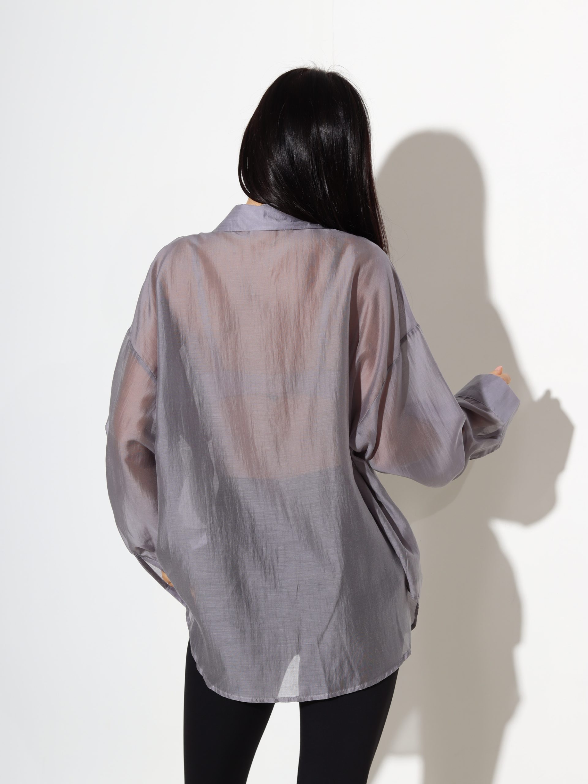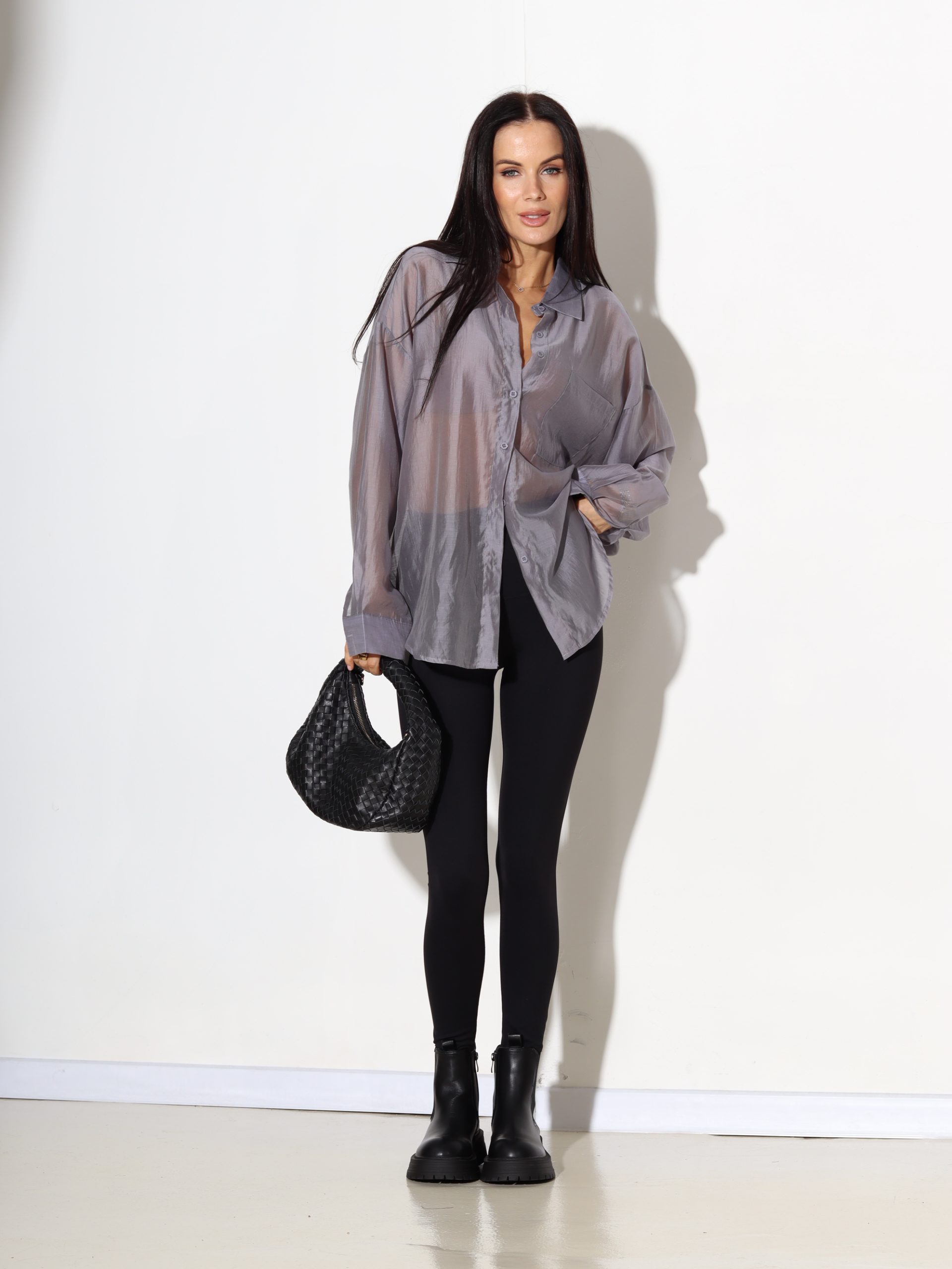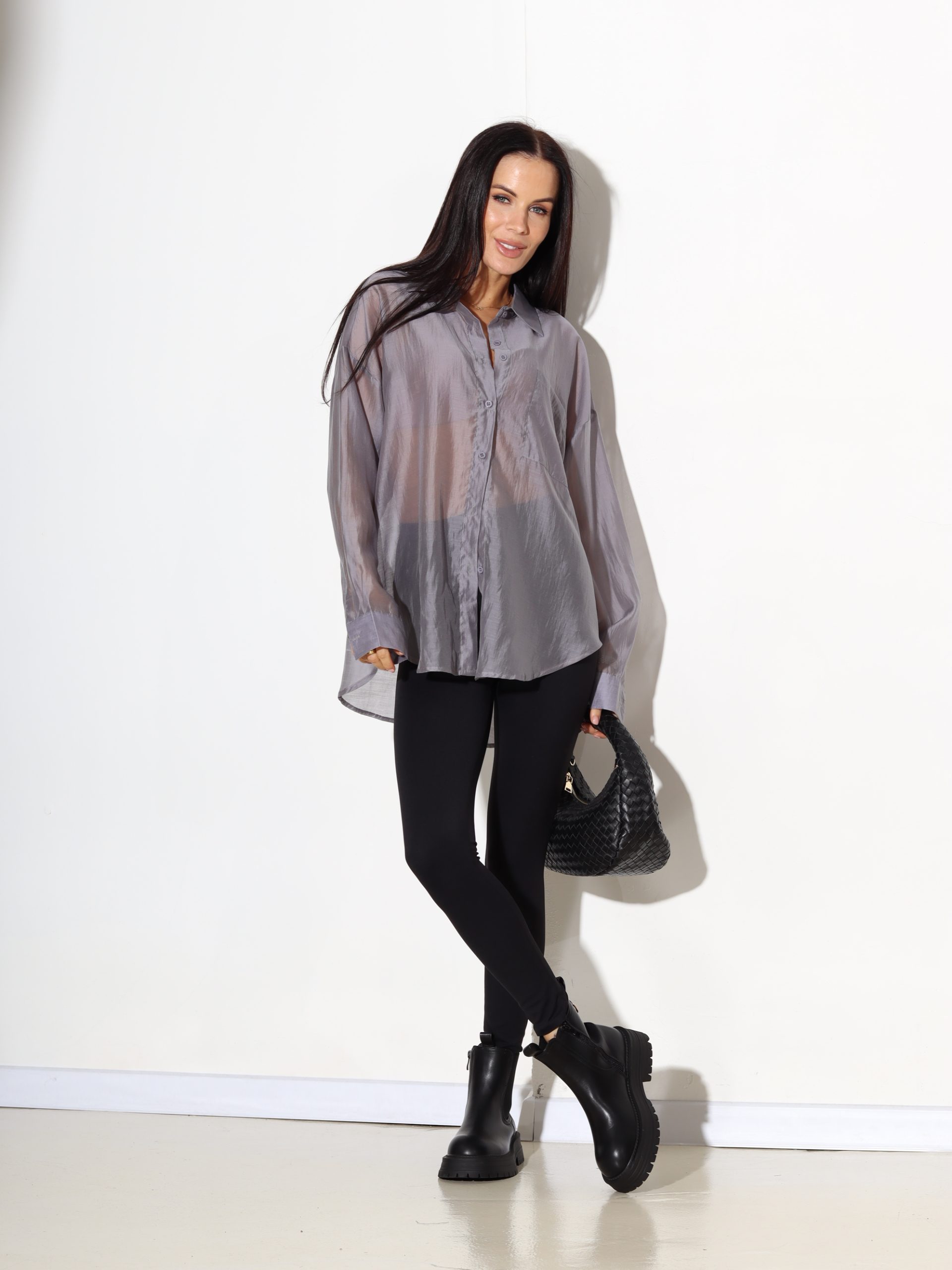 Brīva piegreizuma blūze ar priekšpusē iešūtām pieskaņotas krāsas pogām. Blūzei ir apkakle un priekšpusē uzšūta viena neaizverama kabata. Piedurkņu galos ir iešūta viena pieskaņotas krāsas poga.