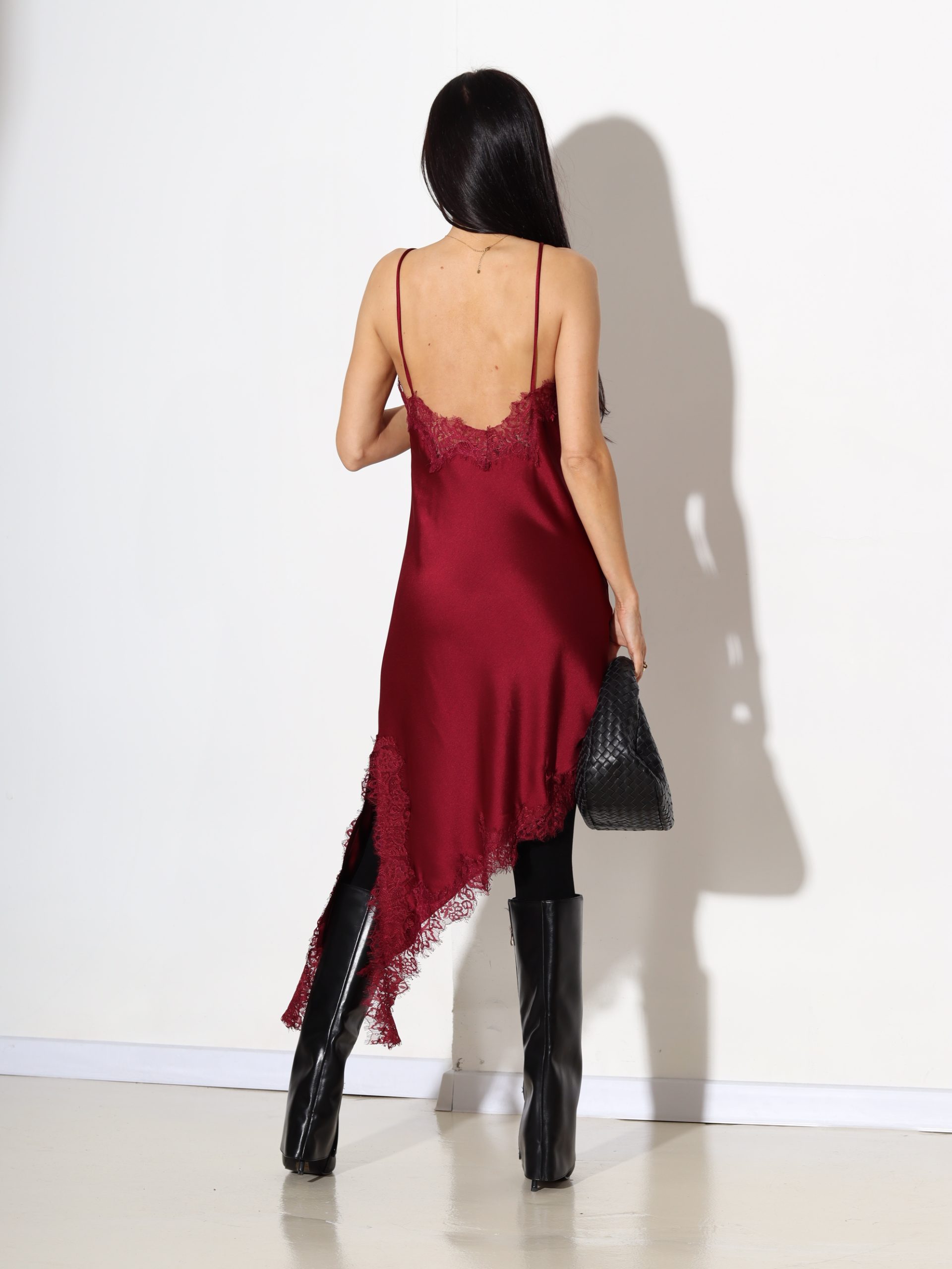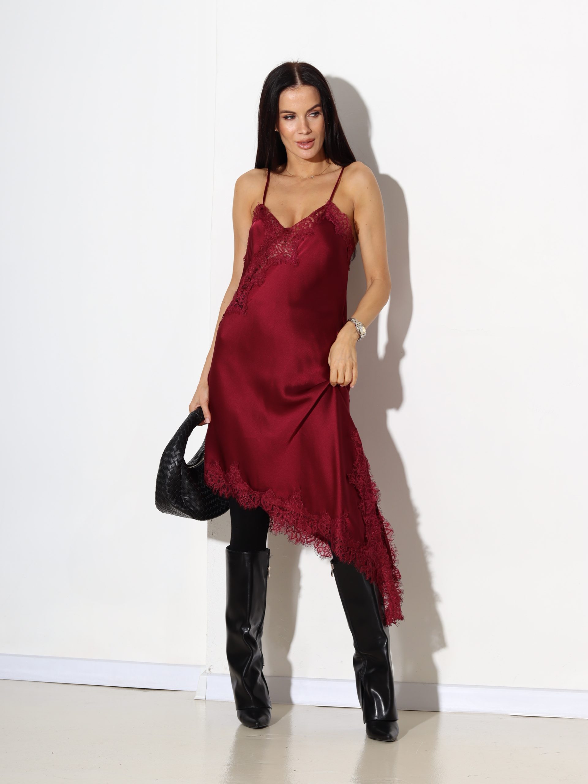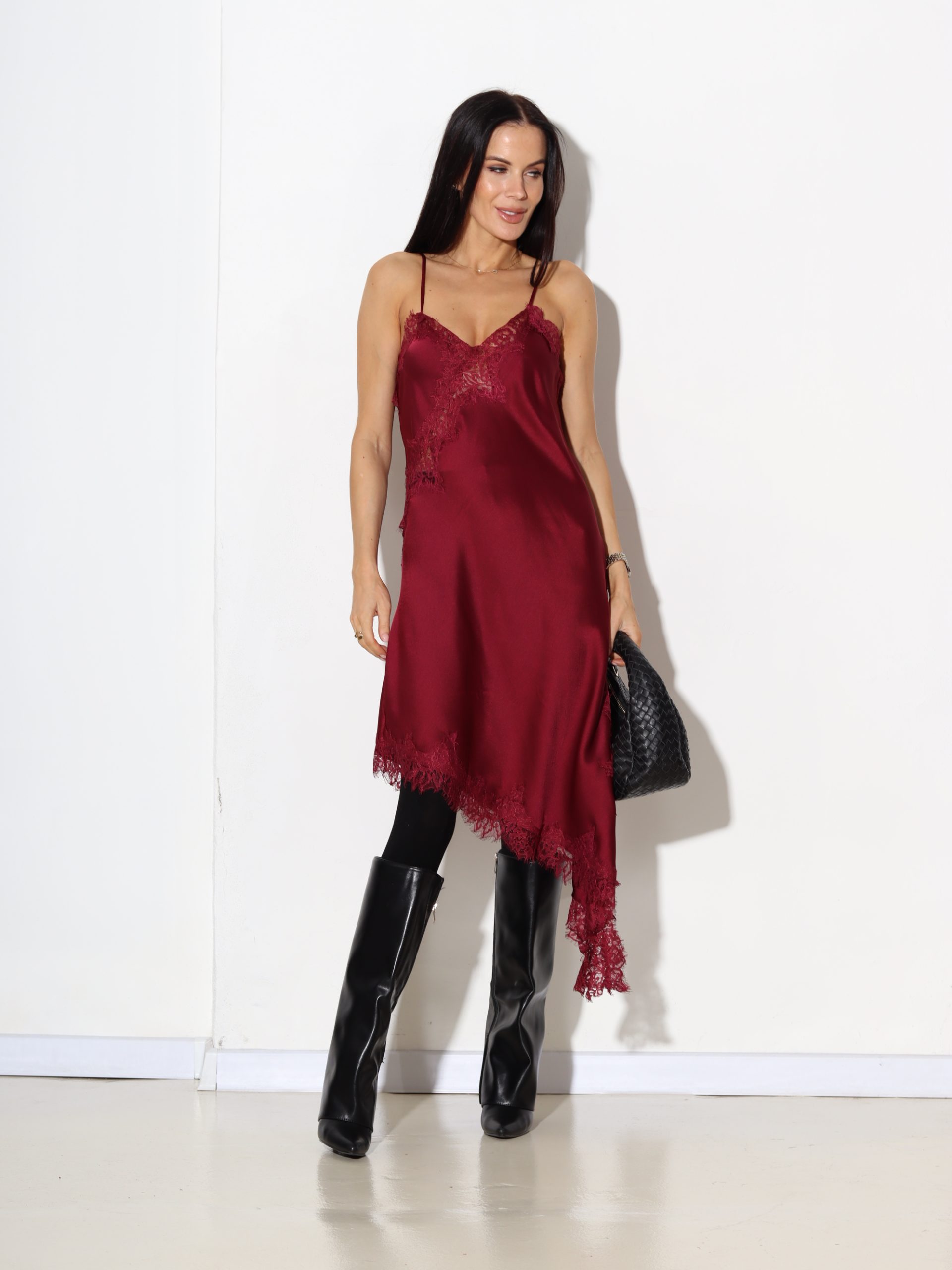 Sarkana atlasa kleita ar pagarinātu mežģīni – 17500