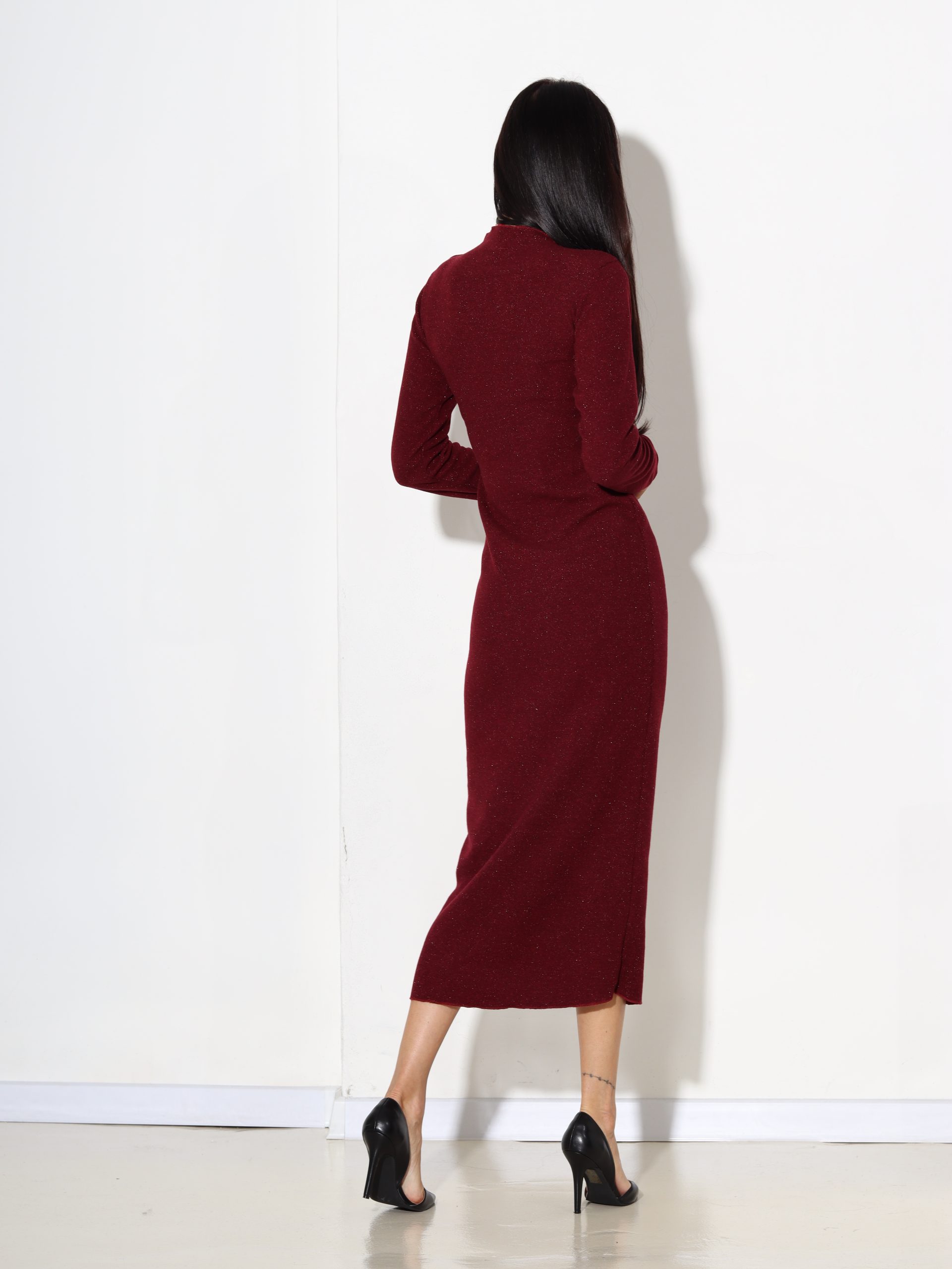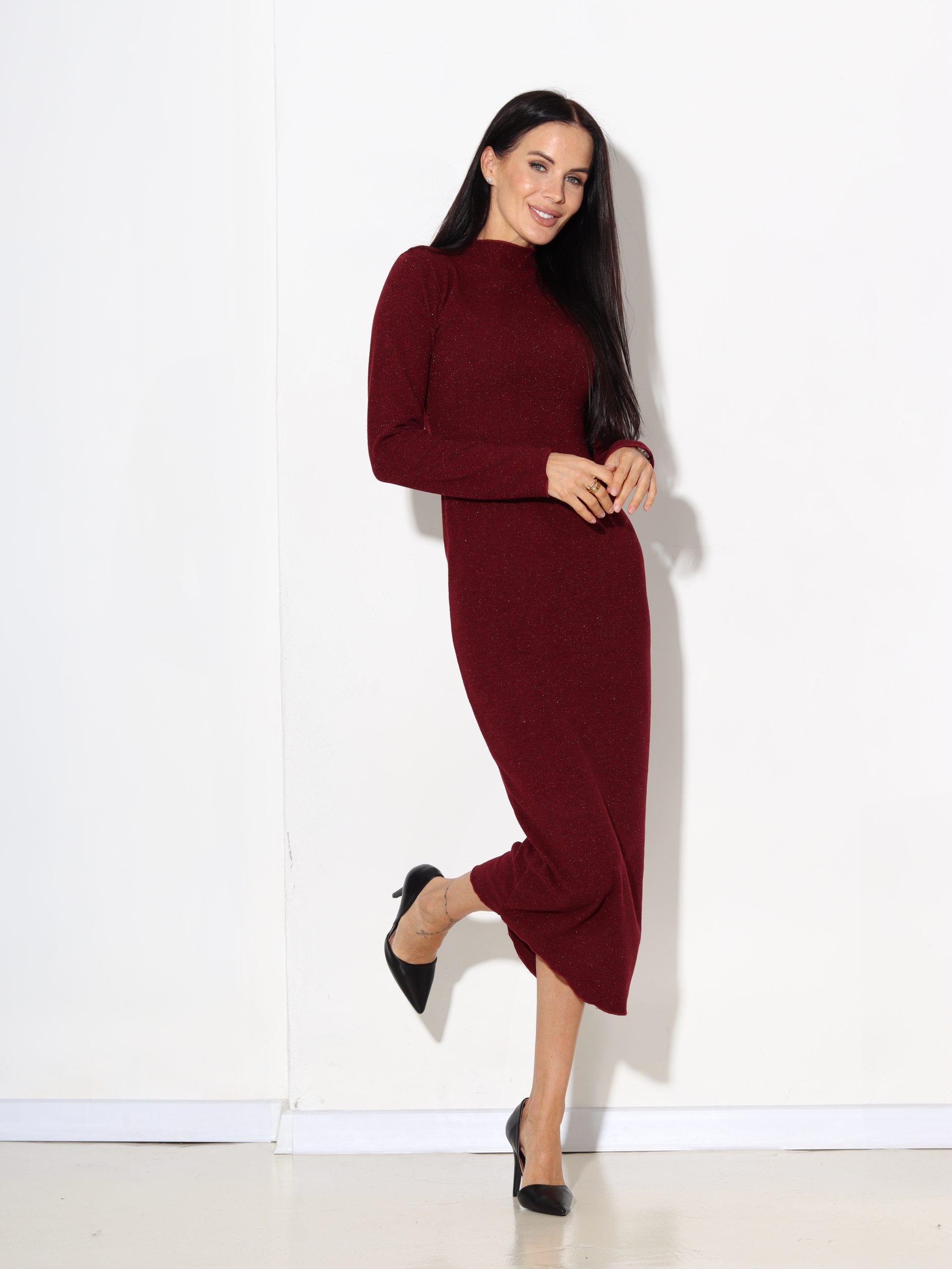 Midi garuma kleita adīta auduma ar iestrādātu mirdzošu diedziņu, kleita ir pieguļoša augumam, nav aizdares, mini paaukstinājuma apkakle, garas piedurknes