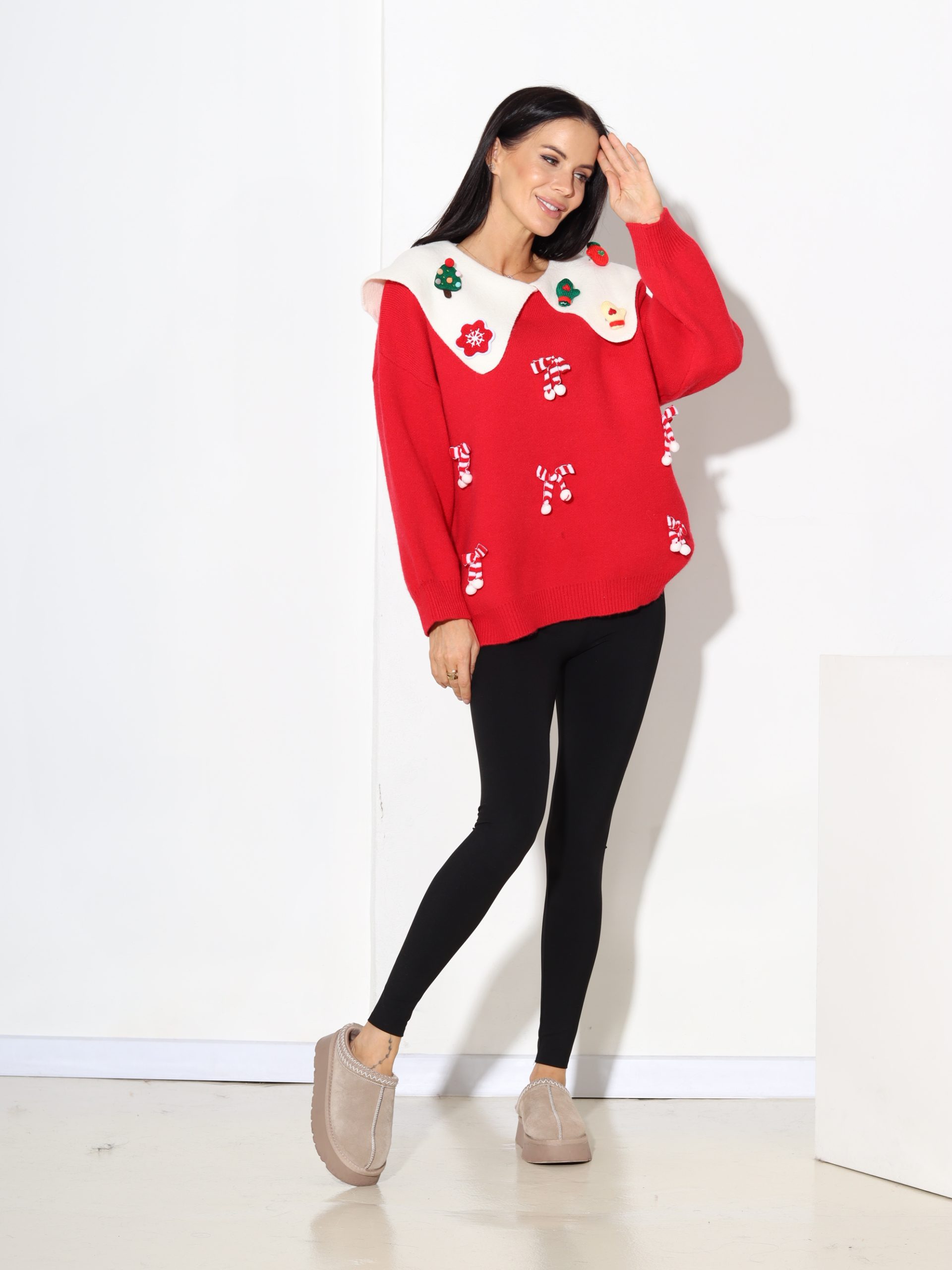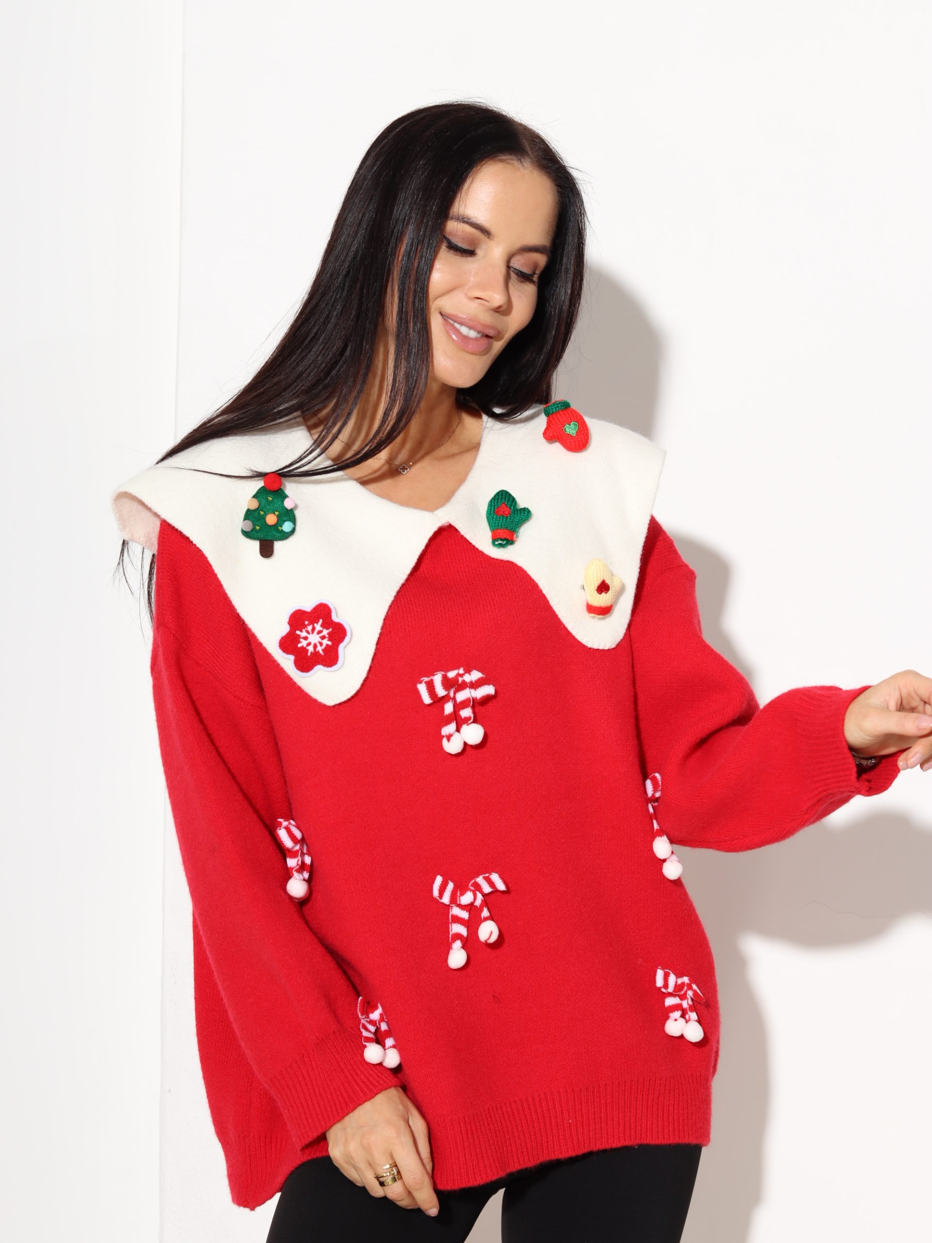 Sarkanas krāsas, adīts Ziemassvētku motīva džemperis ar baltas krāsas apkakli un adītām piespraudēm. Džemperim ir piešūtams bantītes.