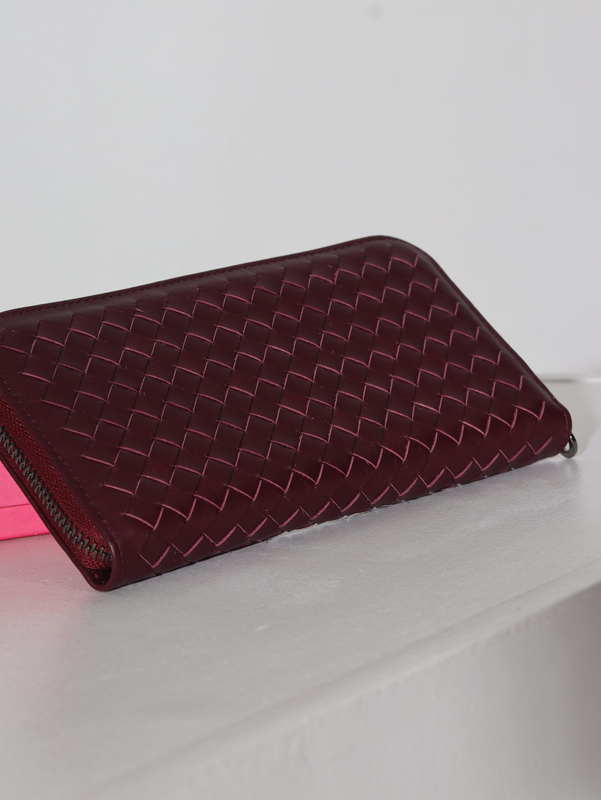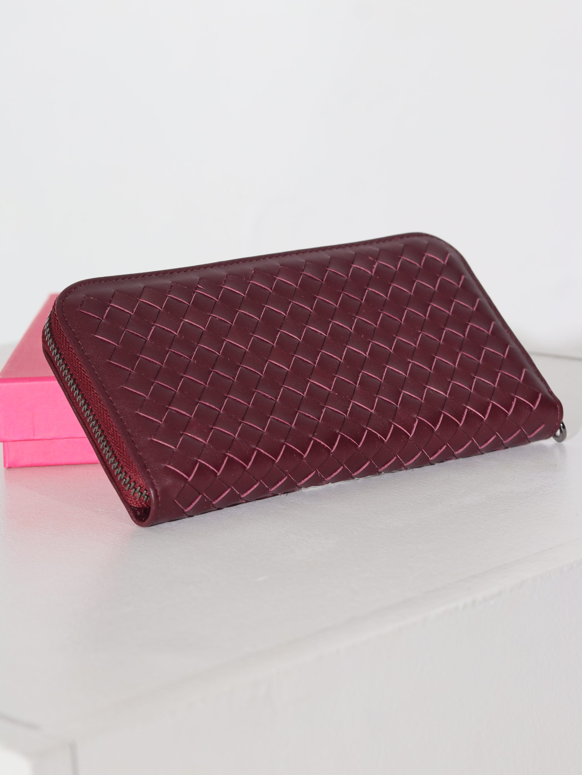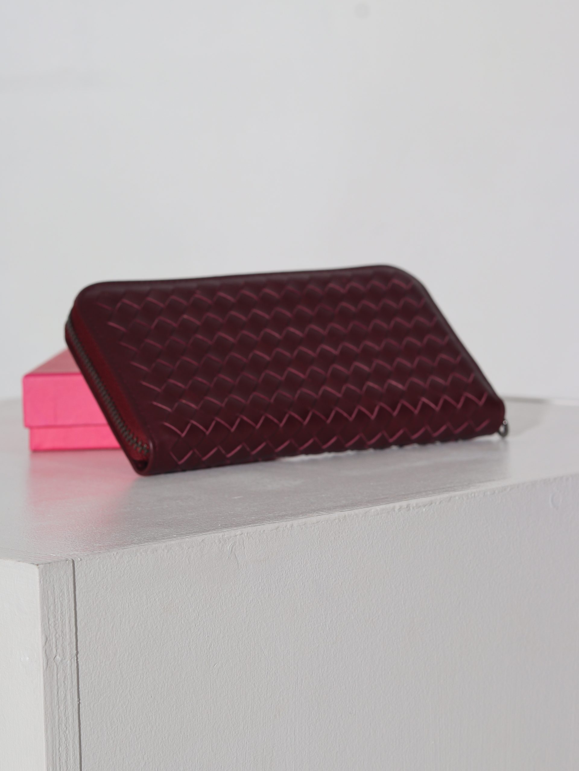 Dabīgās ādas maks ar tumši pelēkas krāsas rāvējslēdzēju aizdari. Makam ir pinuma dizains.