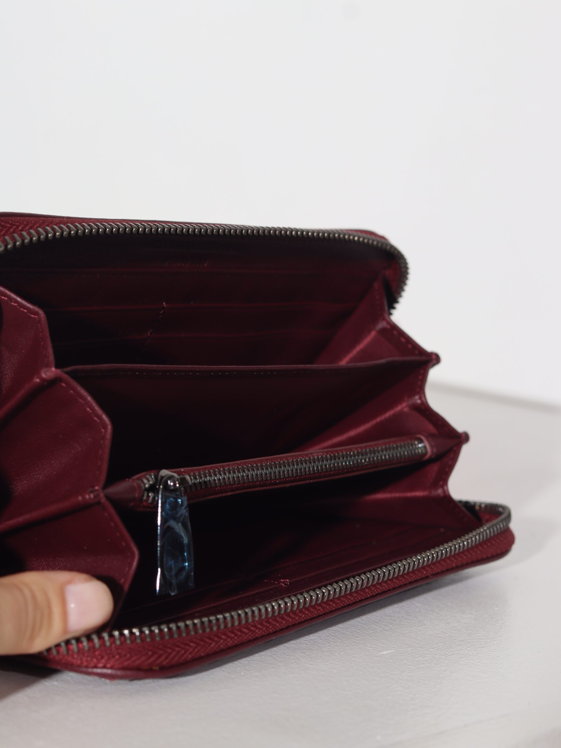 Iekšpusē ir trīs nodalījumi un viens ar rāvējslēdzēju aizverams nodalījums monētām. Sānos ir iestrādāti nodalījumi kartēm.