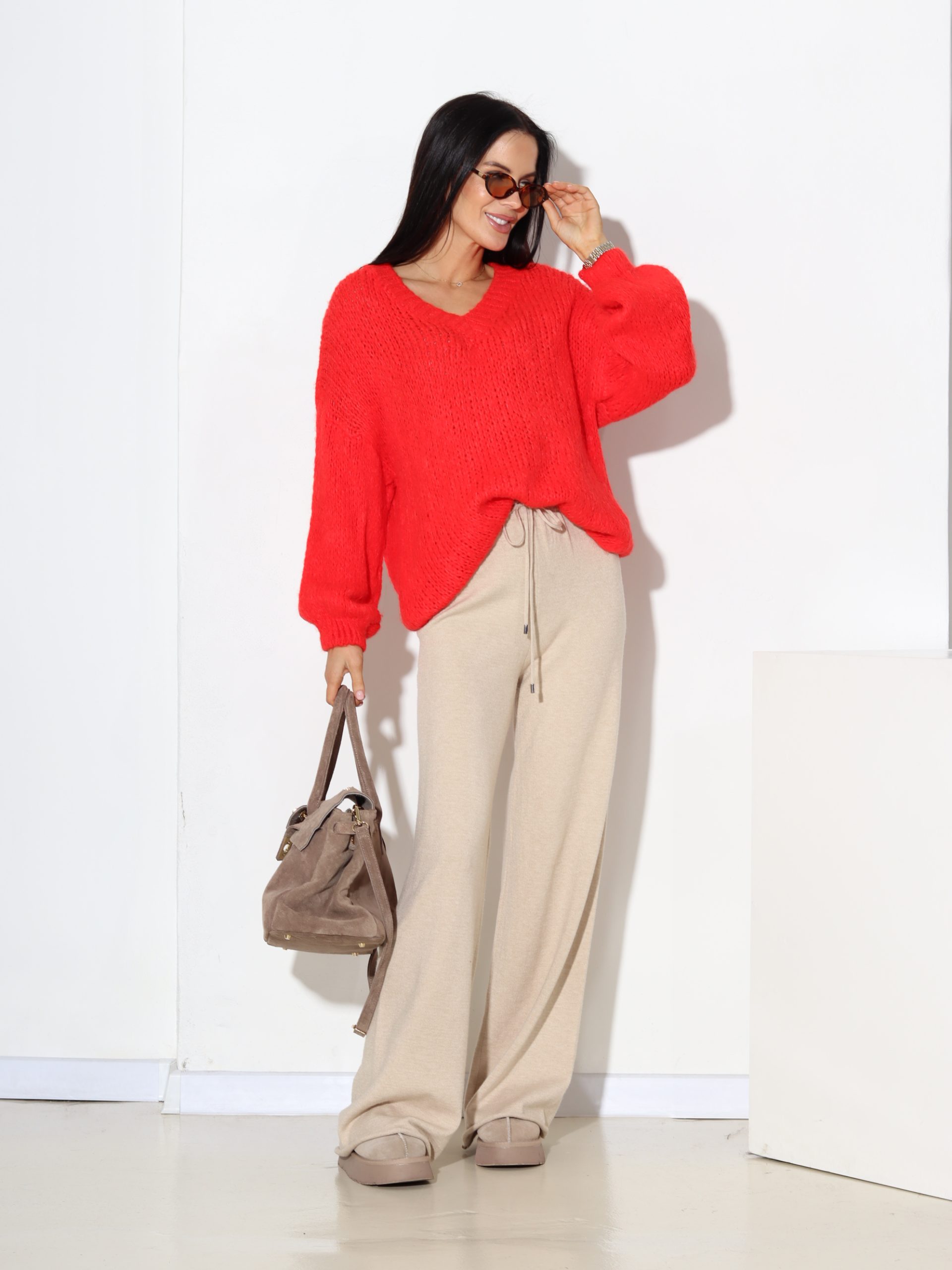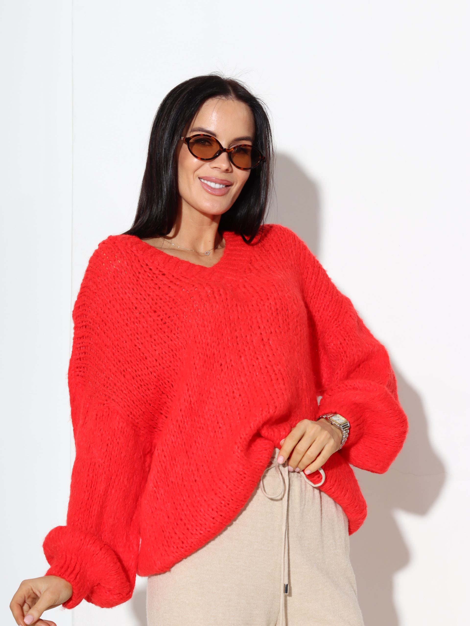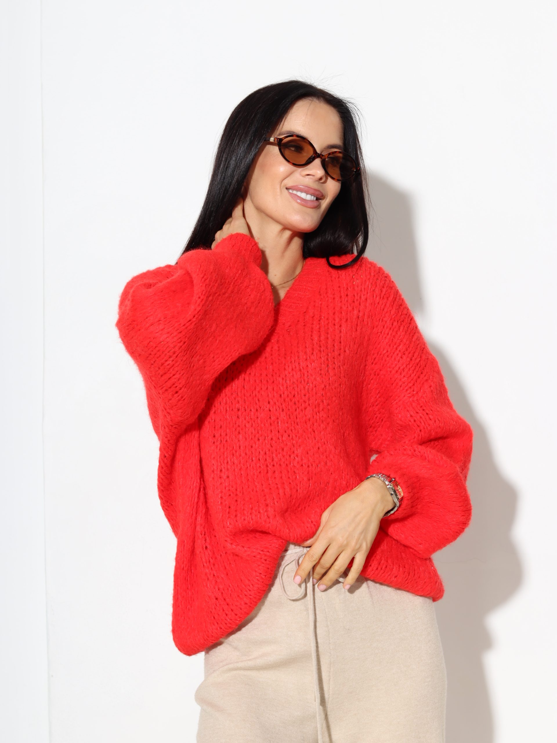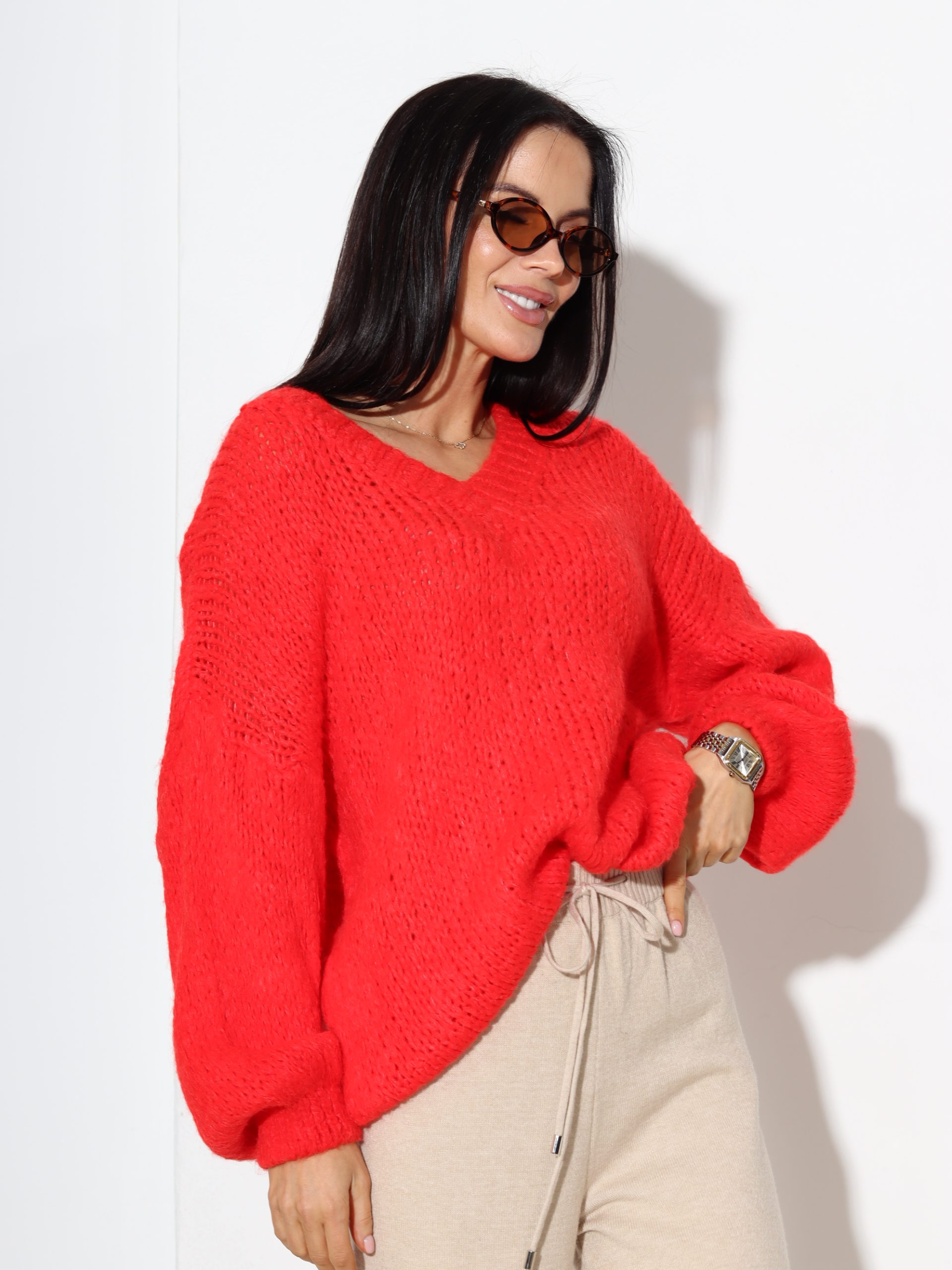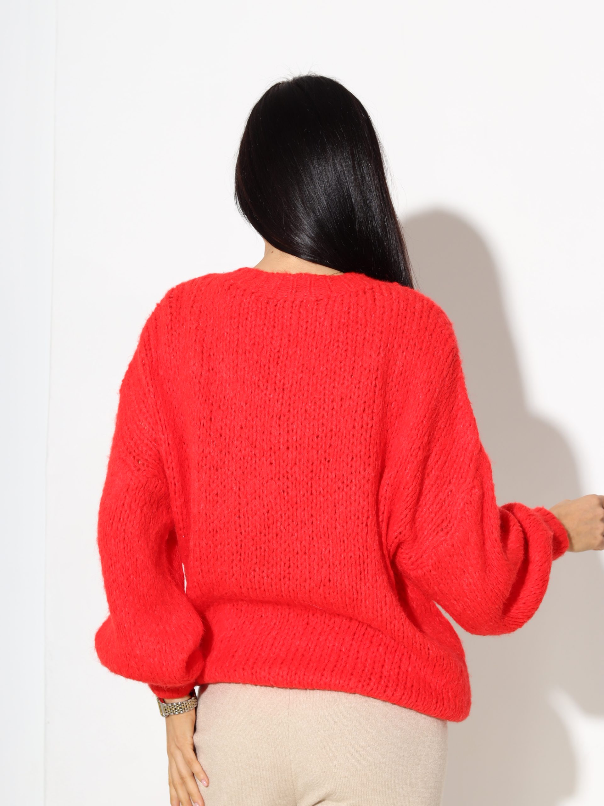 Sarkans džemperis, biezas dzijas adījums – 17398