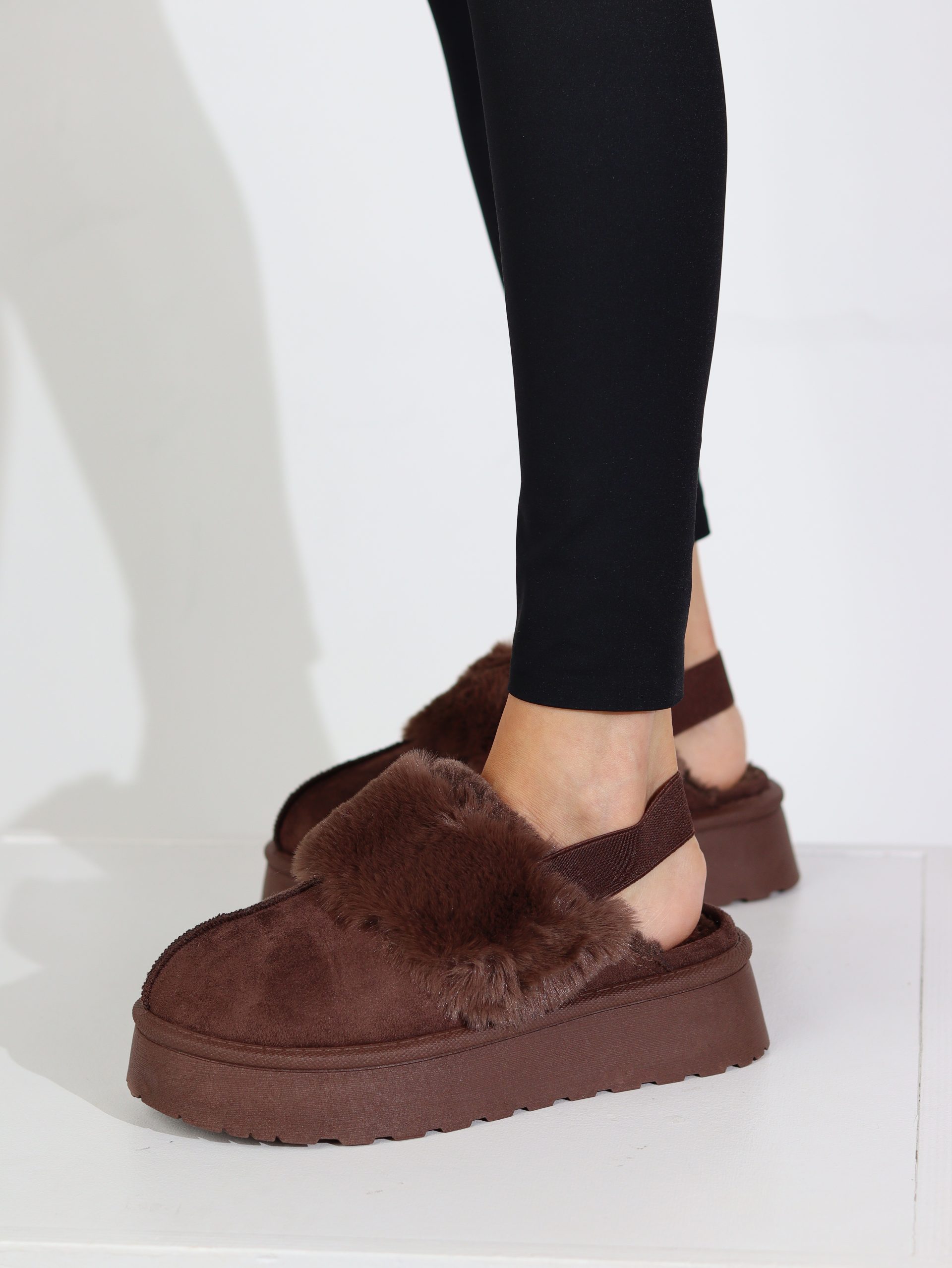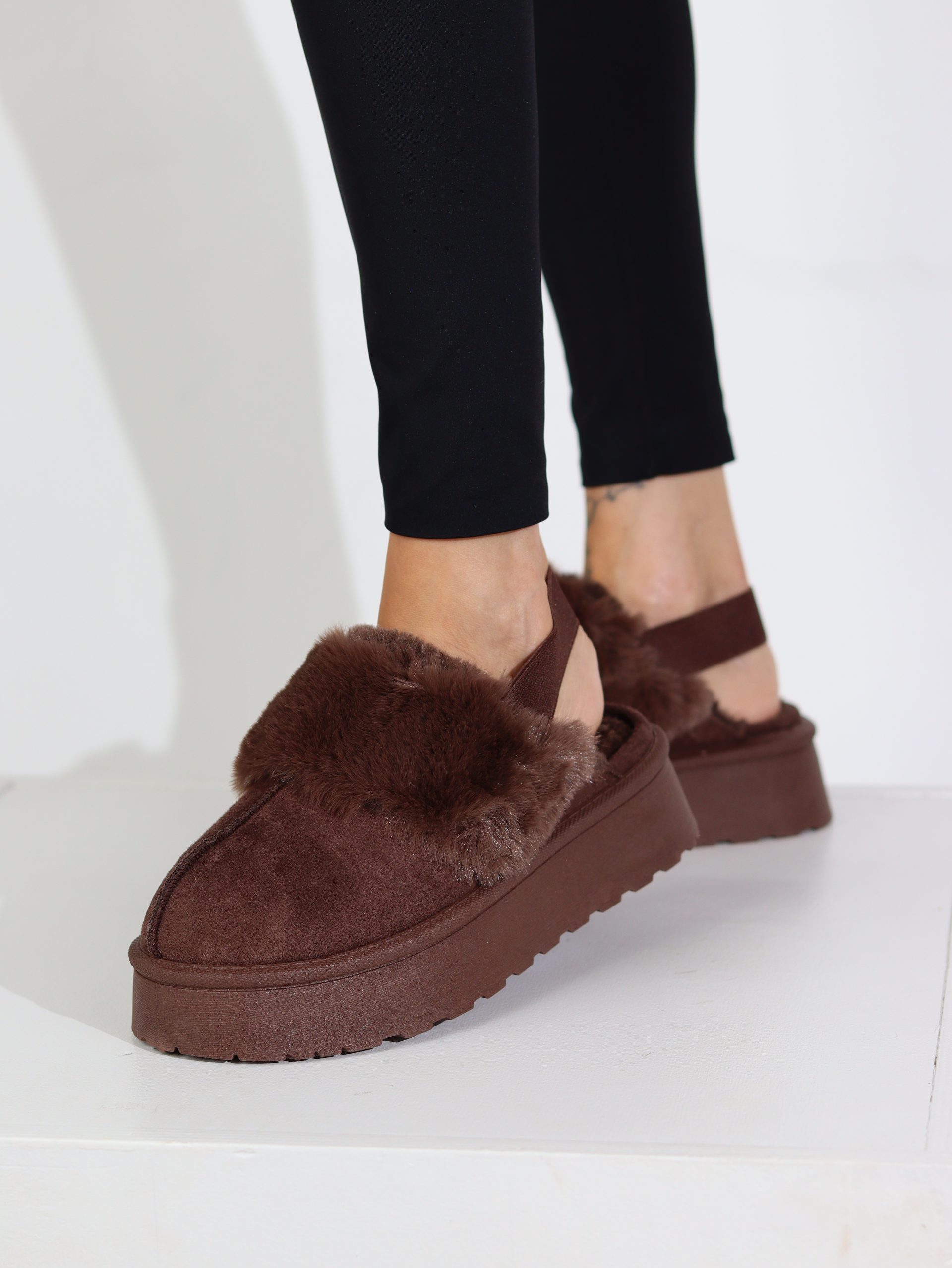 Mākslīgās zamšādas ,, Ugg” tipa apavi ar atvērtu papēža daļu un dekoratīvu pūciņu apavu priekšpusē. Čībiņām ir gumija papēdī ir  siltinājums un paaugstināta zole.