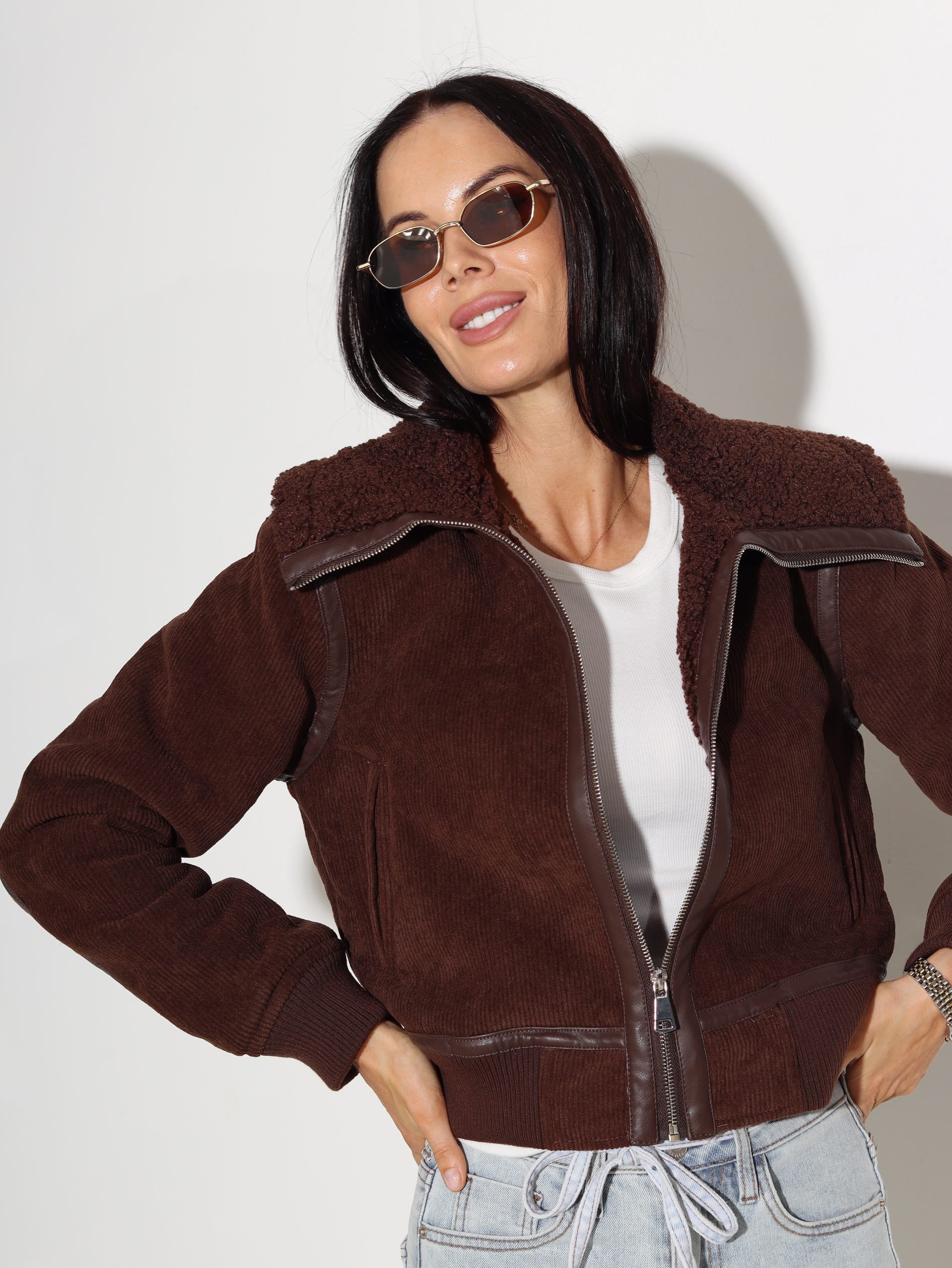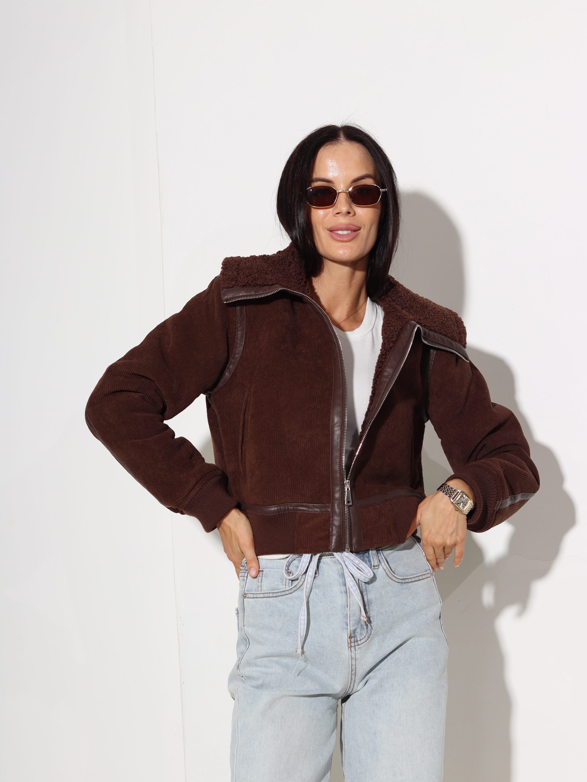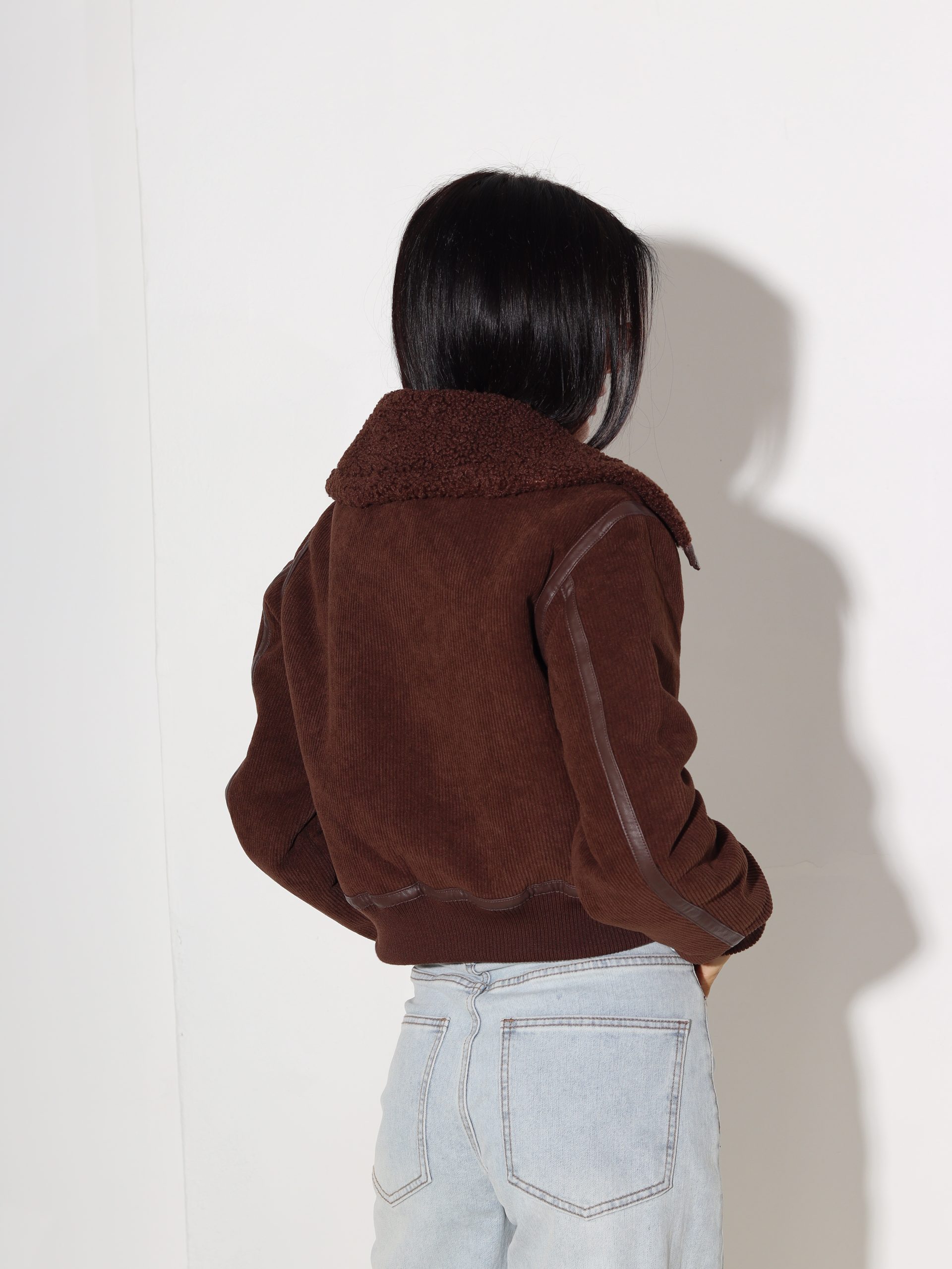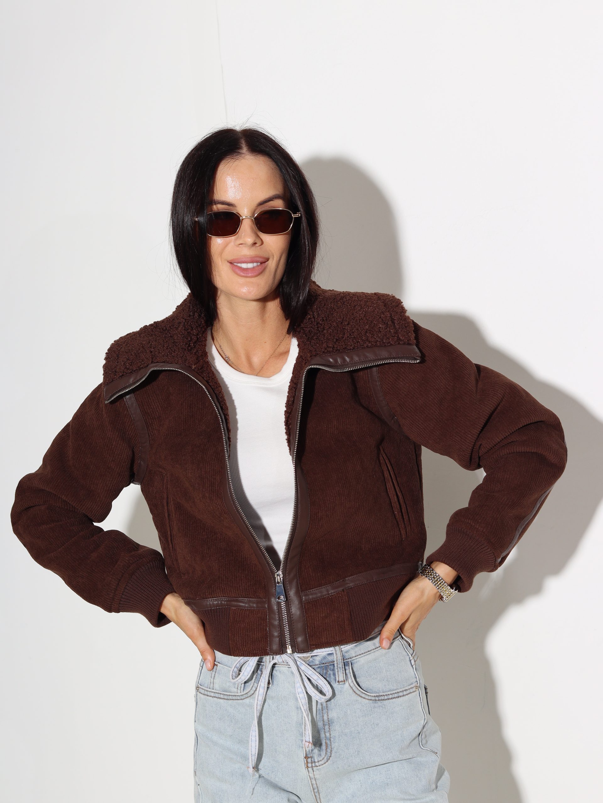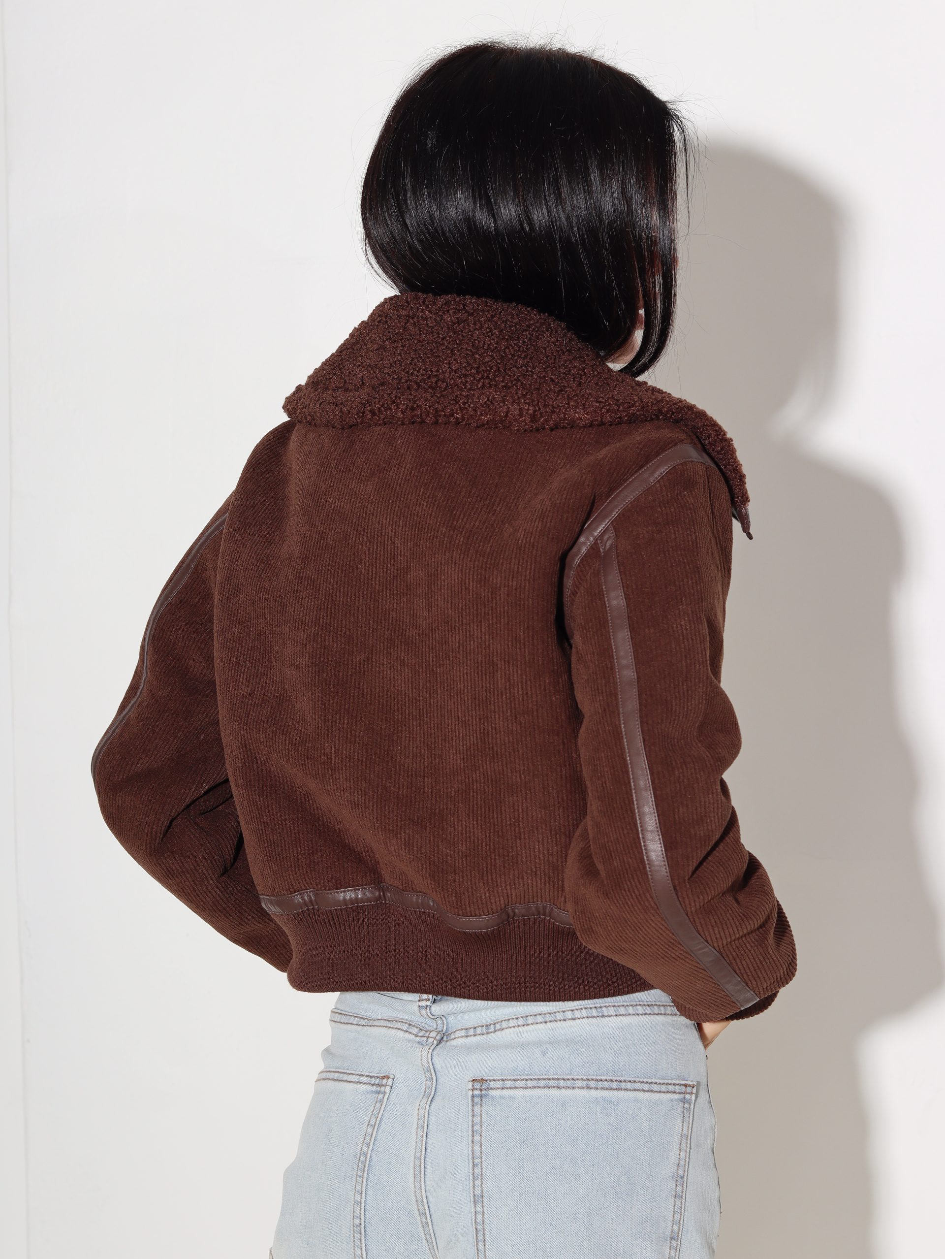 Šoko/ brūnas kāsas , bieza velveta auduma bombertipa jaka ar pieskaņotas krāsas siltinājumu iekšpusē un apkakli.