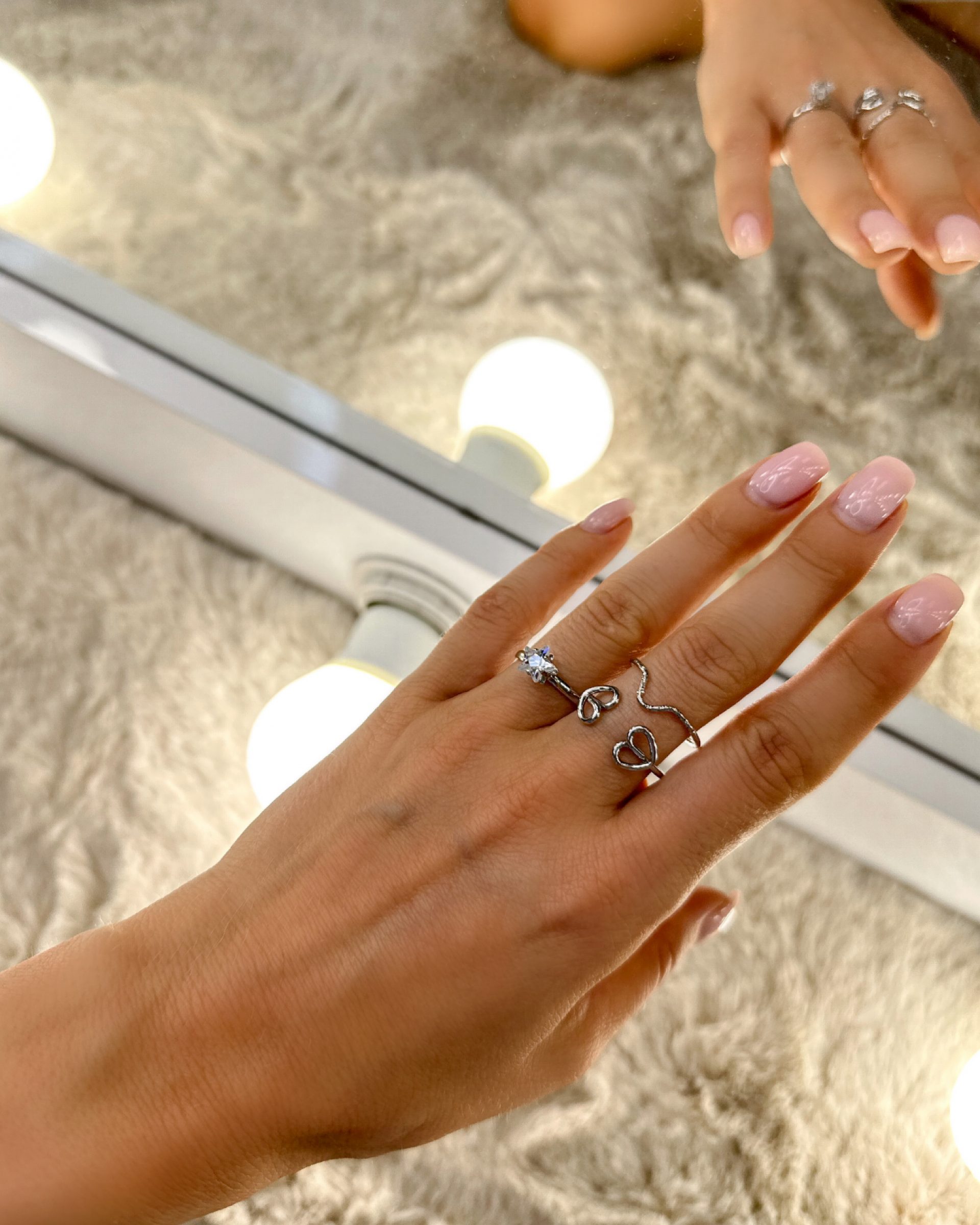 Sudraba krāsas 3 gredzenu komplektā pirmajam un trešajam gredzenam ir regulējams izmērs.