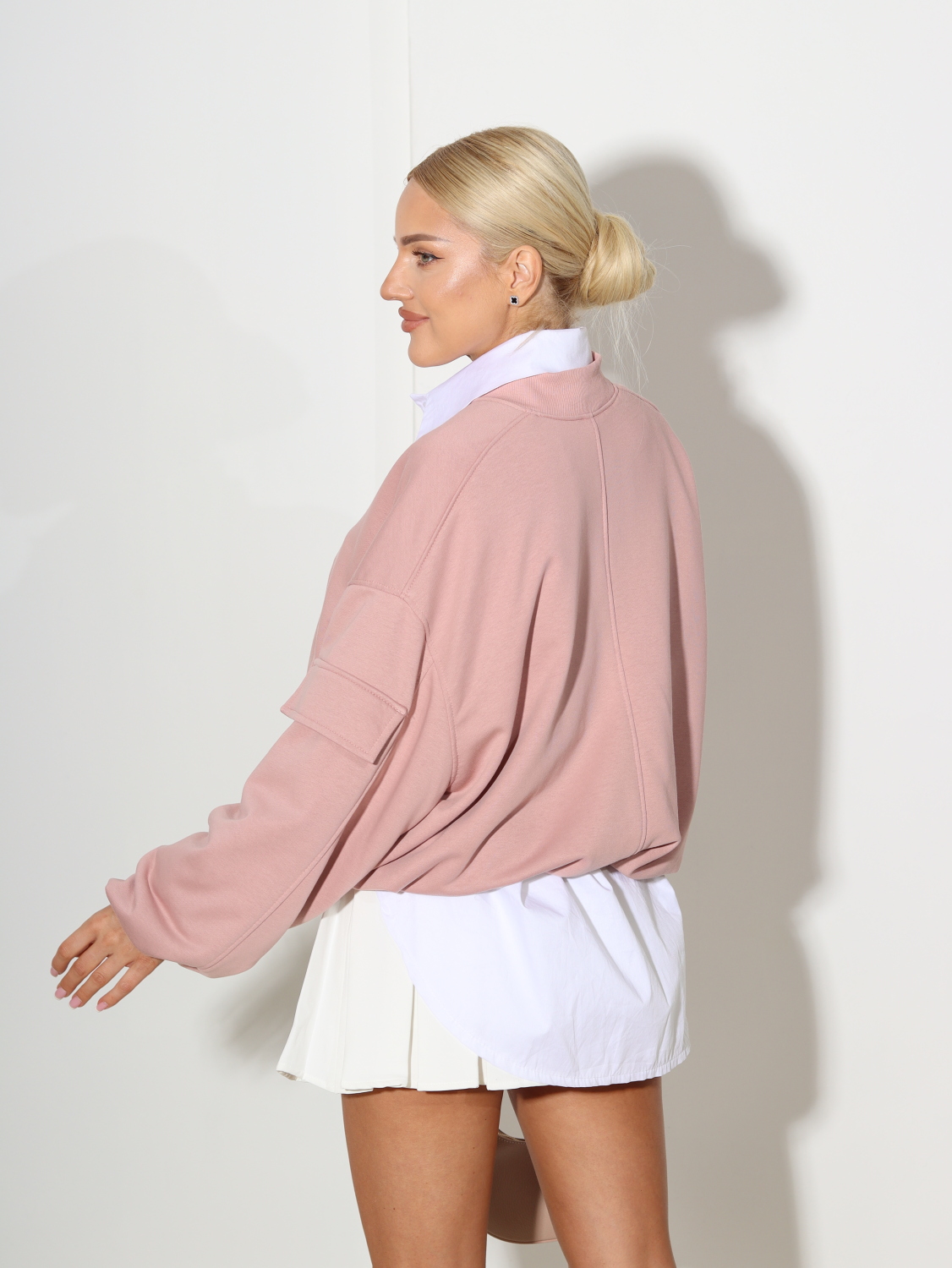 Vienkrāsaina auduma, īsa bomber tipa jaka, saturošu savilkumu apakšdaļā, aizdare ar rāvējslēdzēju, jakai ir odere un noapaļota kakla daļa