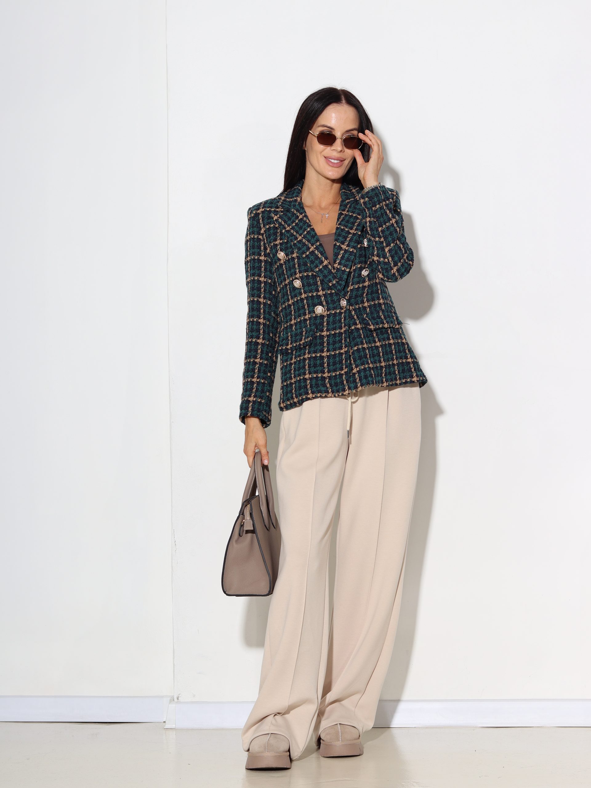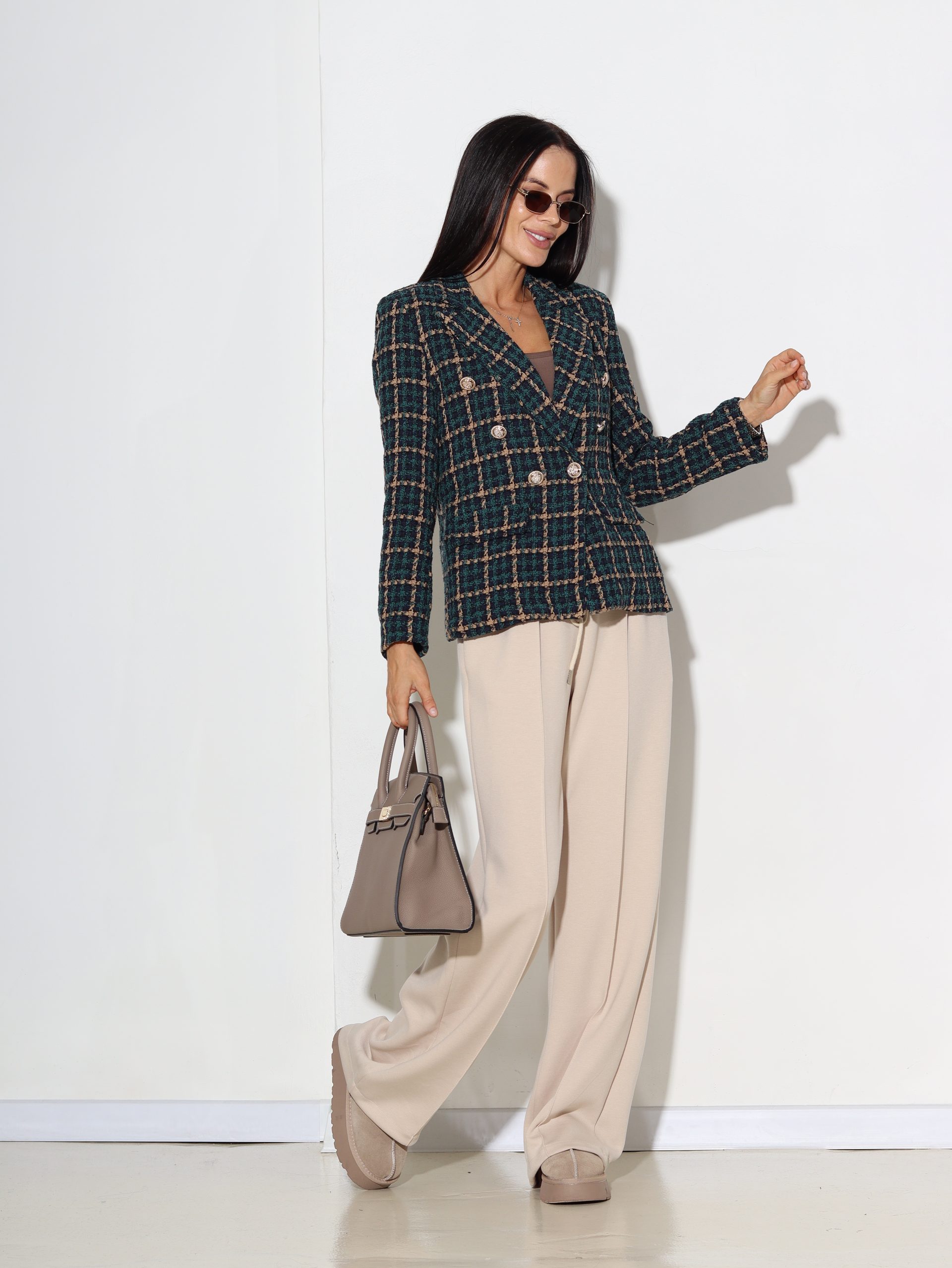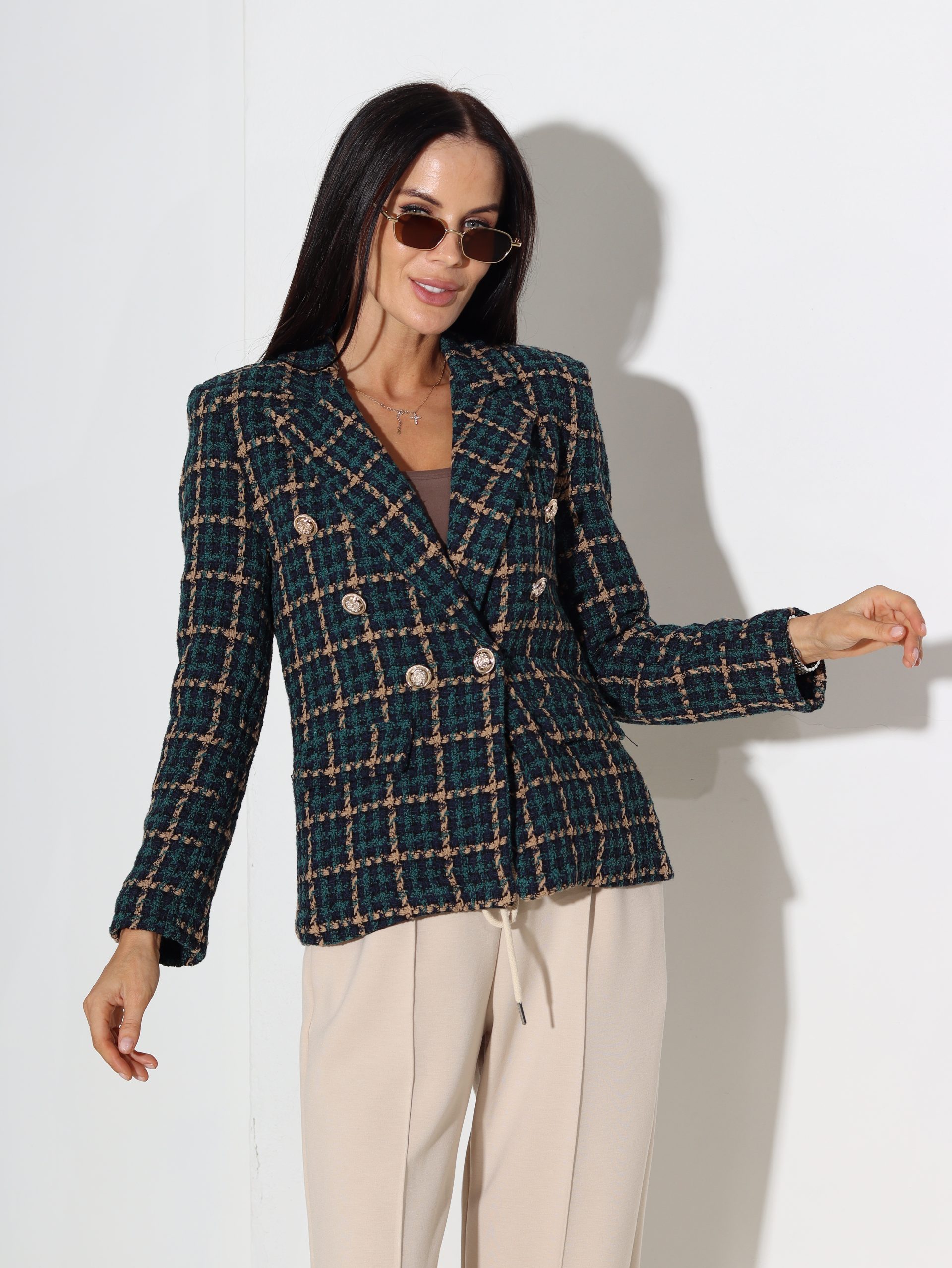 Tvīda auduma , rūtaina raksta žakete ar 6 zelta krāsas pogām ( 5 no tām ir dekoratīvas). Priekšpusē žaketei ir divas dekoratīvas kabatas un plecu daļā ir iestrādāti polsteri. Žaketes iekšpusē ir iestrādāta odere.