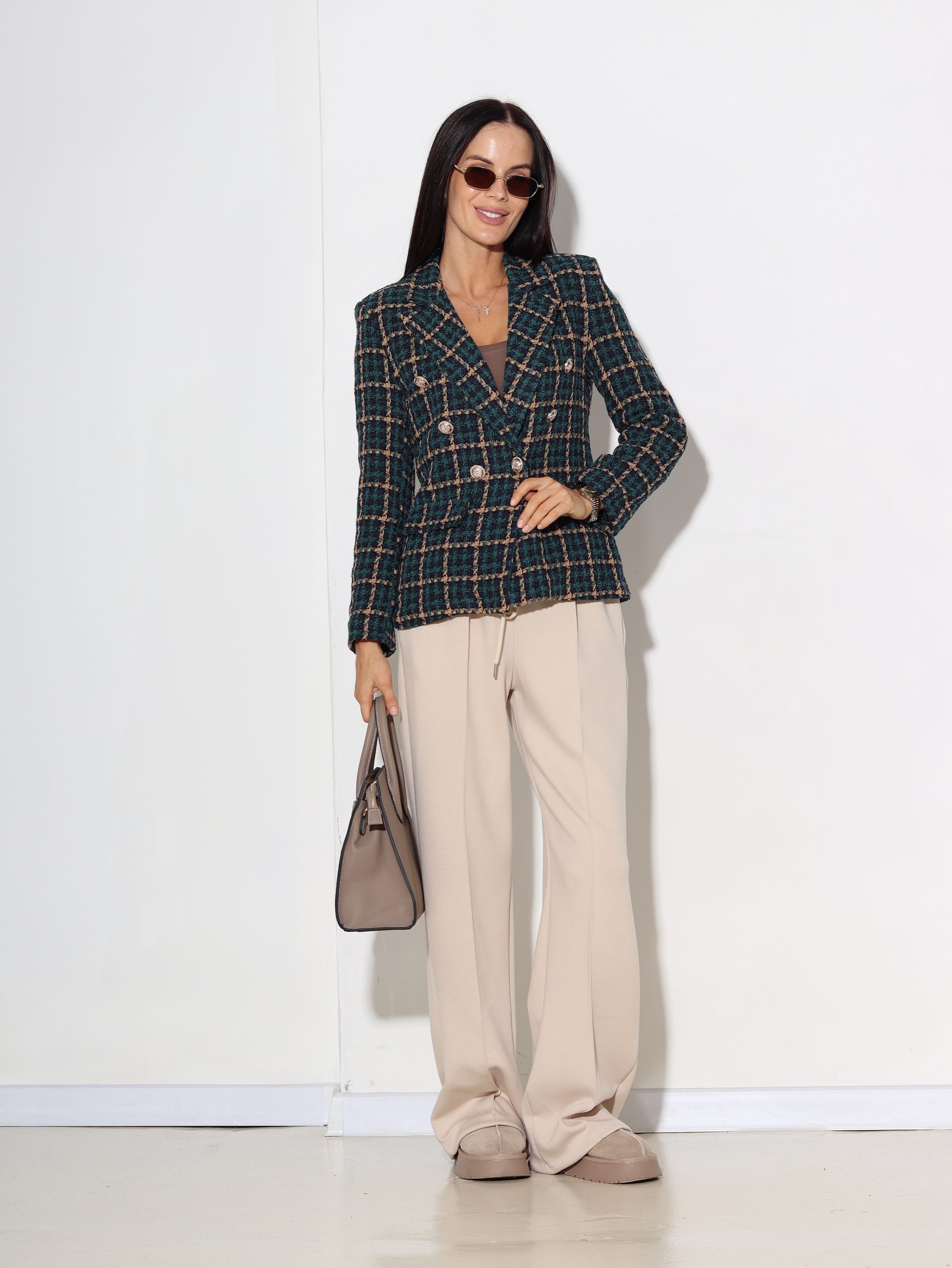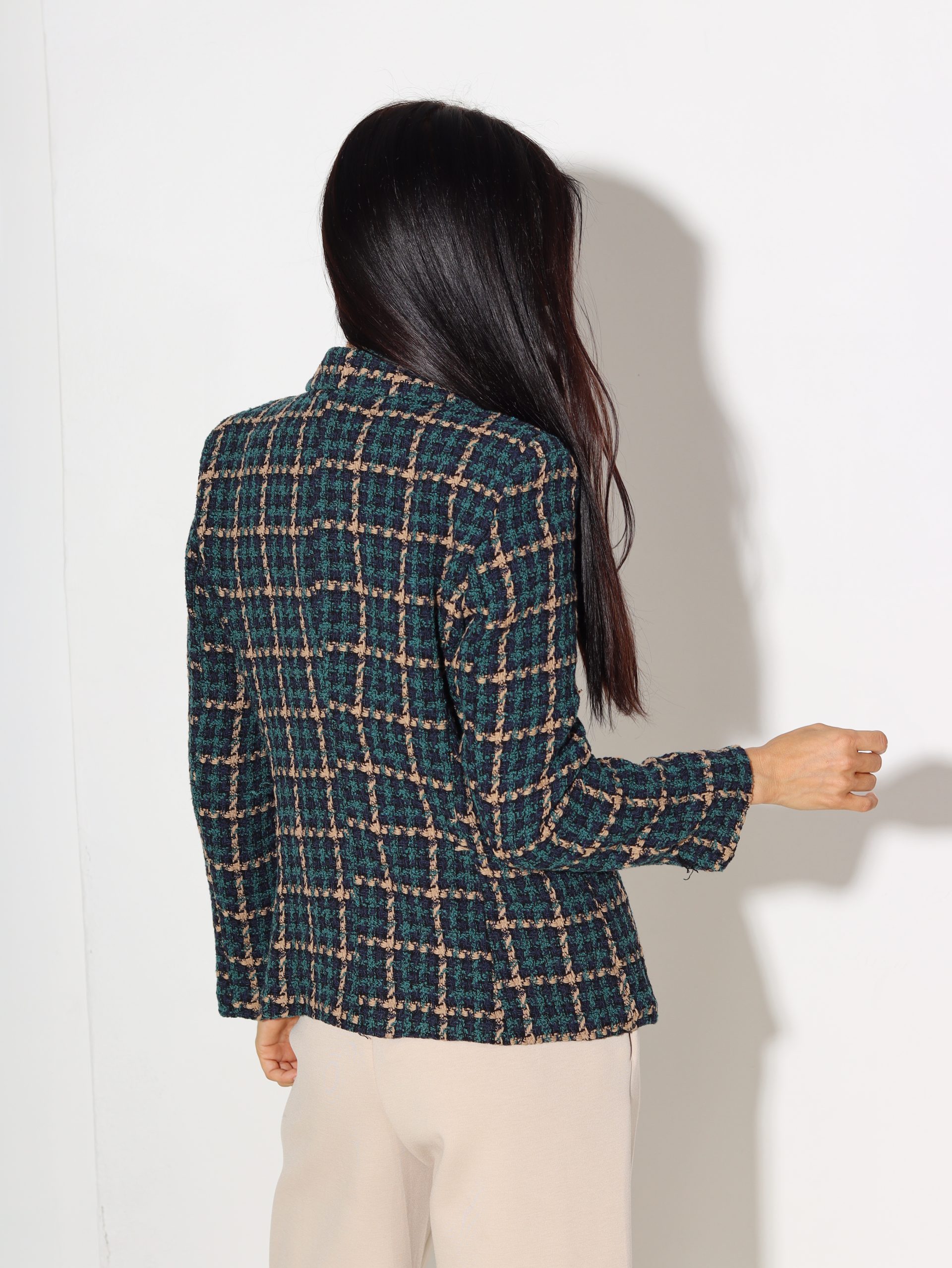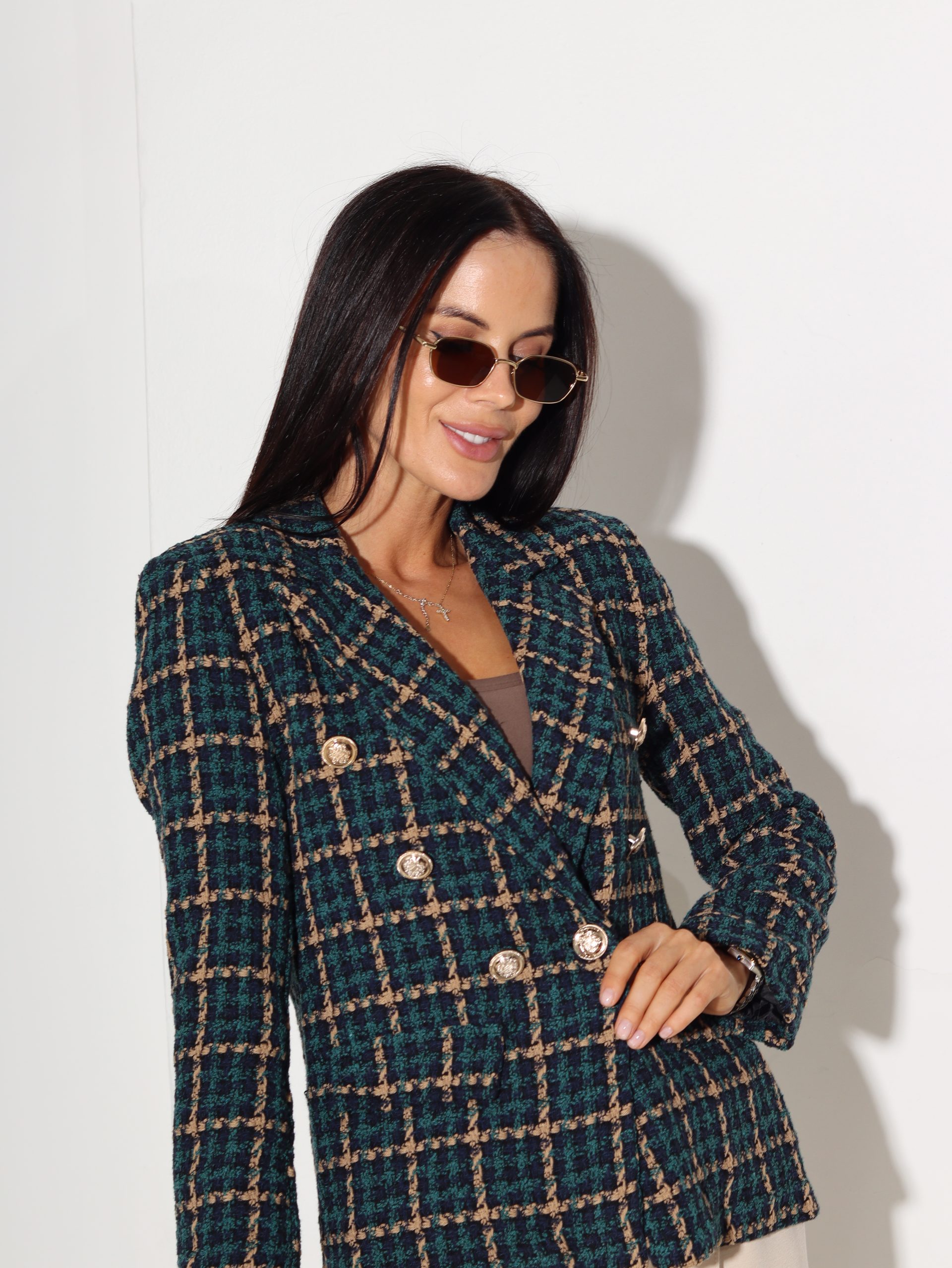 Tvīda auduma , rūtaina raksta žakete ar 6 zelta krāsas pogām ( 5 no tām ir dekoratīvas). Priekšpusē žaketei ir divas dekoratīvas kabatas un plecu daļā ir iestrādāti polsteri. Žaketes iekšpusē ir iestrādāta odere.