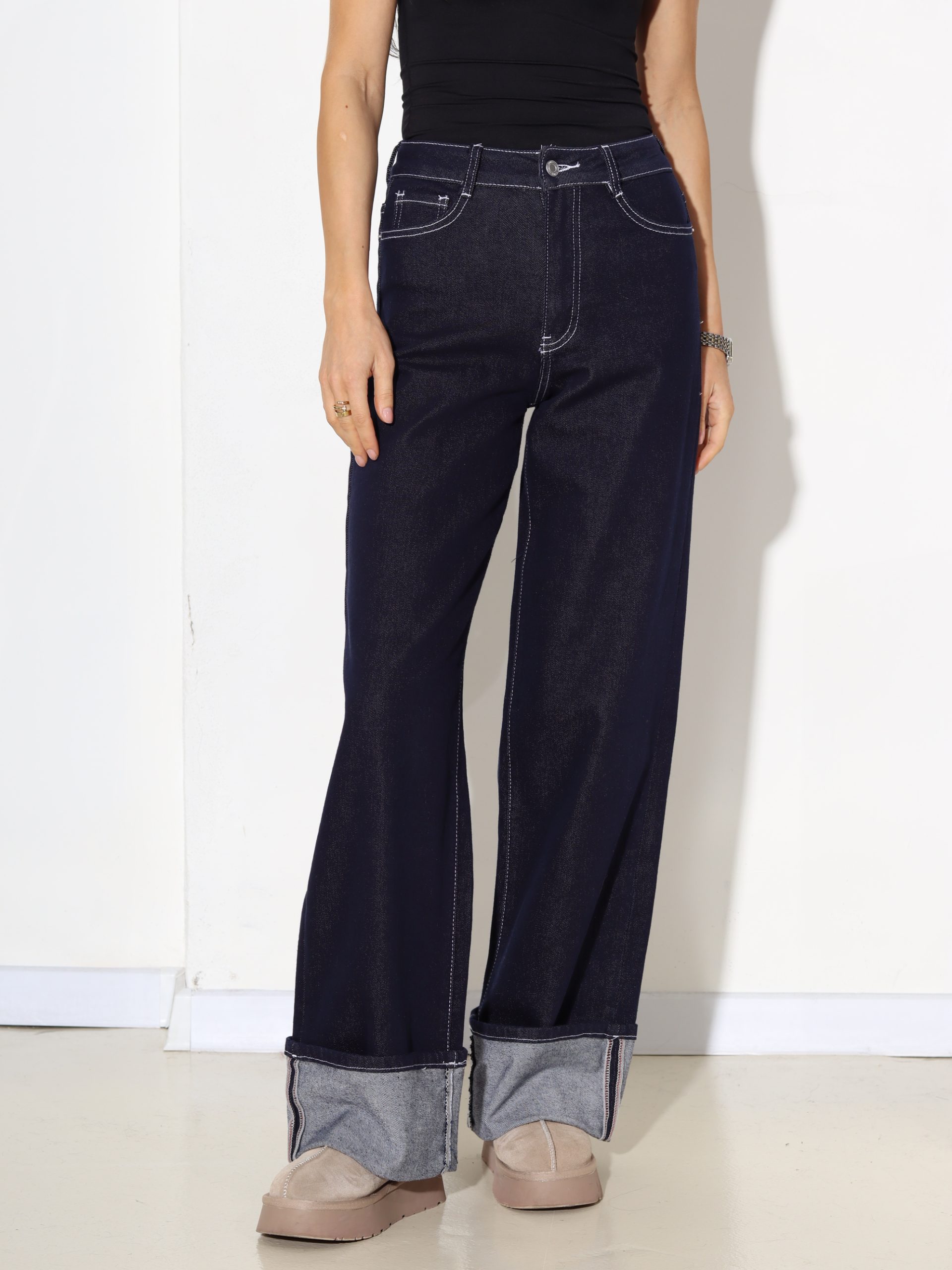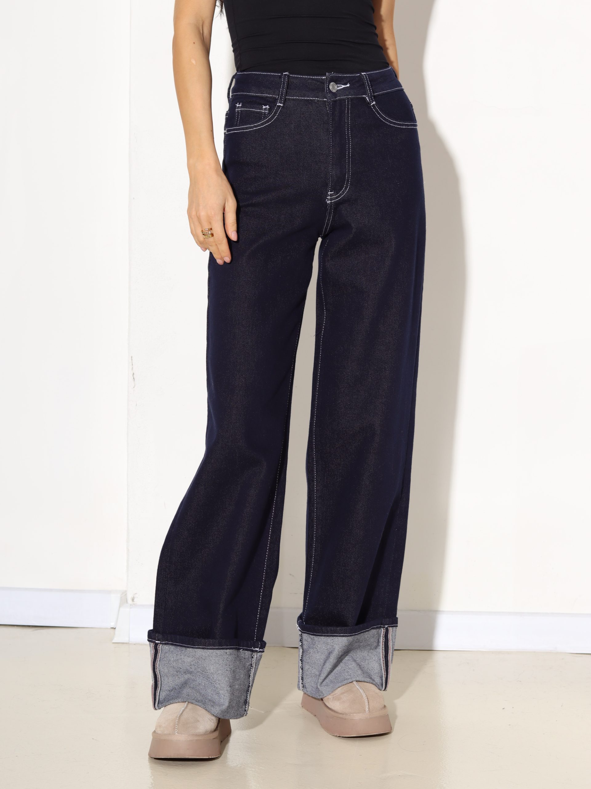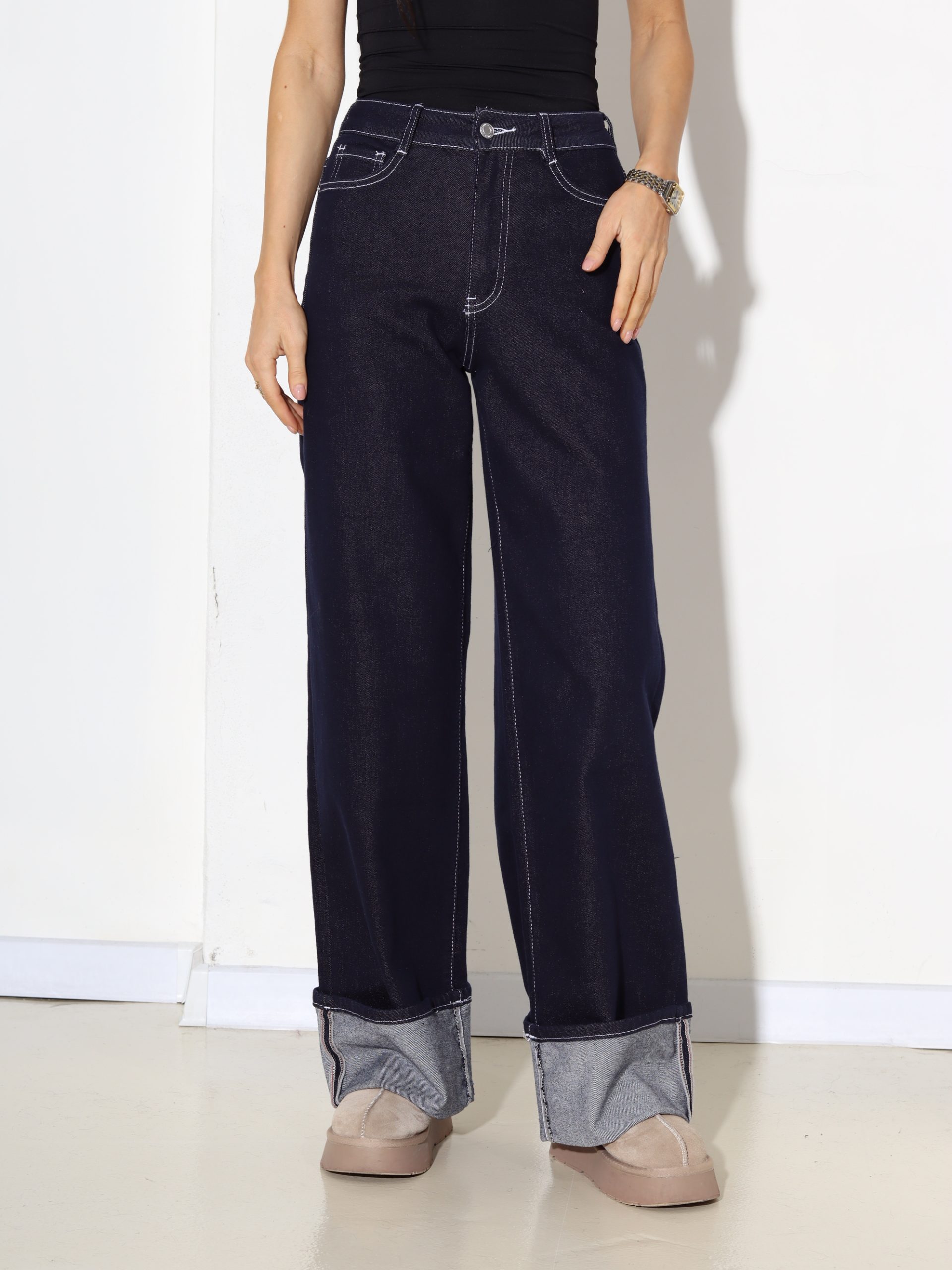 Tumši zilas krāsas, ,Dad Fit’ modeļa džinsu bikses ar baltas krāsas diega šuvju vietām. Bikšu galos ir piešūtas atloks.