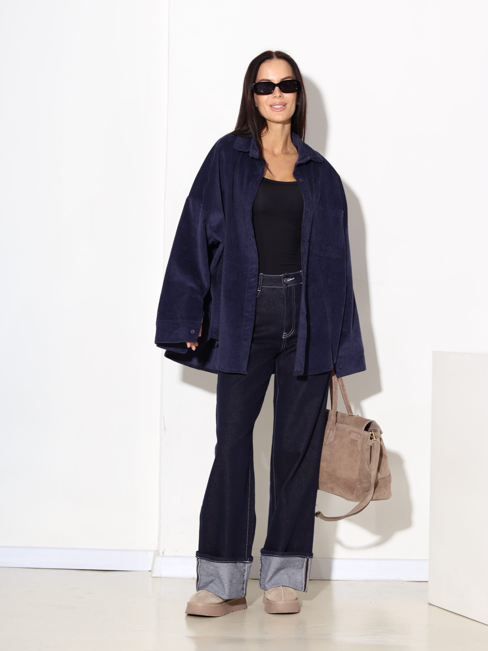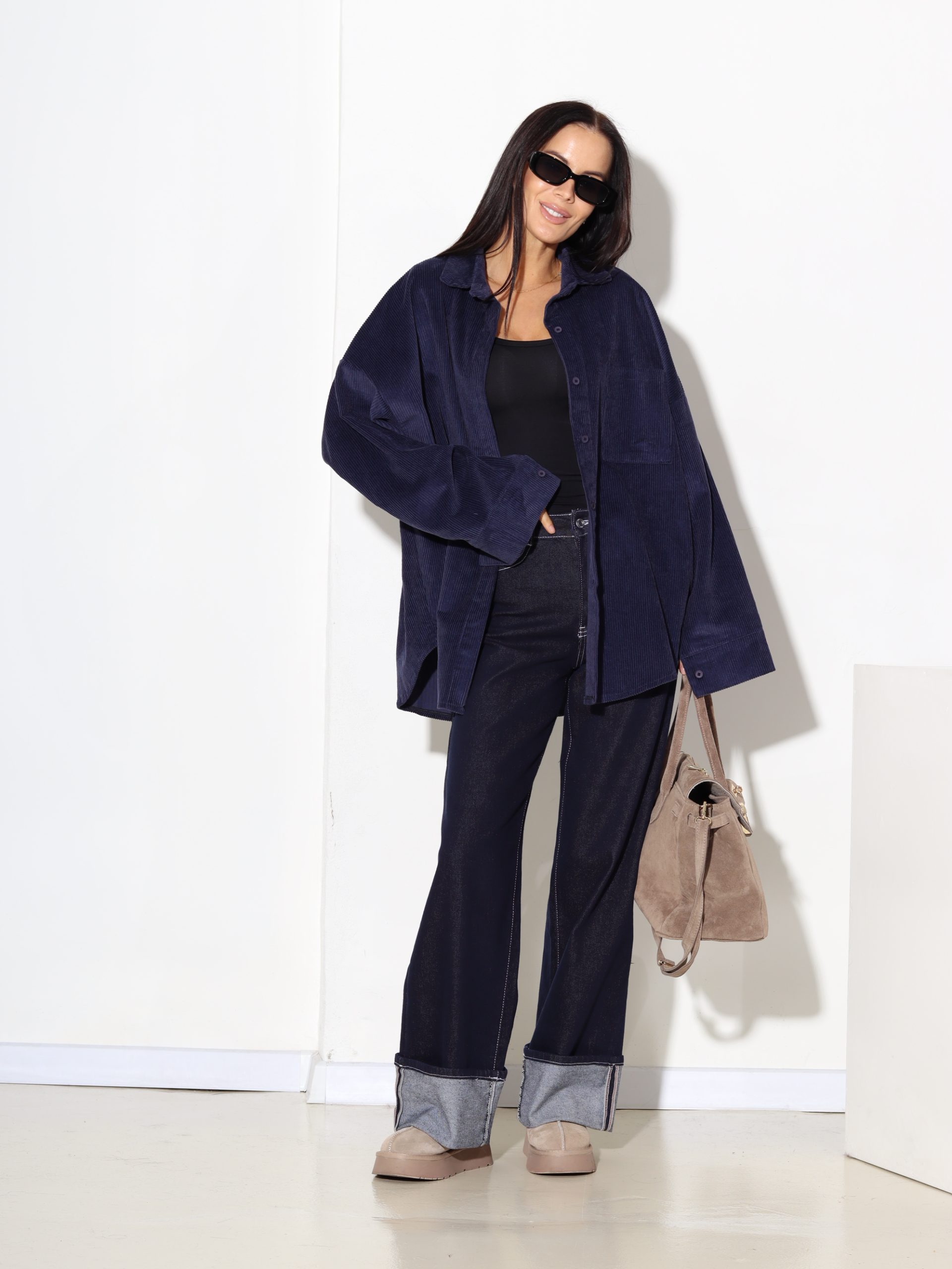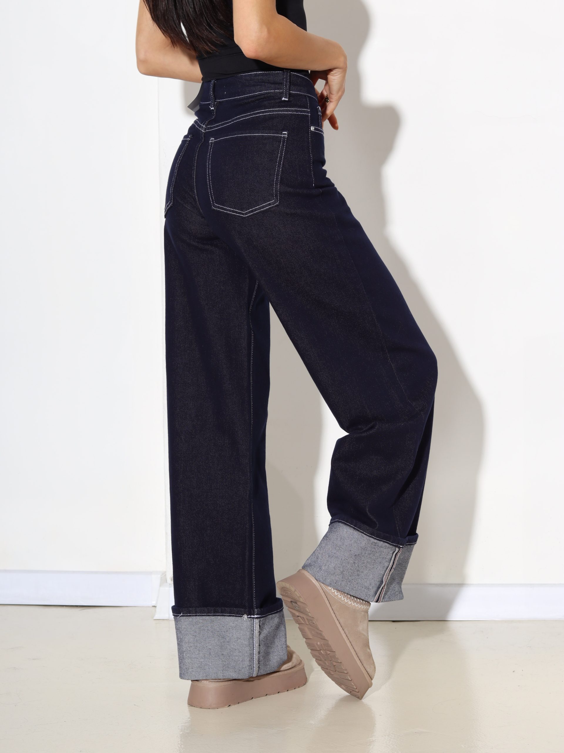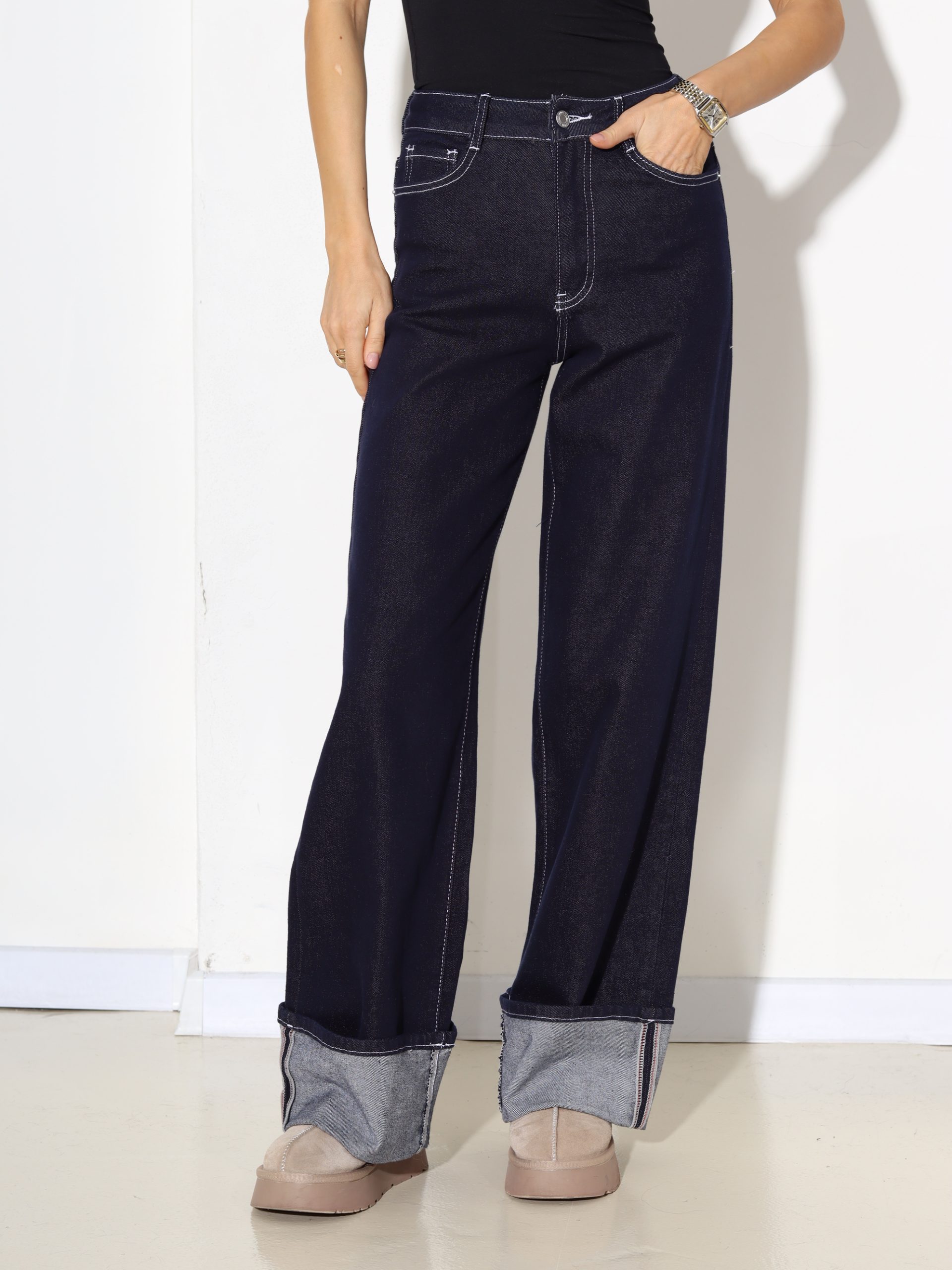 Tumši zilas krāsas, ,Dad Fit’ modeļa džinsu bikses ar baltas krāsas diega šuvju vietām. Bikšu galos ir piešūtas atloks.