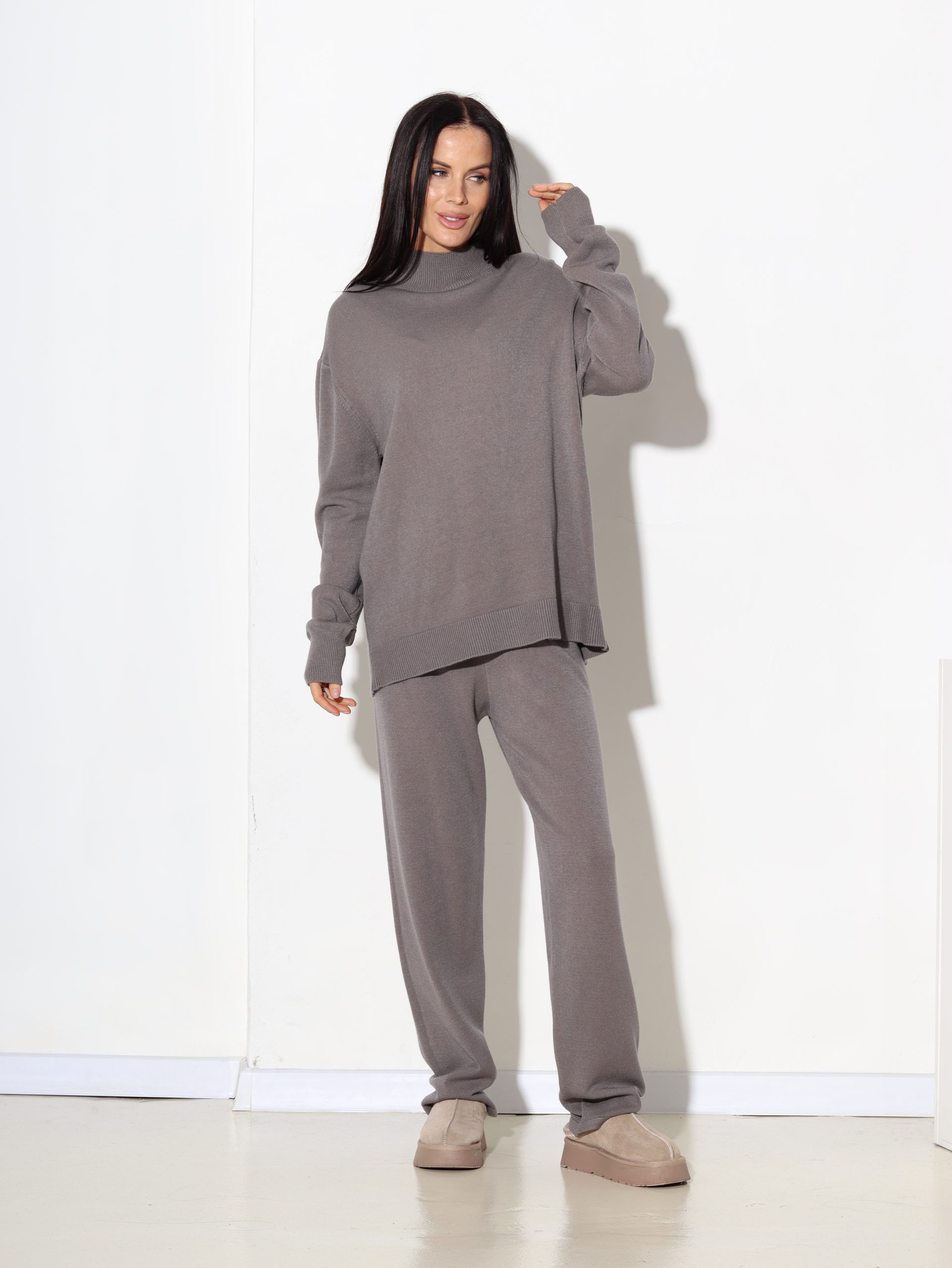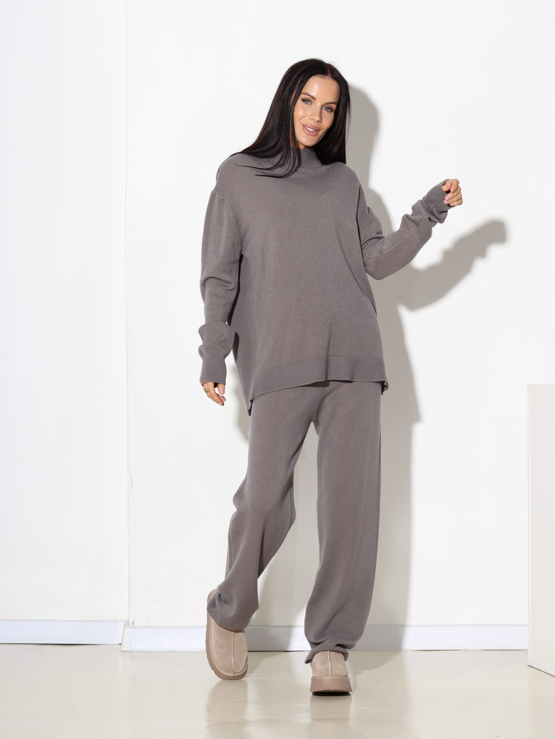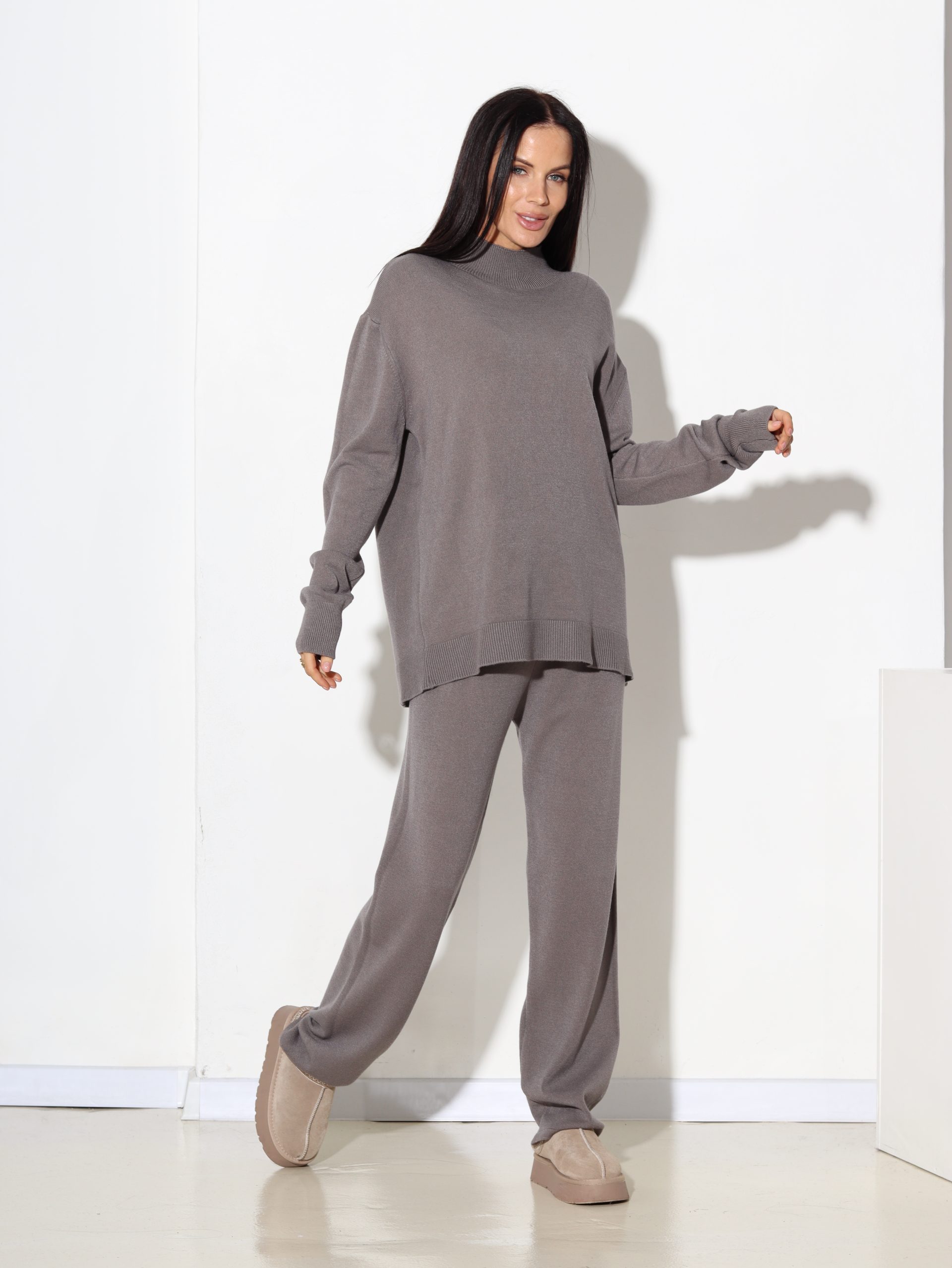 Blīva adījuma komplekts, kurā ietilpst džemperis un bikses. Džemperītim ir mini paaukstināta apkakle, brīvas piegrieznes modelis. Bikses paplatinātas, augšpusē ir iestrādāta gumija.