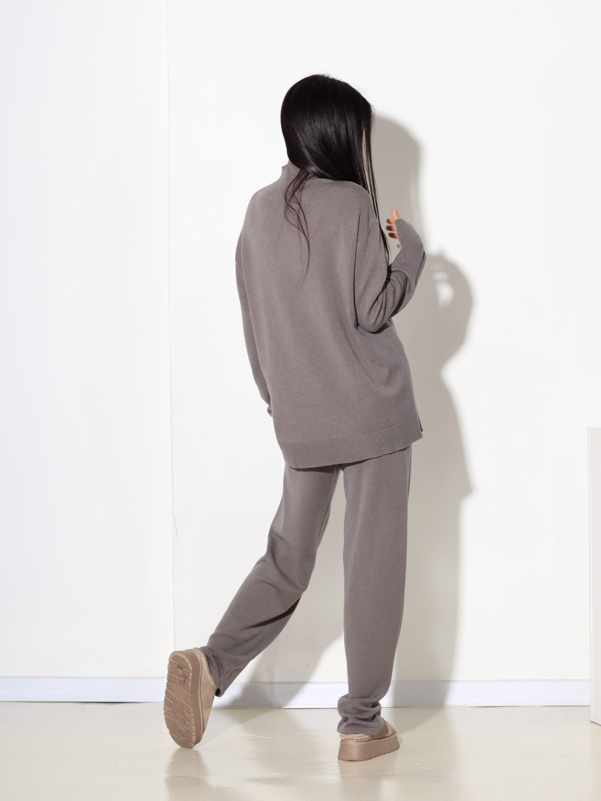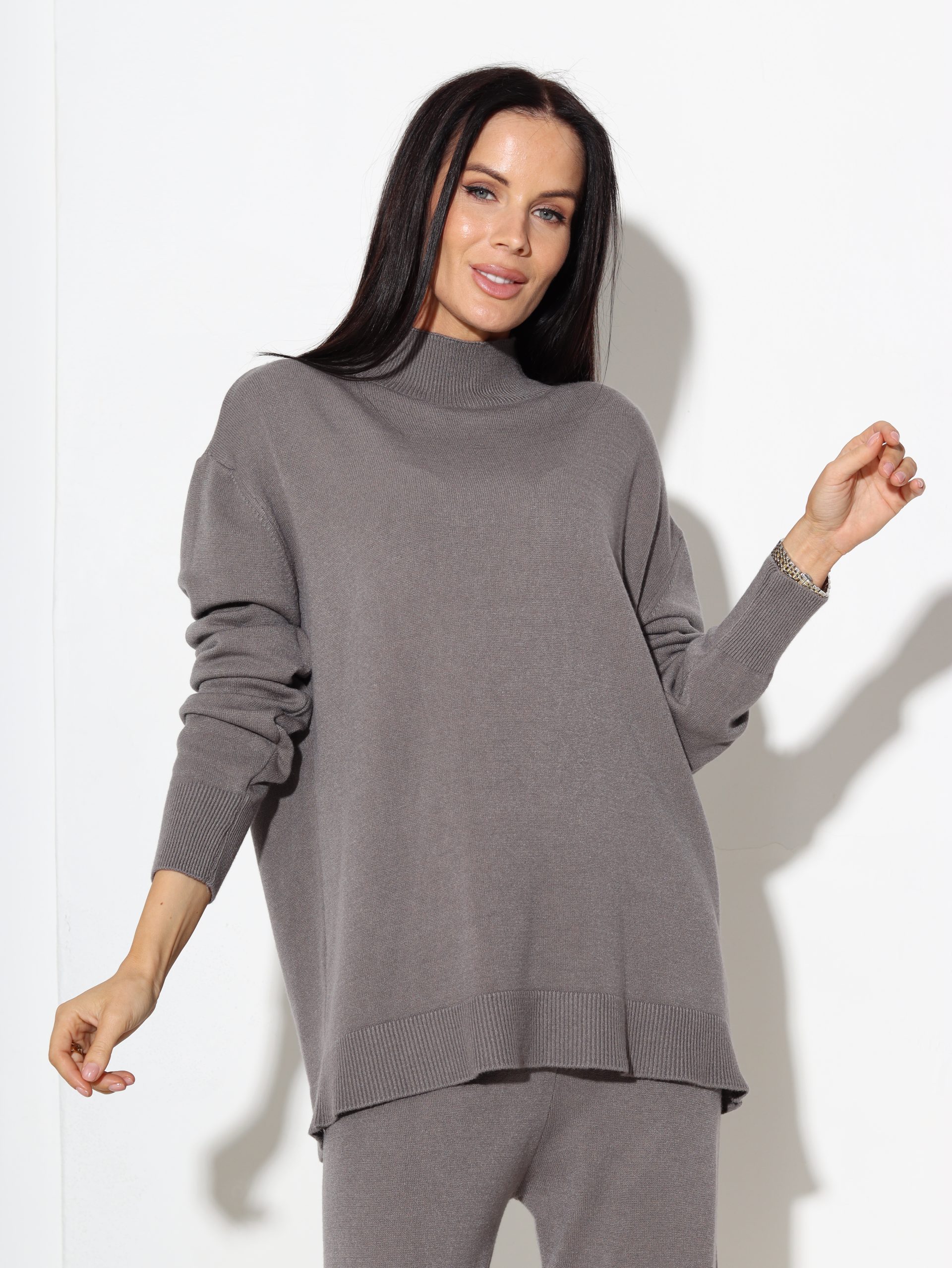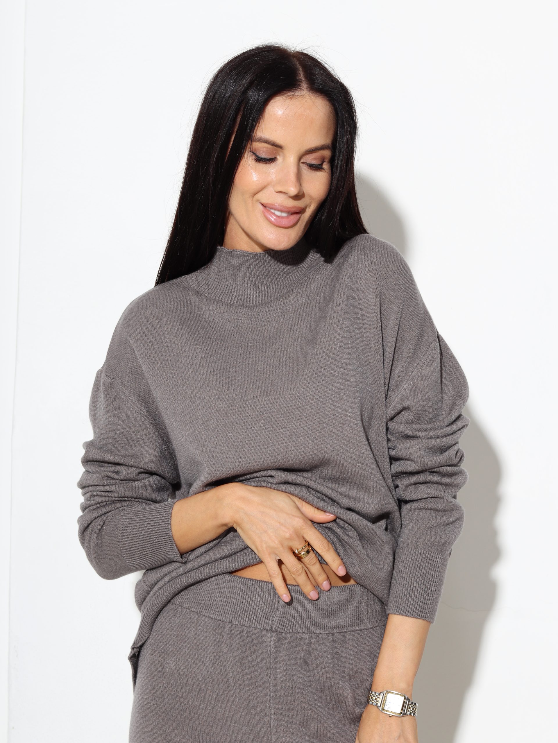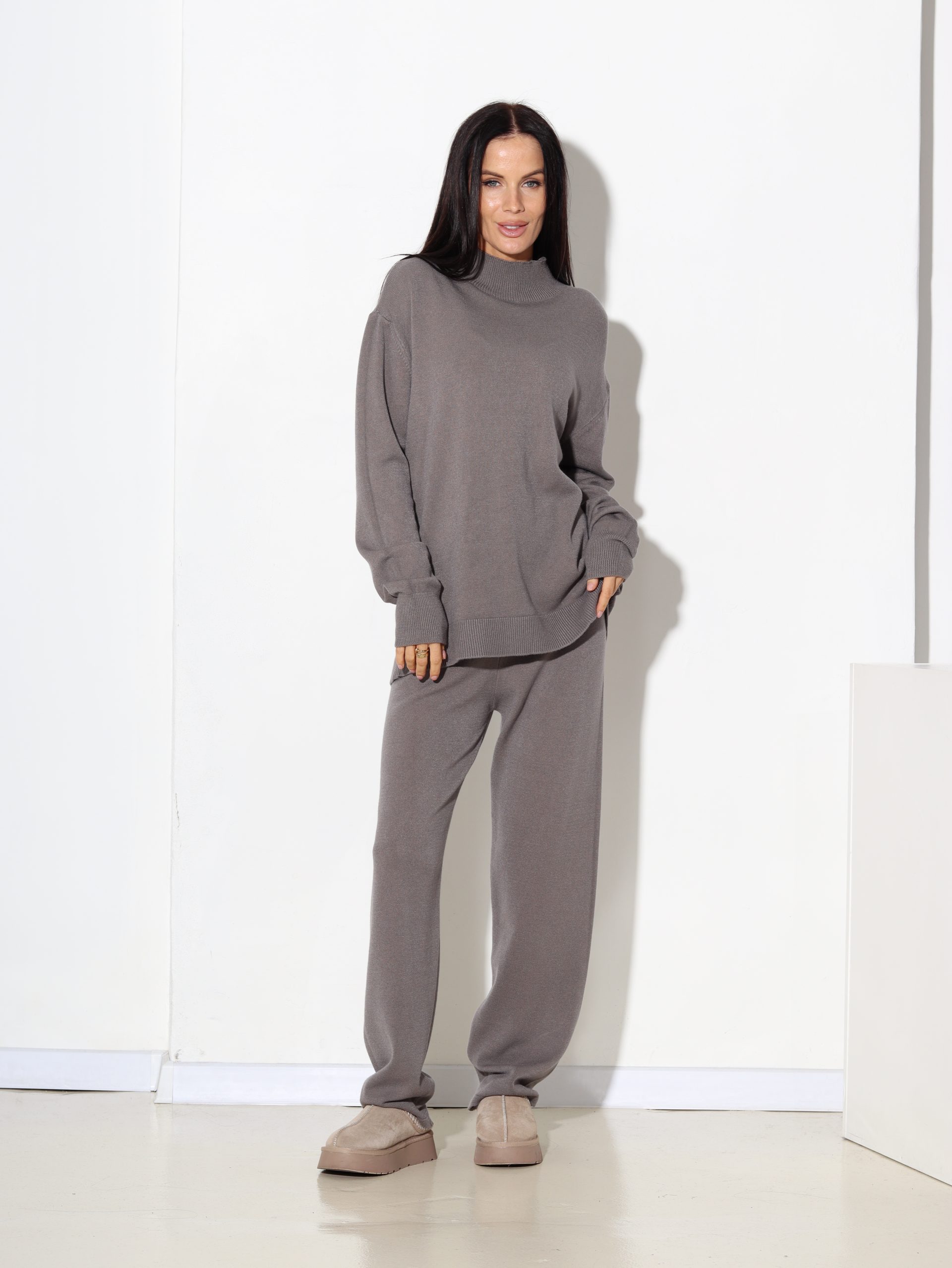 Blīva adījuma komplekts, kurā ietilpst džemperis un bikses. Džemperītim ir mini paaukstināta apkakle, brīvas piegrieznes modelis. Bikses paplatinātas, augšpusē ir iestrādāta gumija.