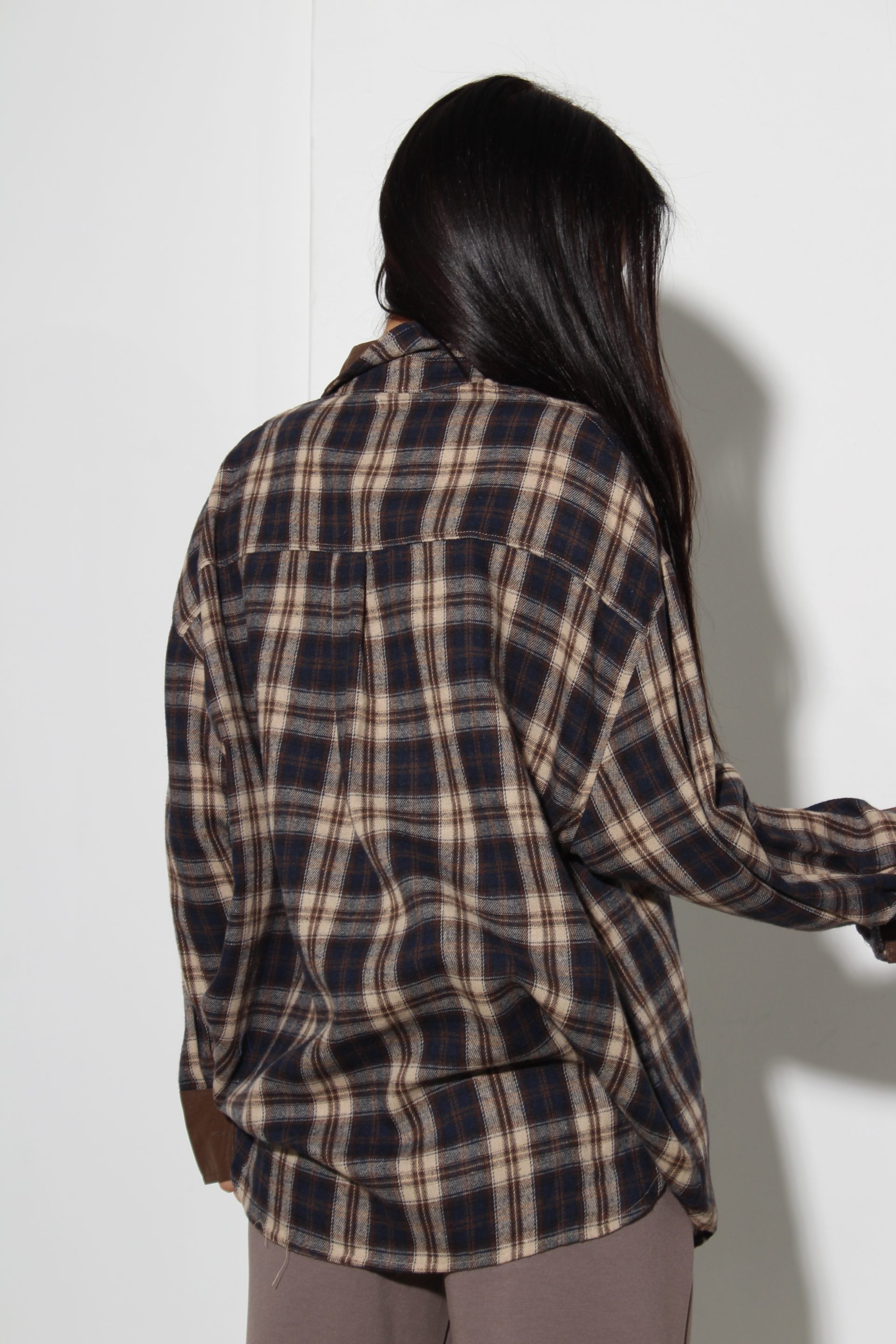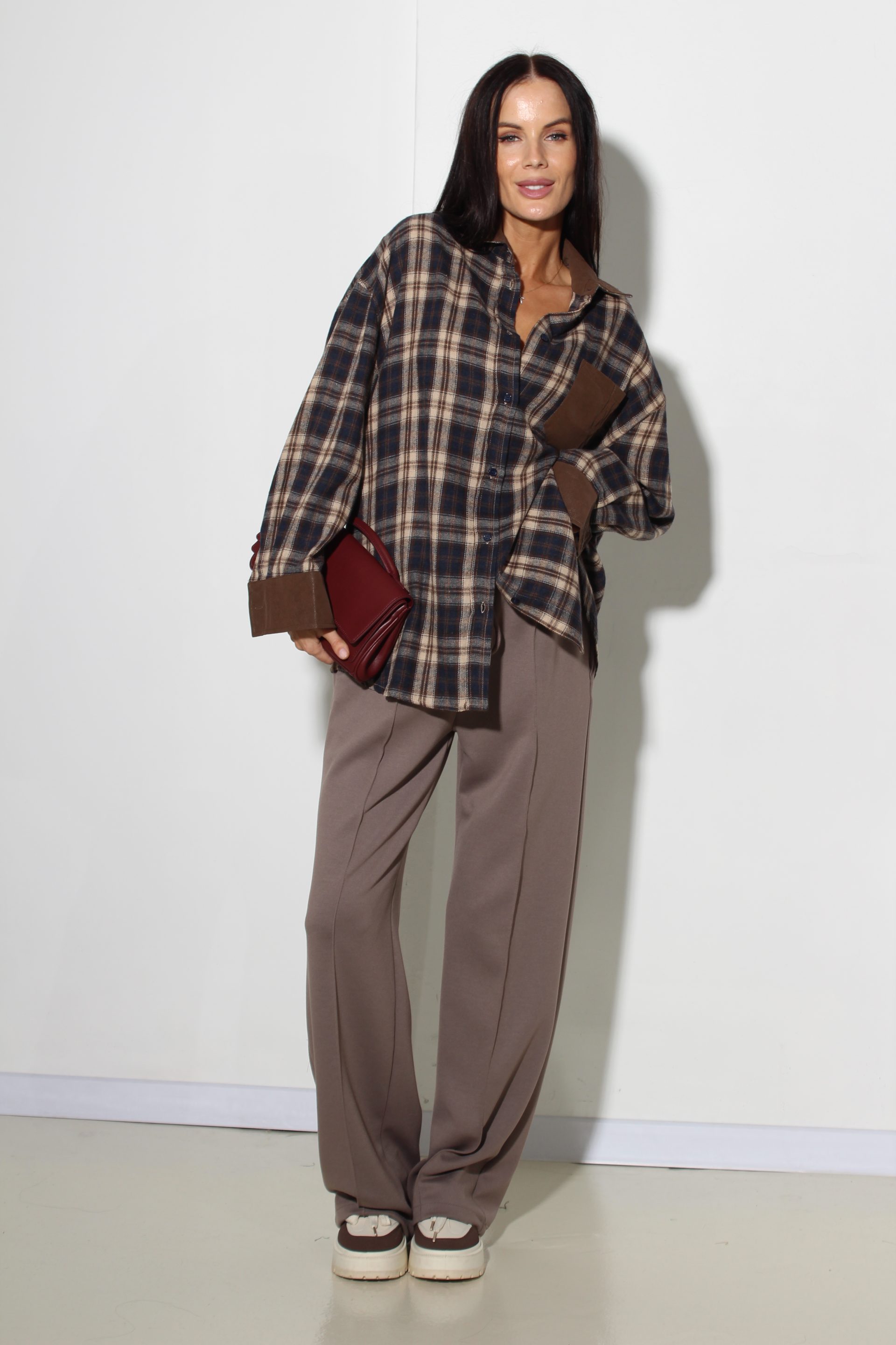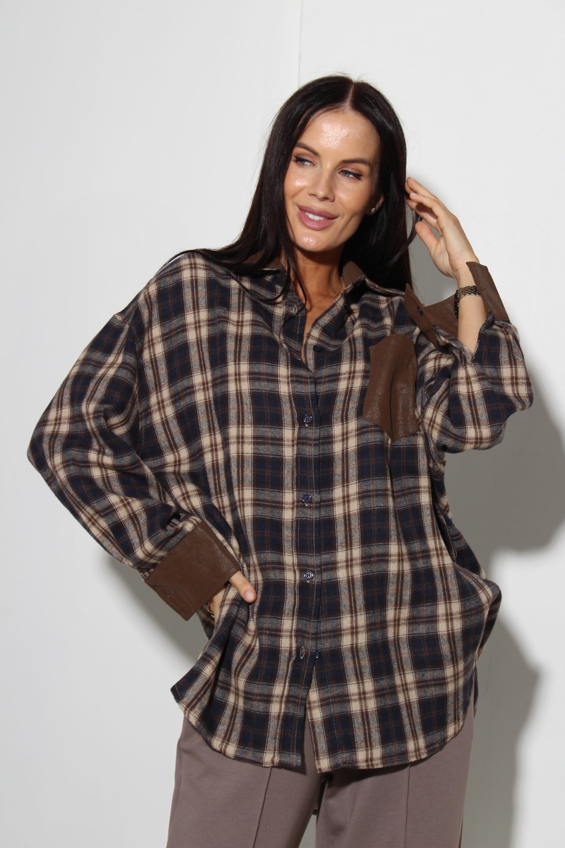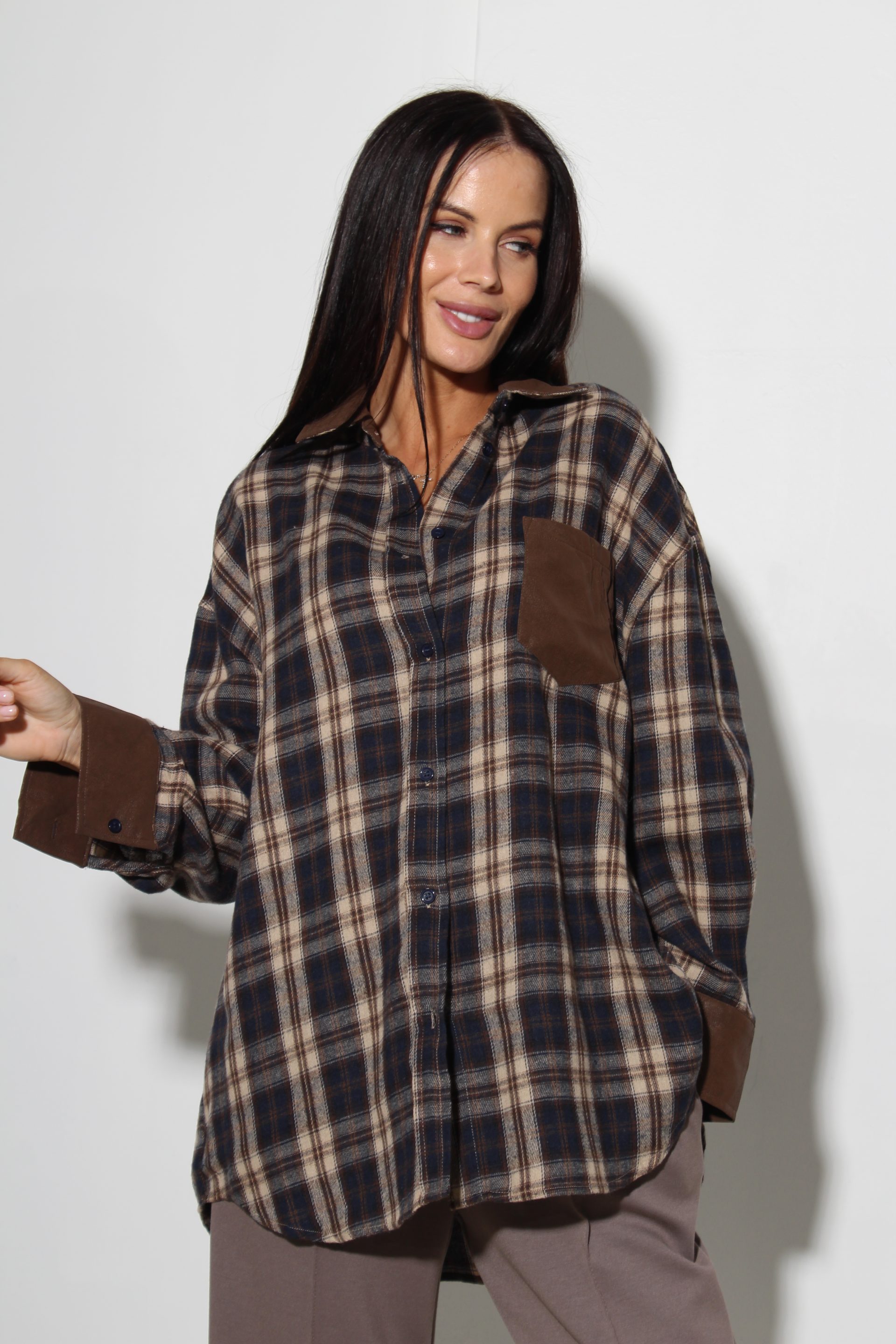 Rūtains krekls ar garām piedurknēm klasisku krāgu un brūnu dekoratīvu krāga atloku, delnas maliņu un krūšu kabatiņu.