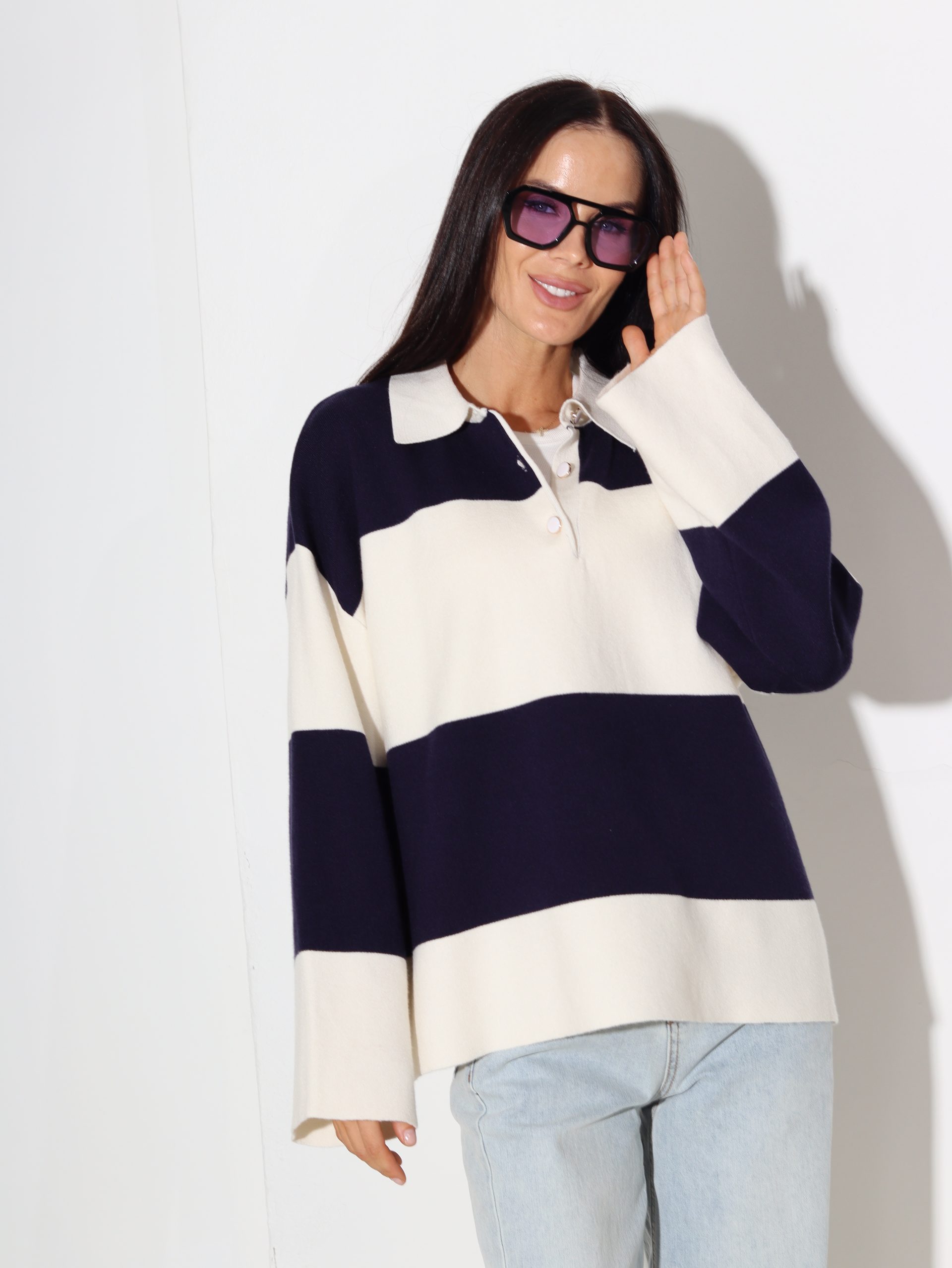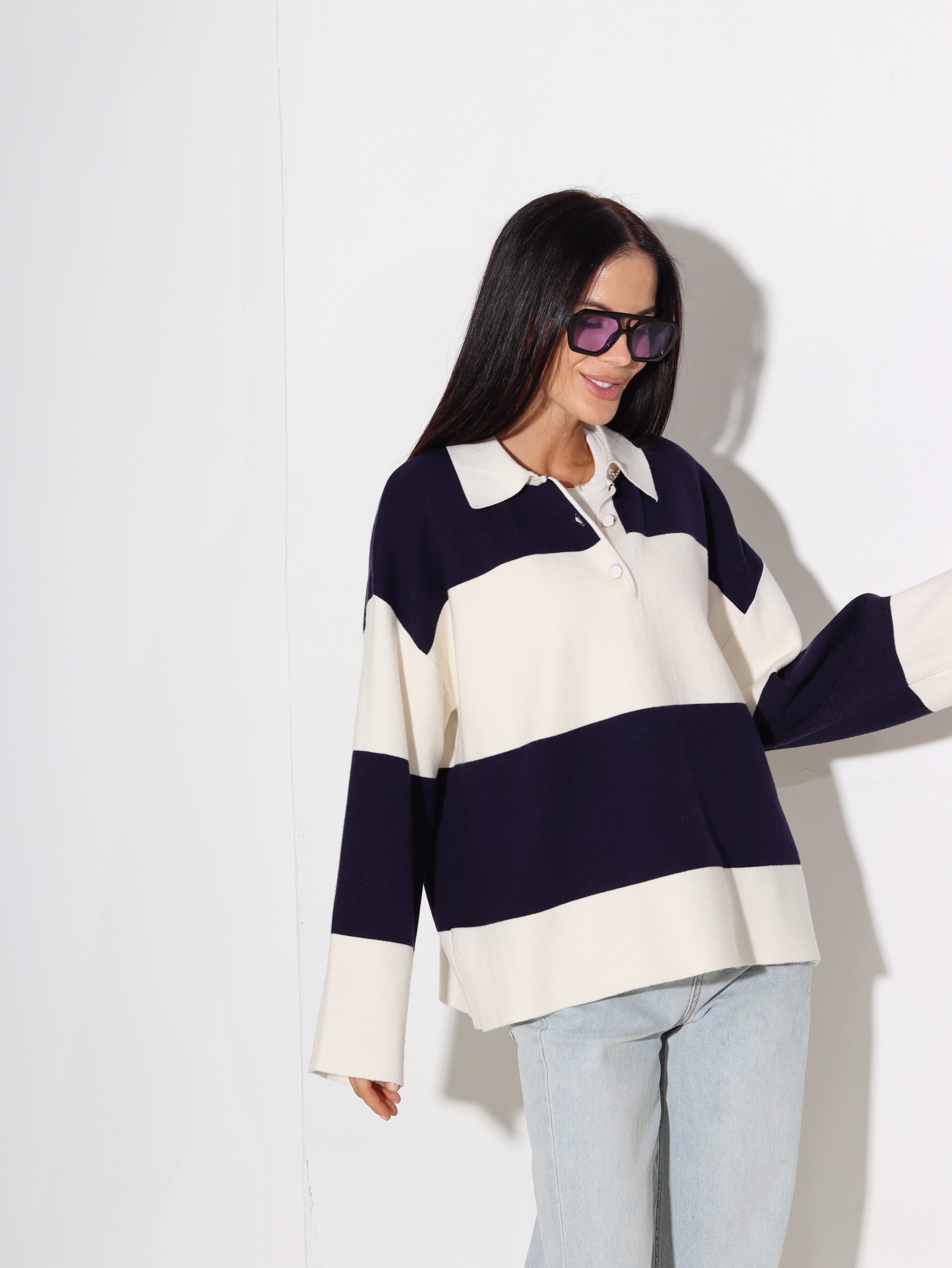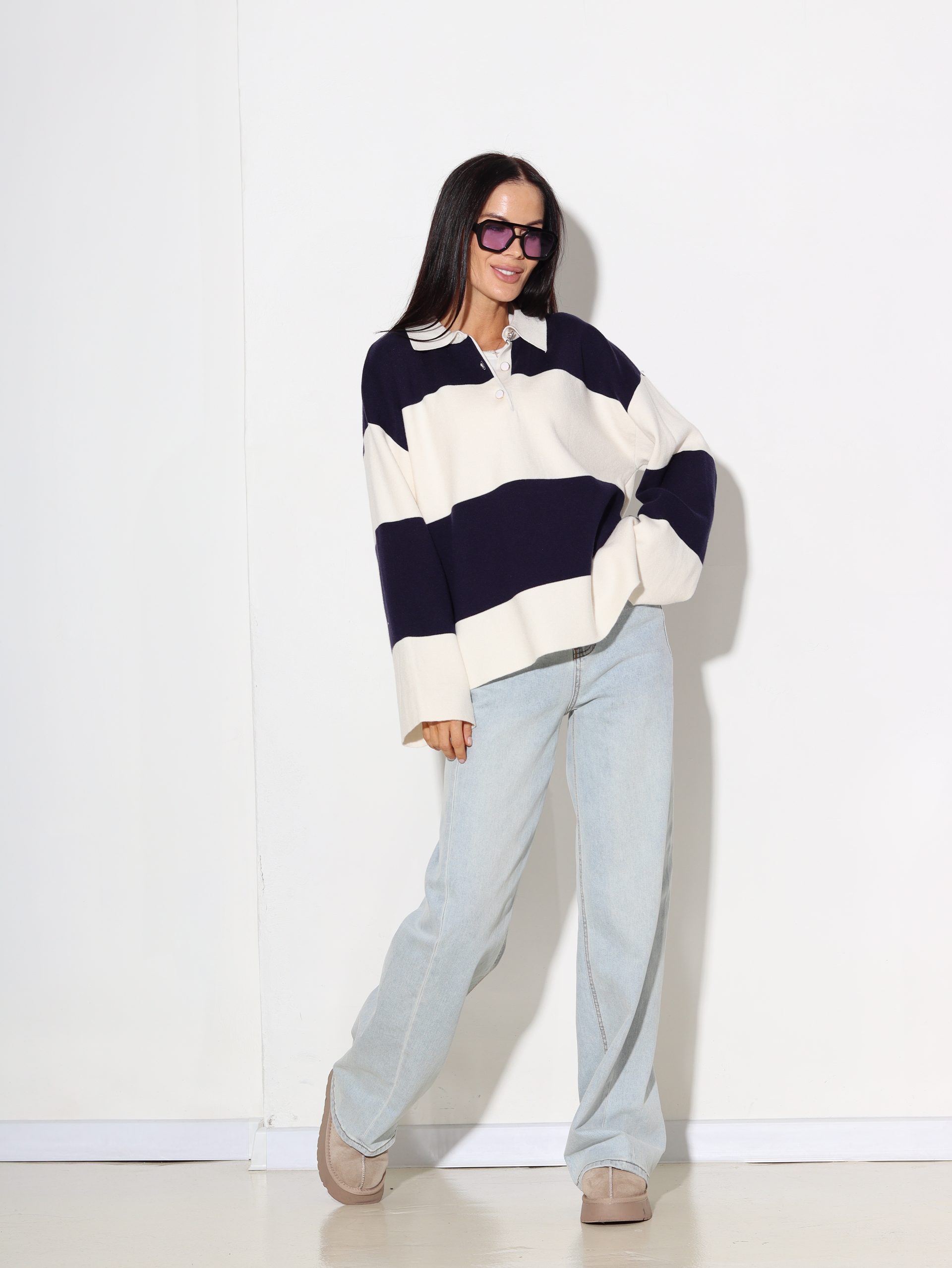 Brīva piegriezuma džemperis ar horizontālām strīpām un apkakli. Dekoltē  daļā ir iešūtas trīs atpogājamas pogas.