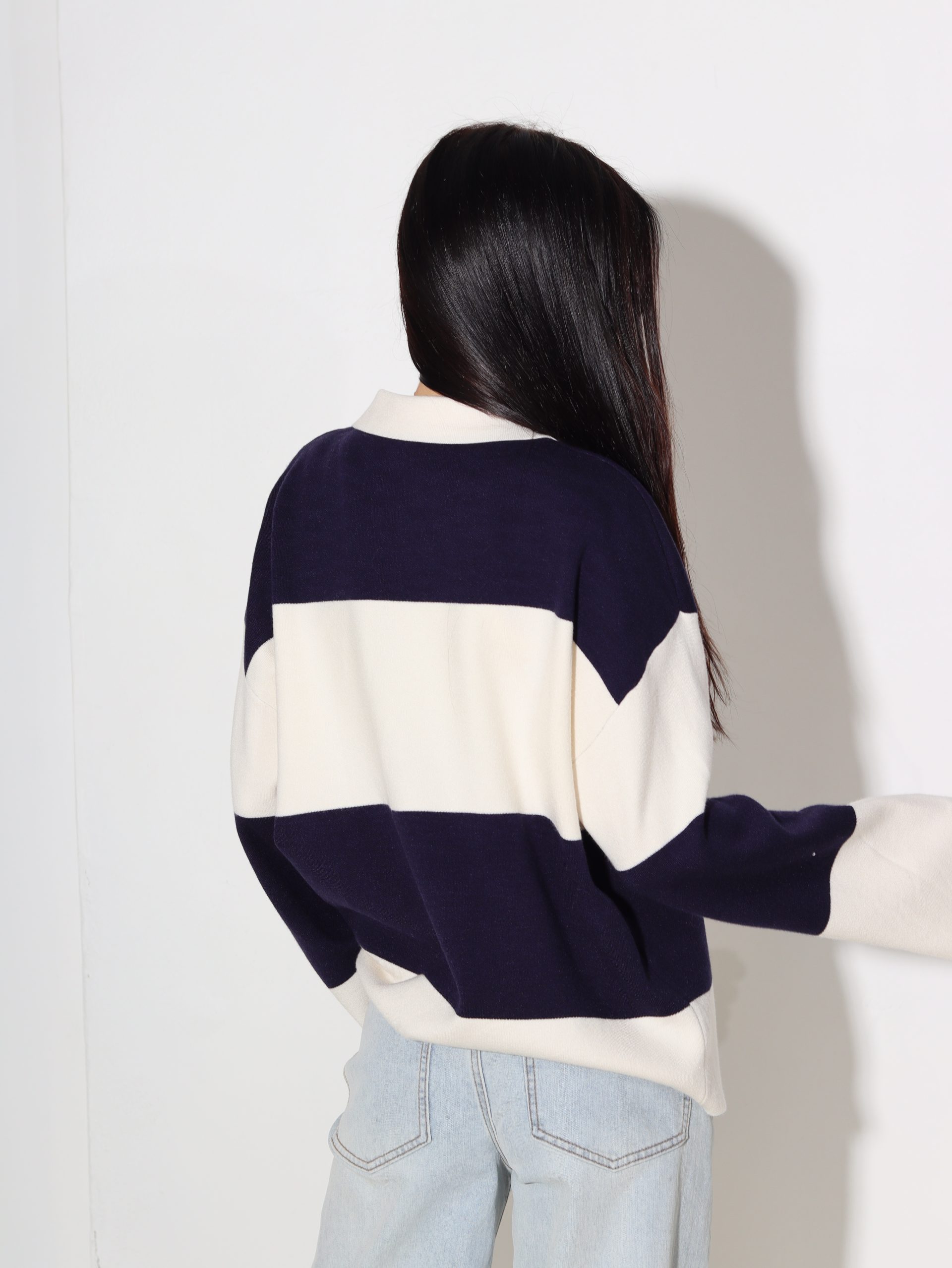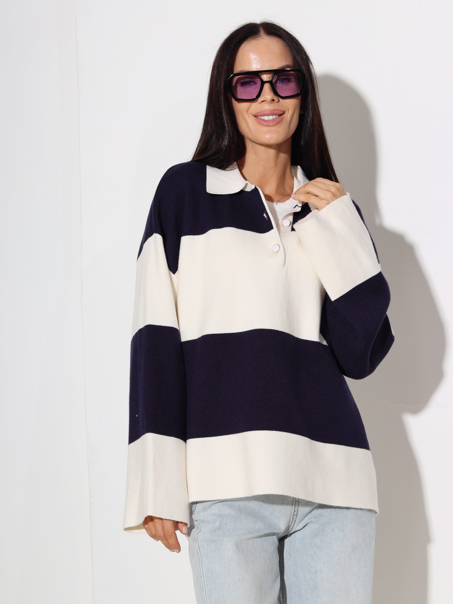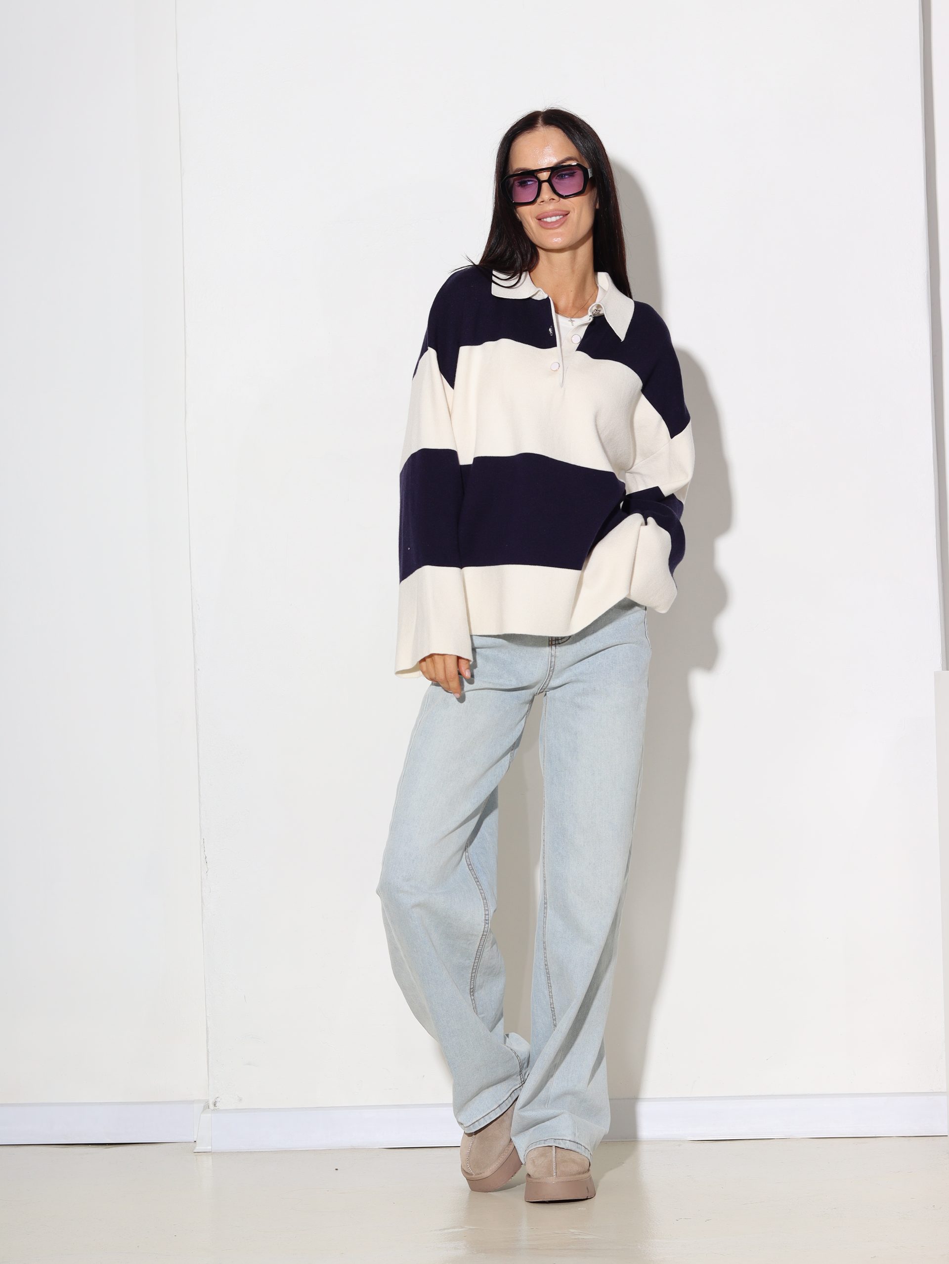 Brīva piegriezuma džemperis ar horizontālām strīpām un apkakli. Dekoltē  daļā ir iešūtas trīs atpogājamas pogas.