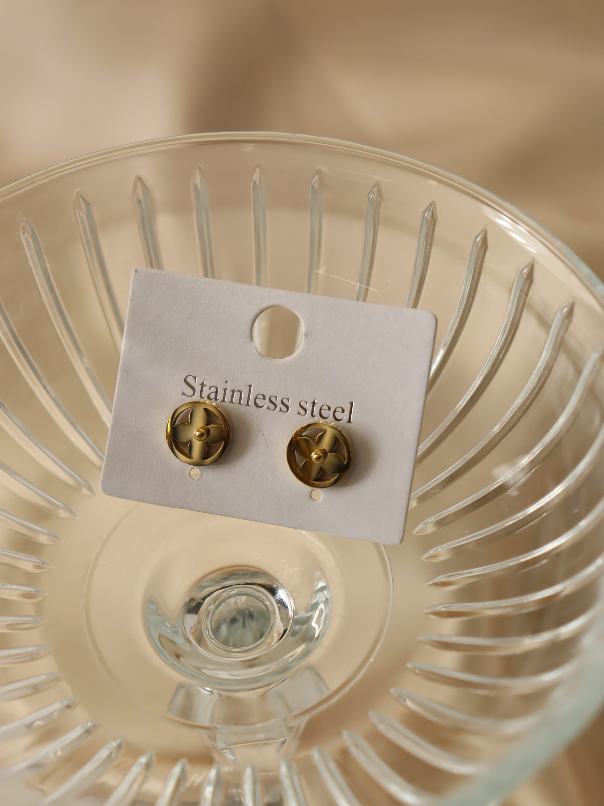 Zelta krāsas, apaļās formas auskari ar vidusdaļā iestrādātu ziedu.