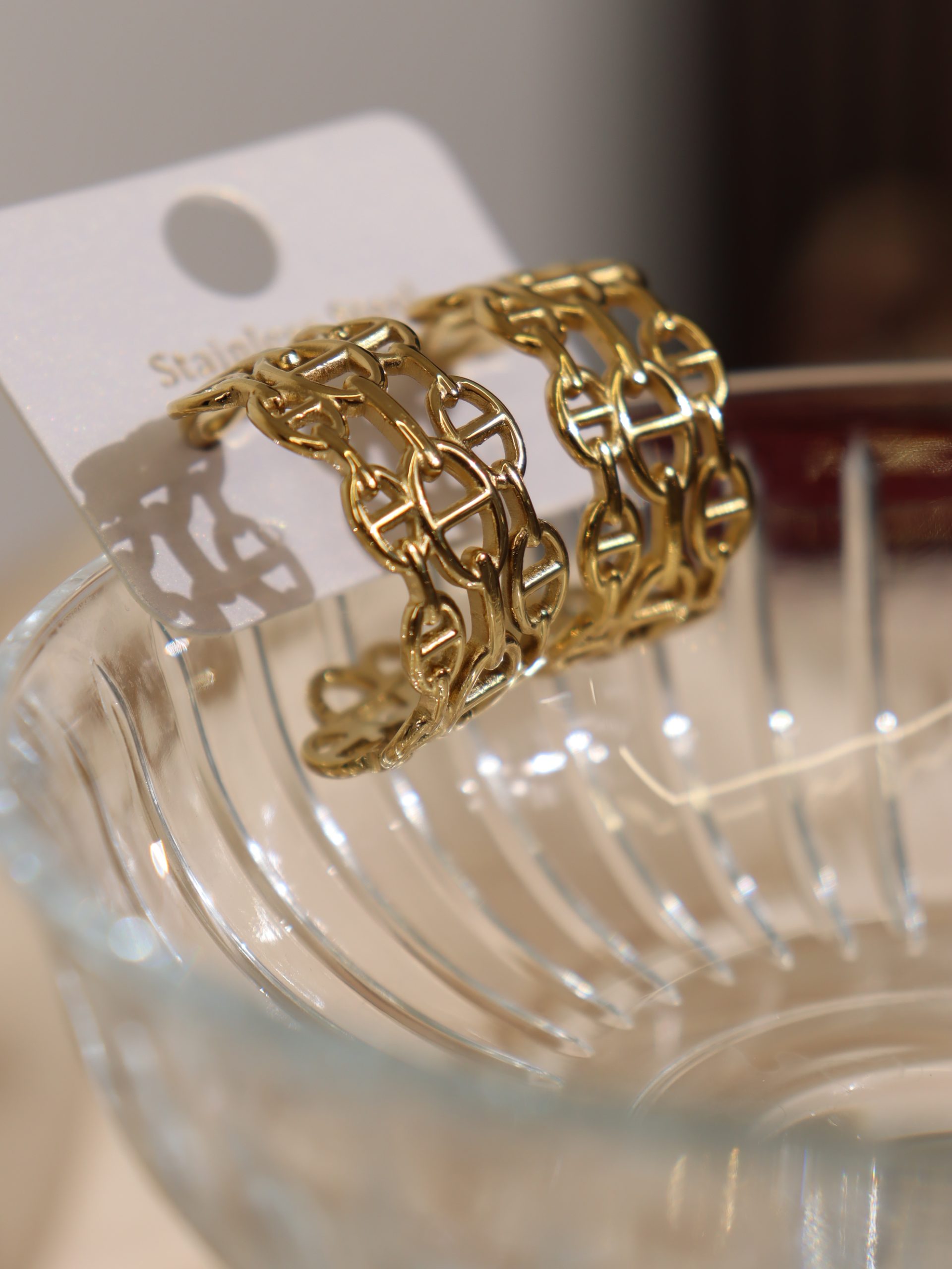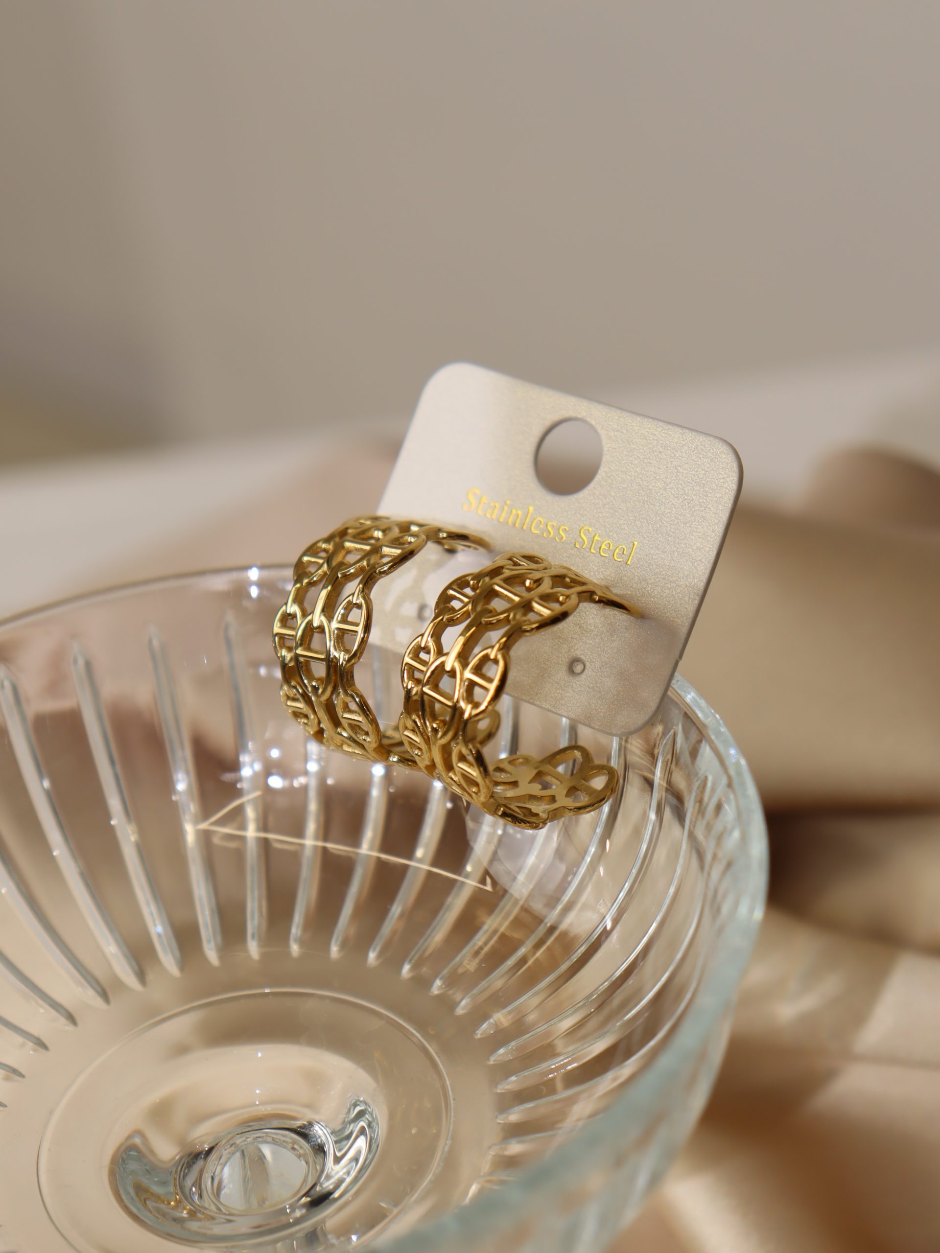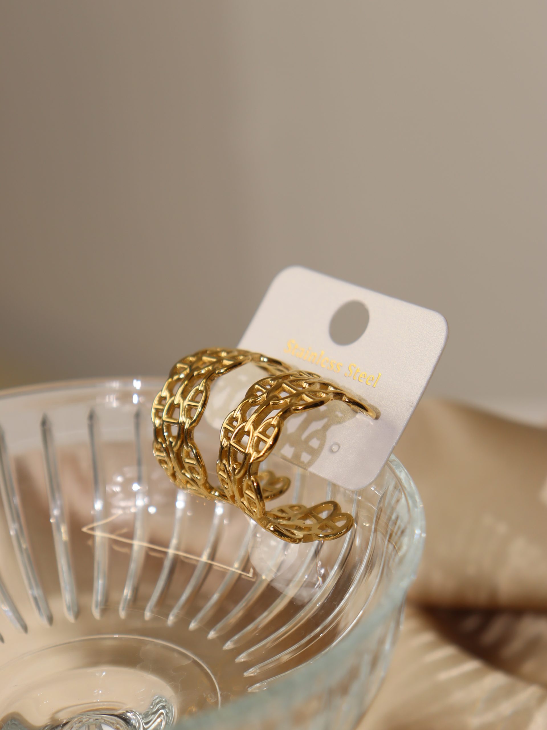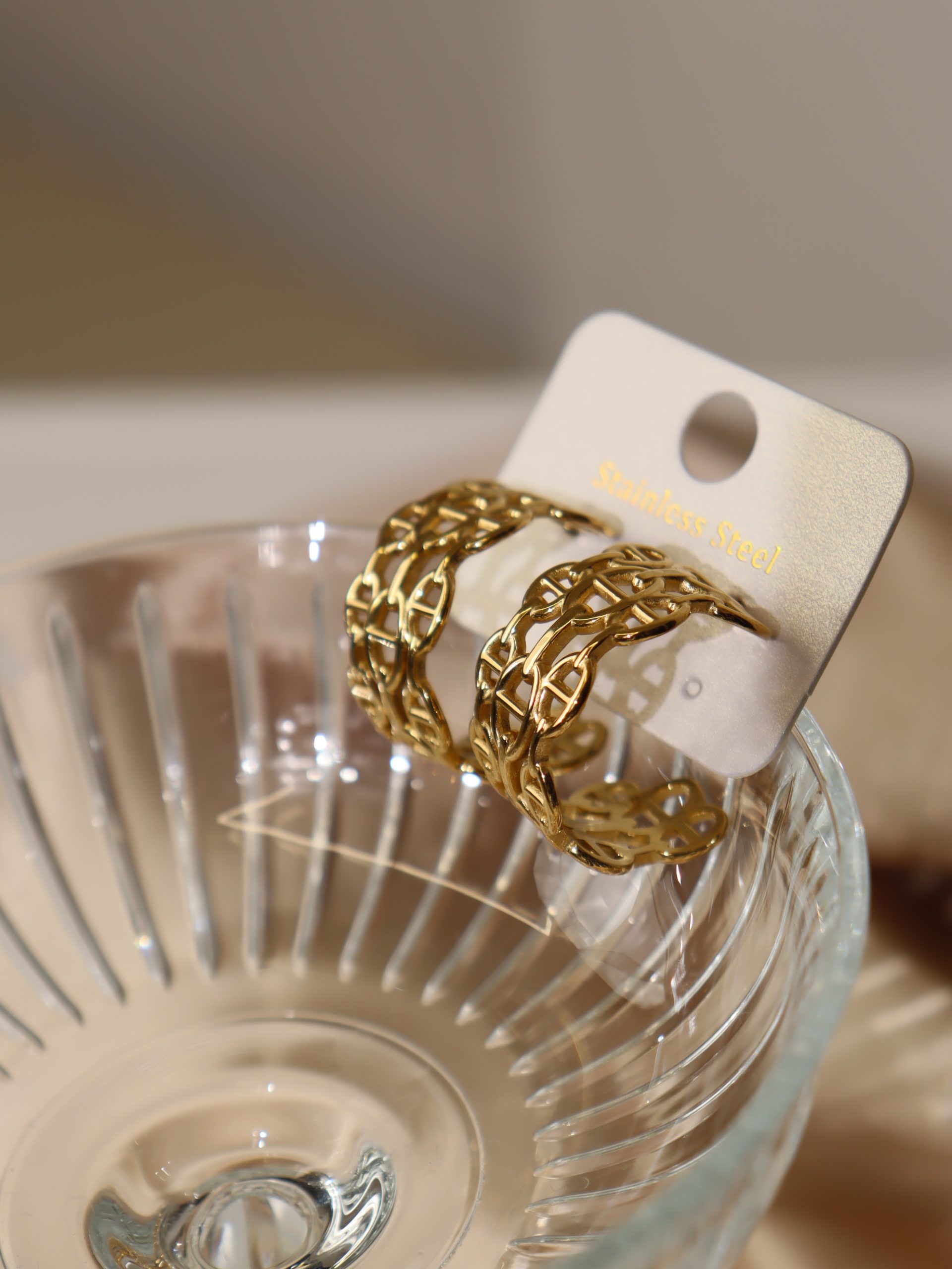 Zelta krāsas, stilizēta raksta, izteiksmīgi auskari pusapļa formā.