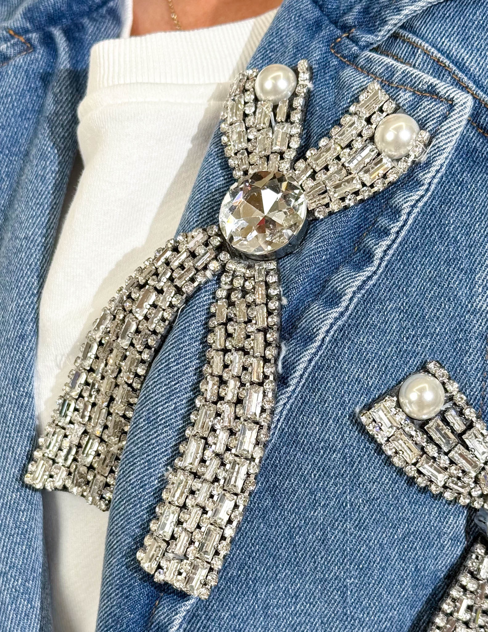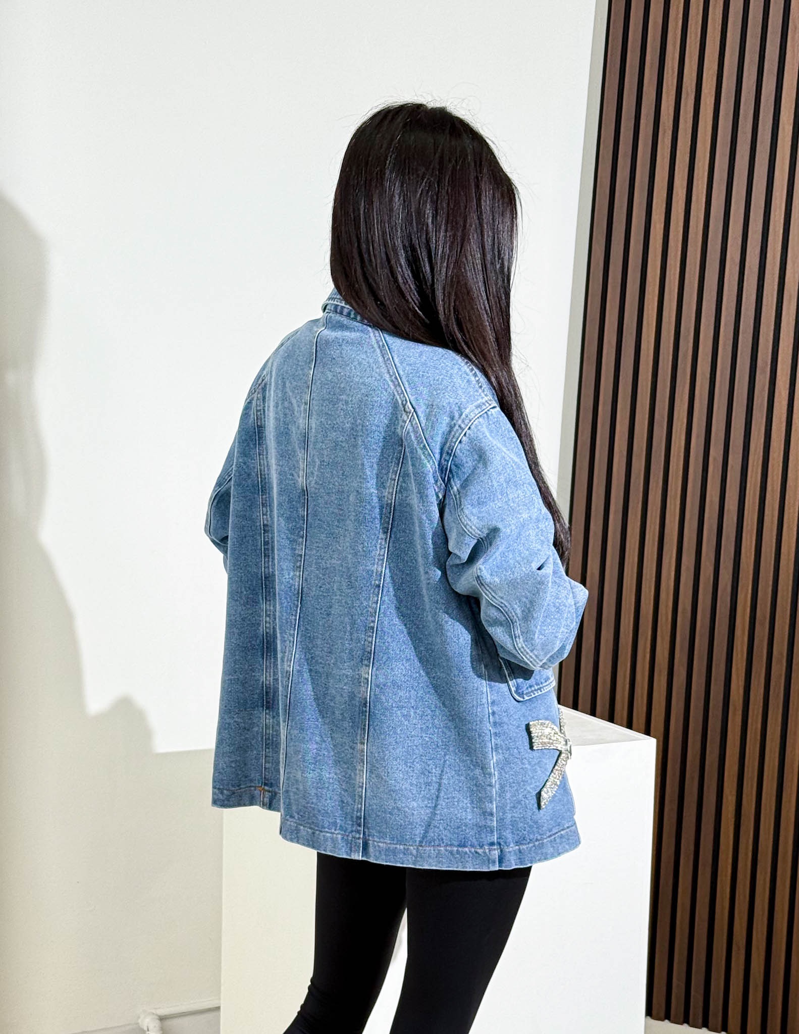 Zilas krāsas džinsa žakete/ jaka ar garām piedurknēm , priekšpusē divas kabatas un aizdare uz vienas pogas. Jakas priekšpusē uzšūtas dekoratīvas bantes no akmentiņiem.