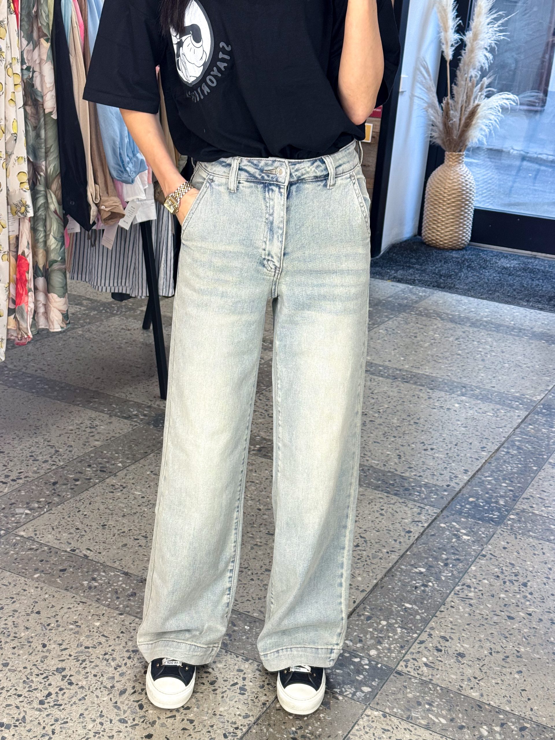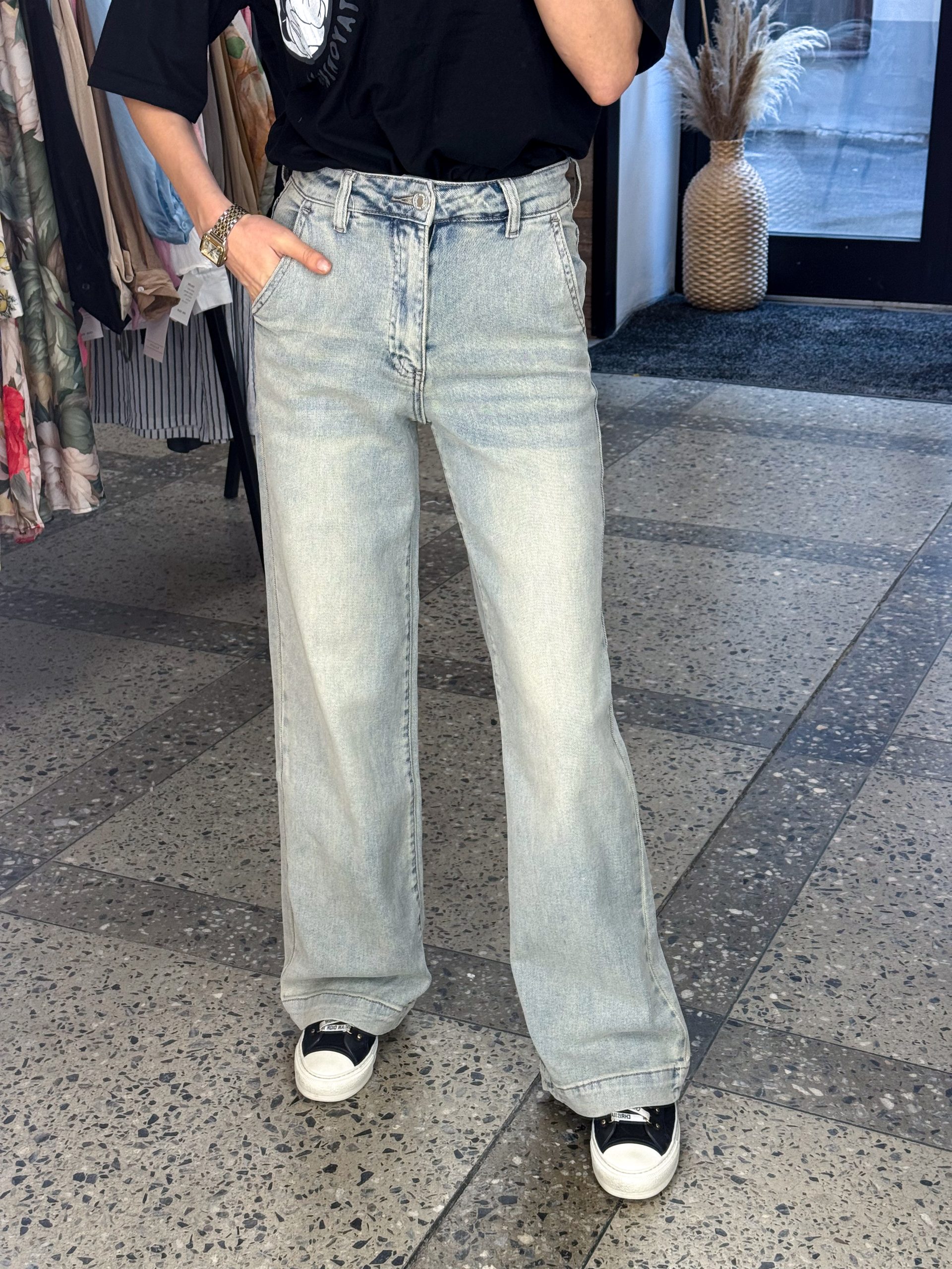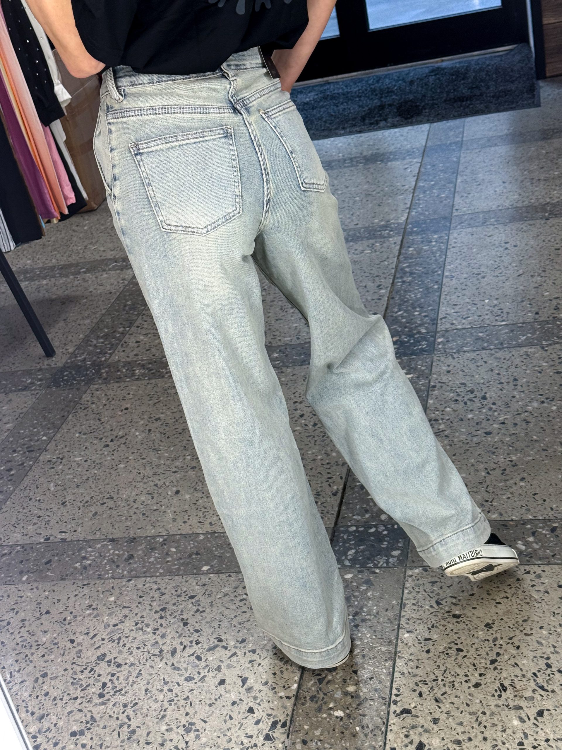 Zilganbēšas džinsa bikses ,, Dad fit” , biksēm ir augsta jostas vieta , kabatas un paplatināti bikšu gali .