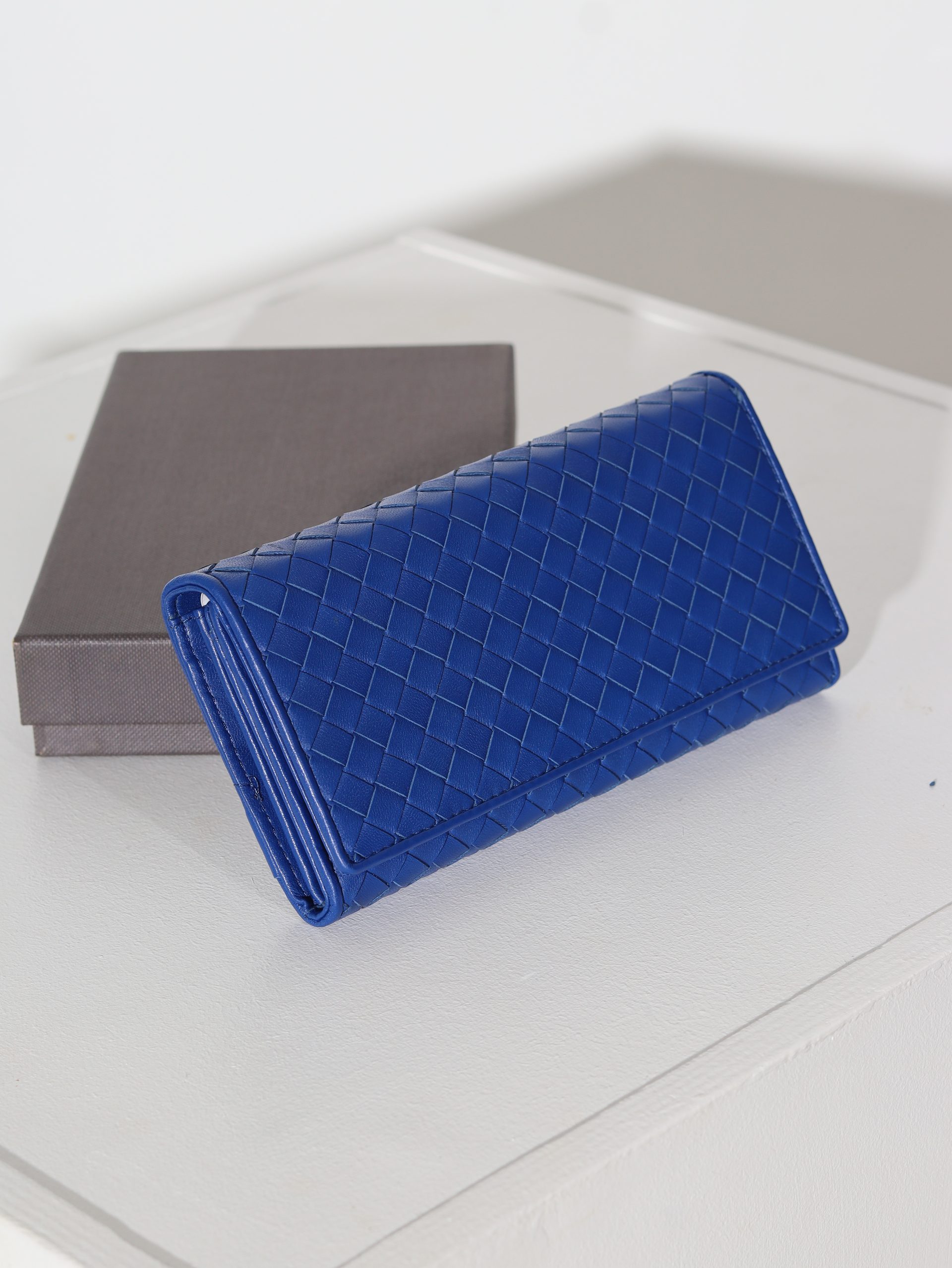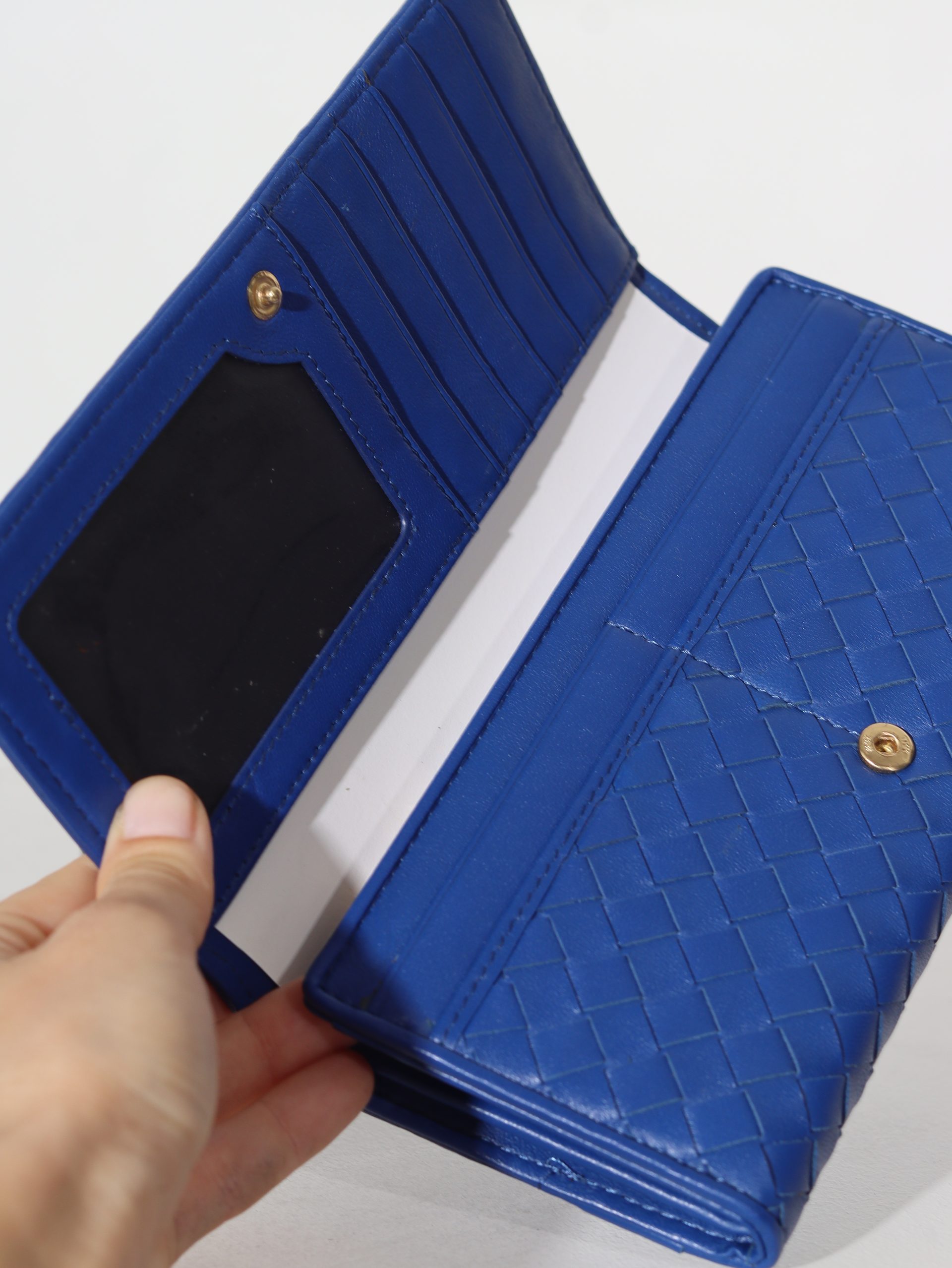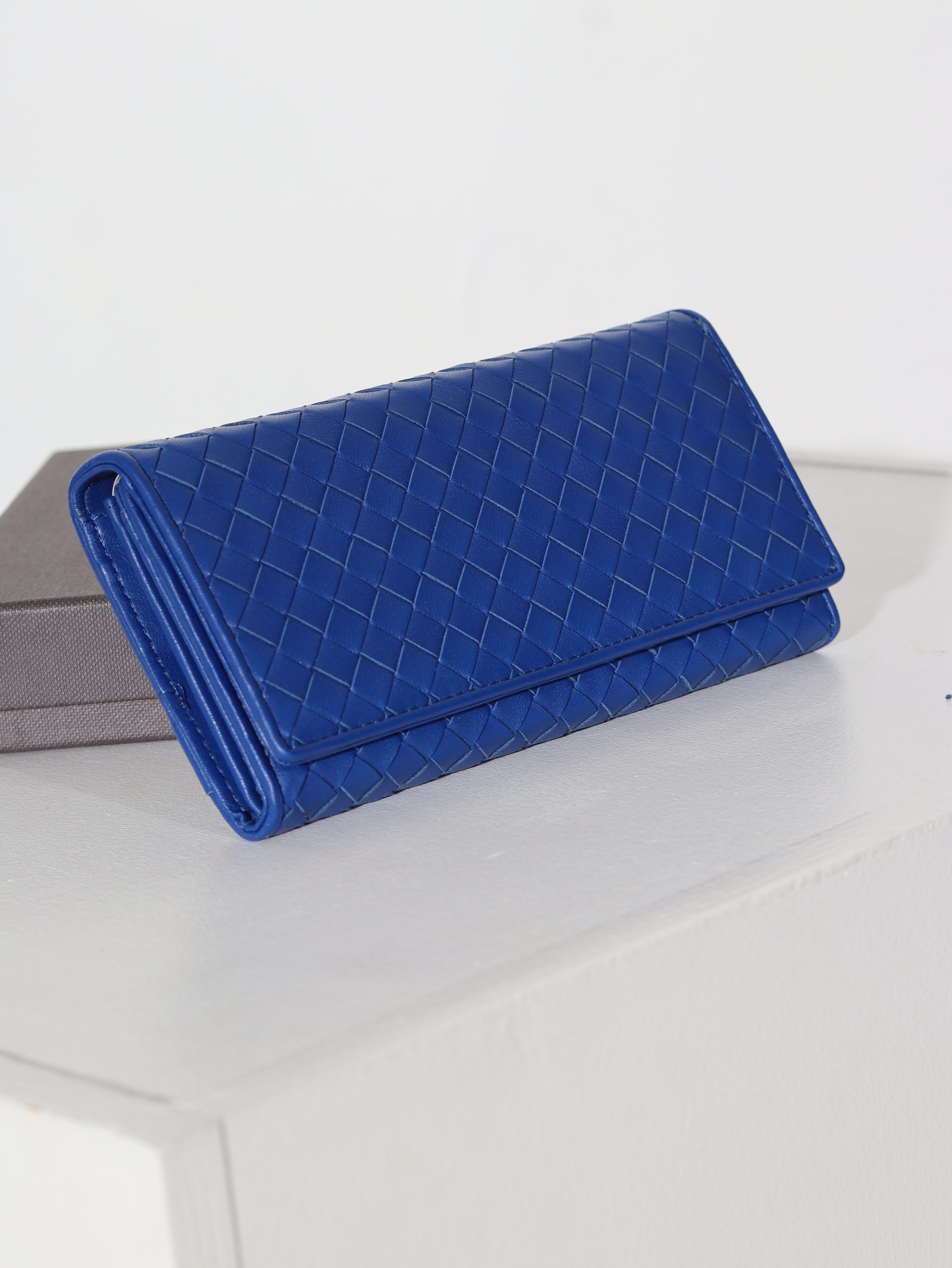 Dabīgās ādas maks ar spiedpogas aizdari. Makam ir pinuma dizains.